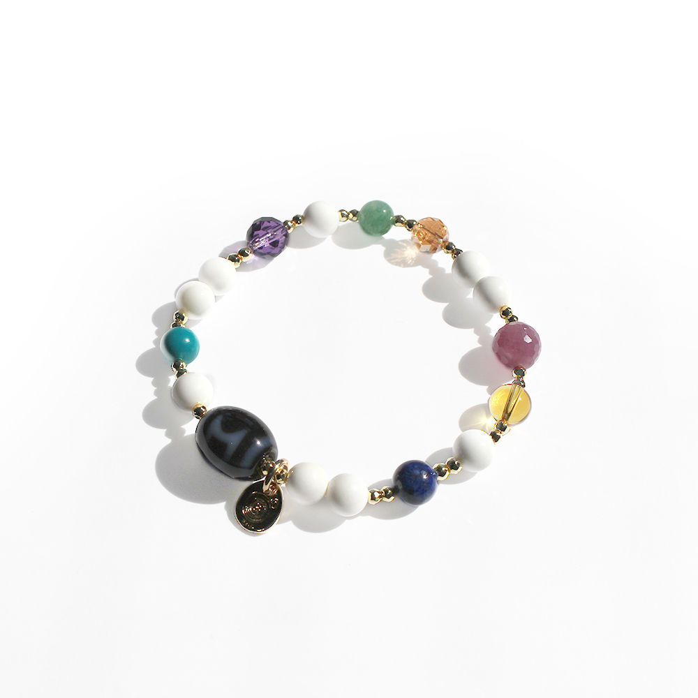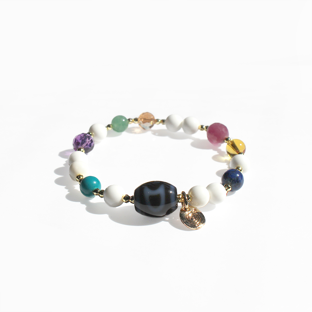 文様の太陽と月は、陽(男性)と陰(女性)の究極の対比を表し、恋愛成就・運勢も大上昇するといわれている日月天珠に、ホワイトオニキスなどを組み合わせたブレスレットです。