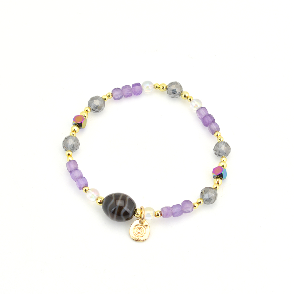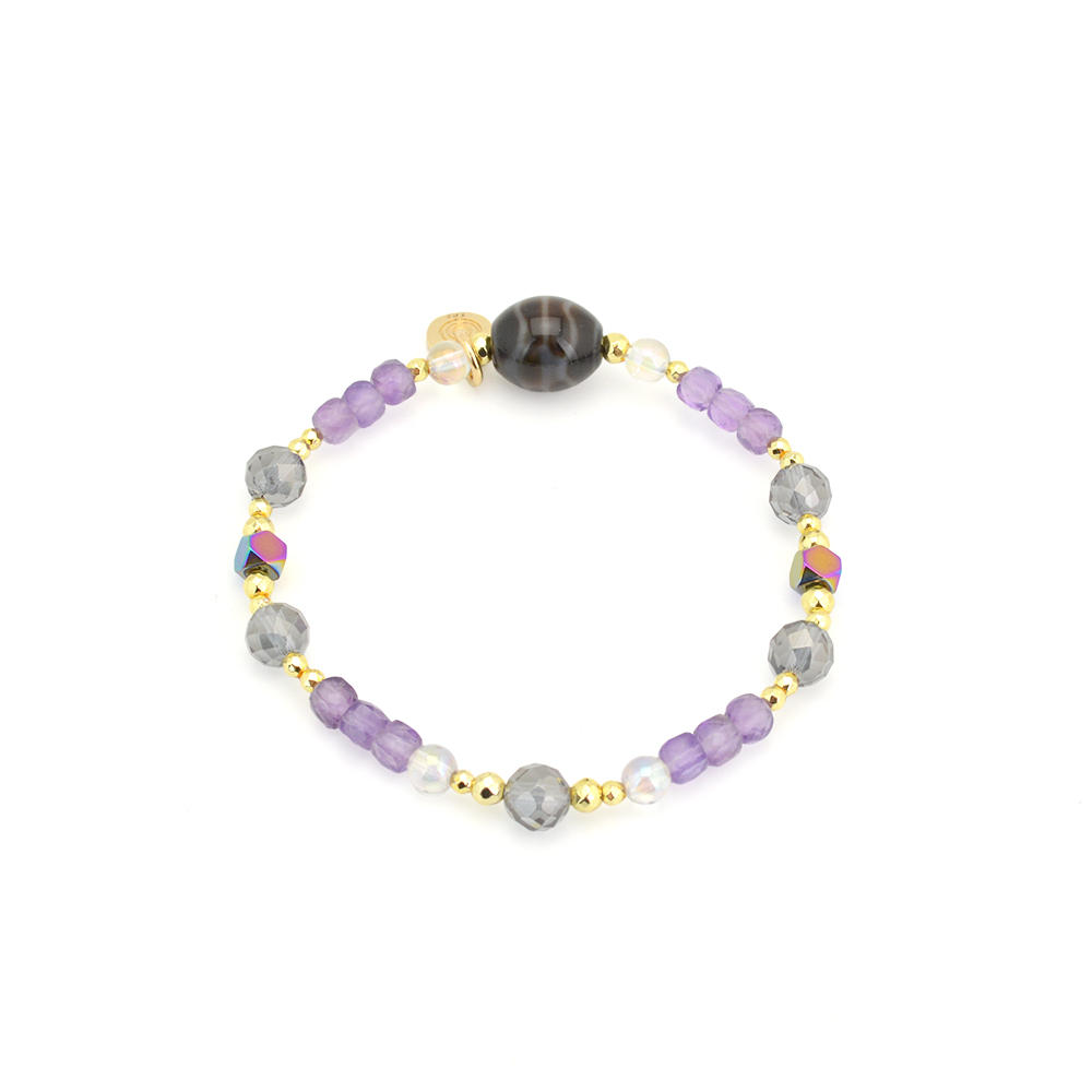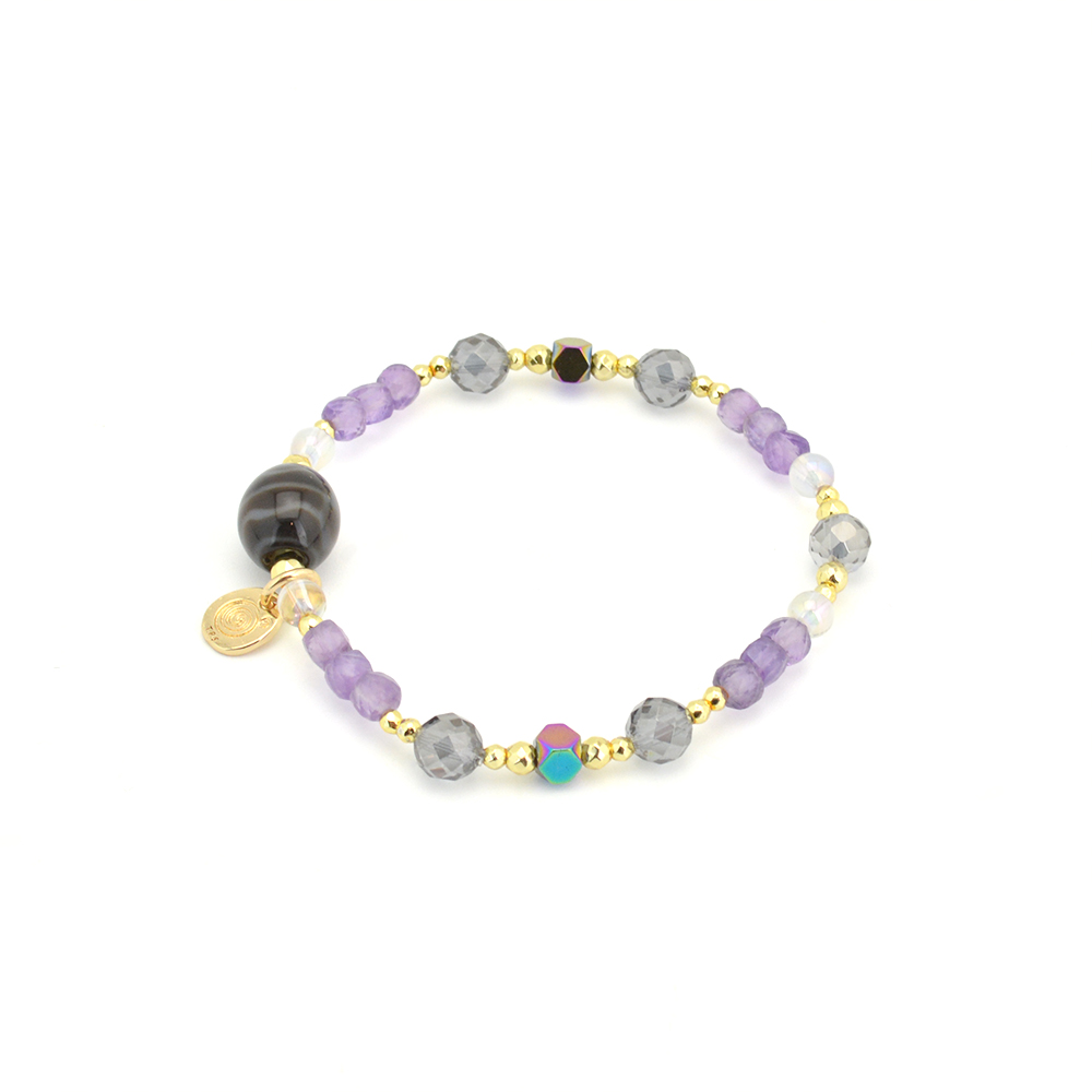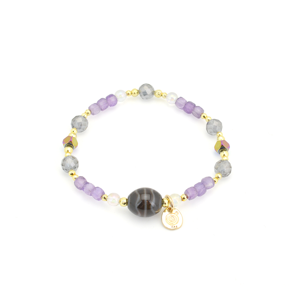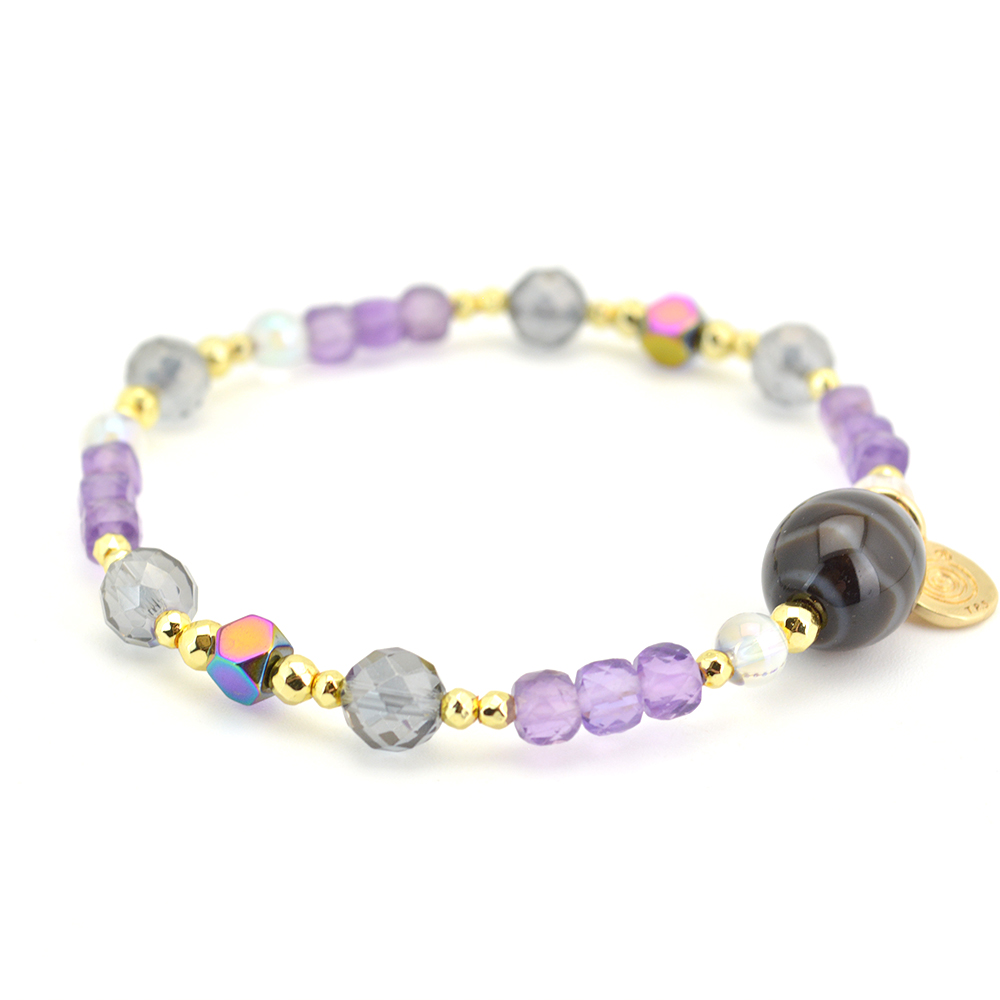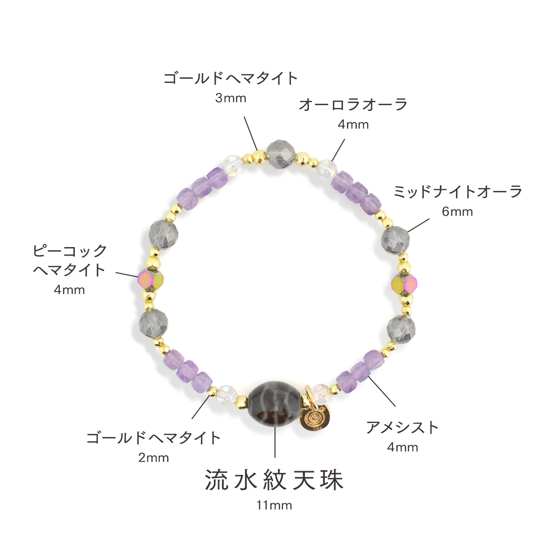 水の流れの如く物事を順調に運ぶとされ、浄化力に優れ、災いの根を浄化するといわれている流水紋天珠に、恋愛成就、魅力・才能を引き出すとされるアメシストなどを組み合わせたブレスレットです。