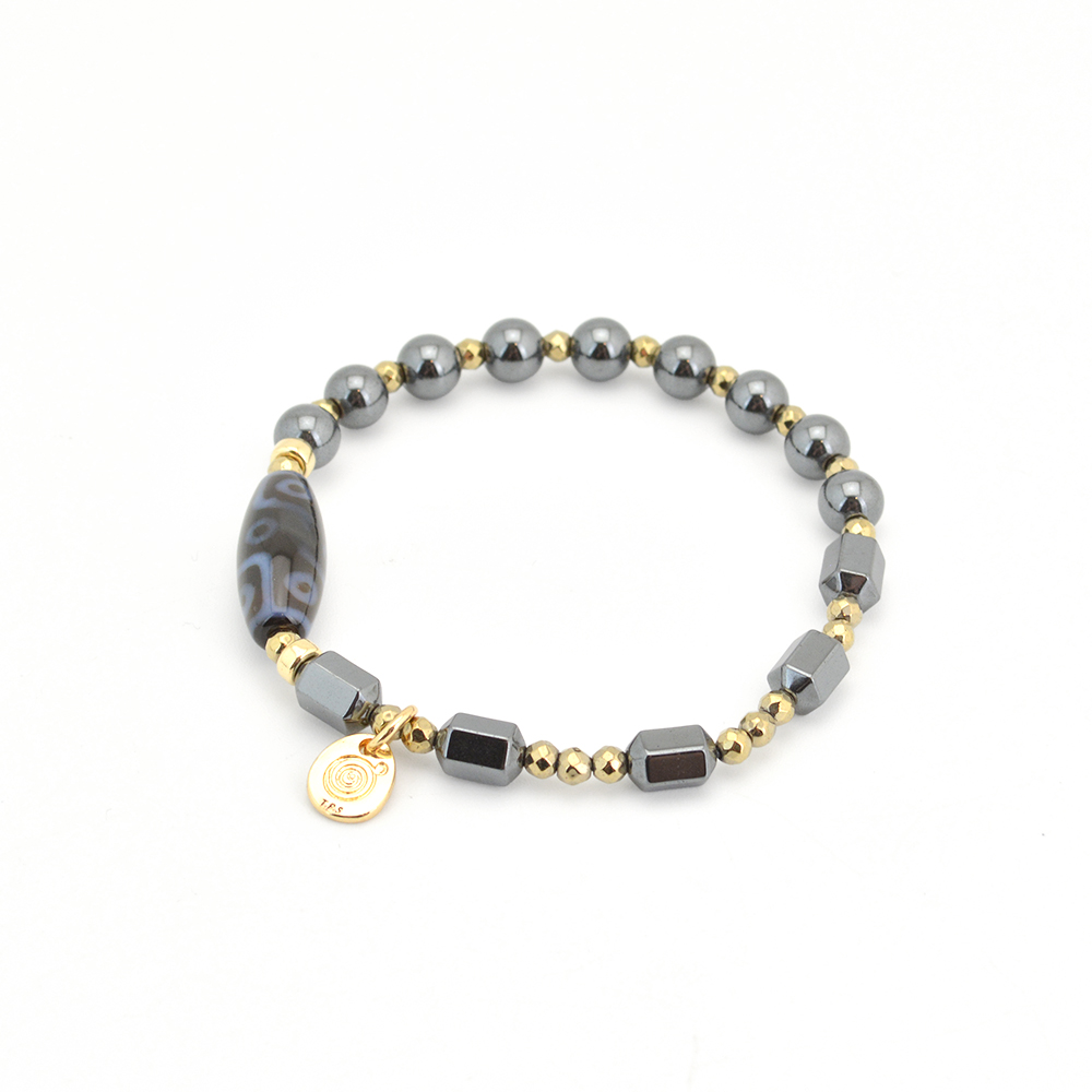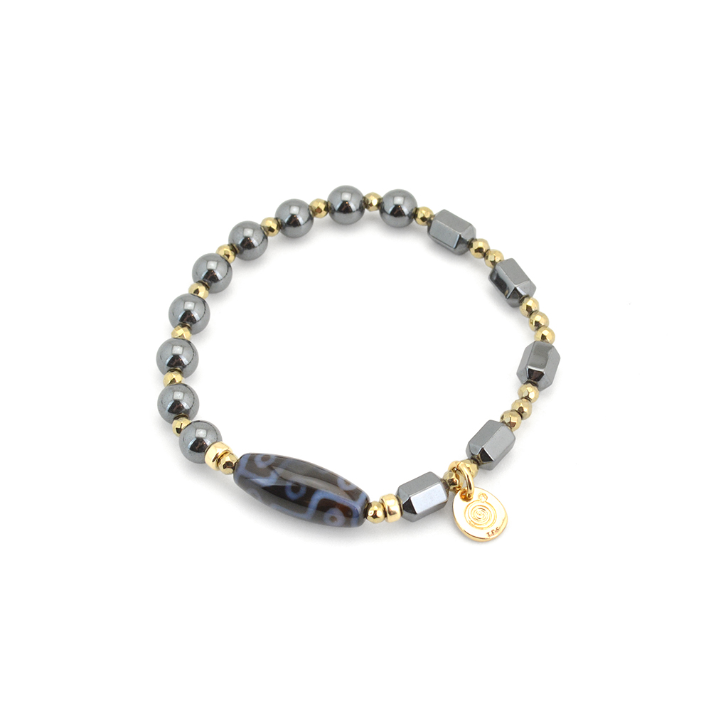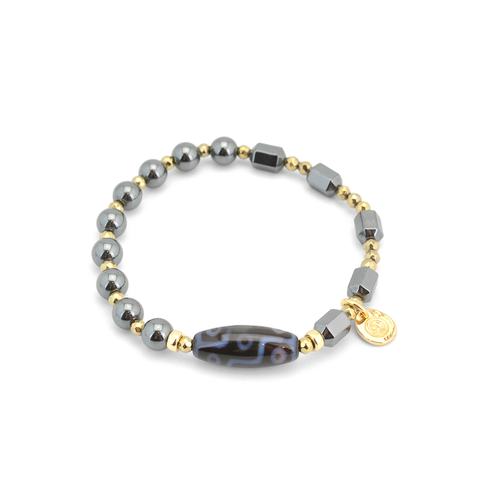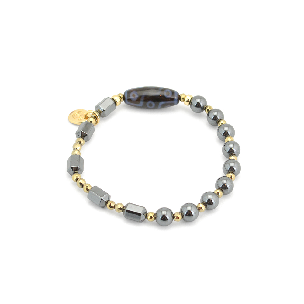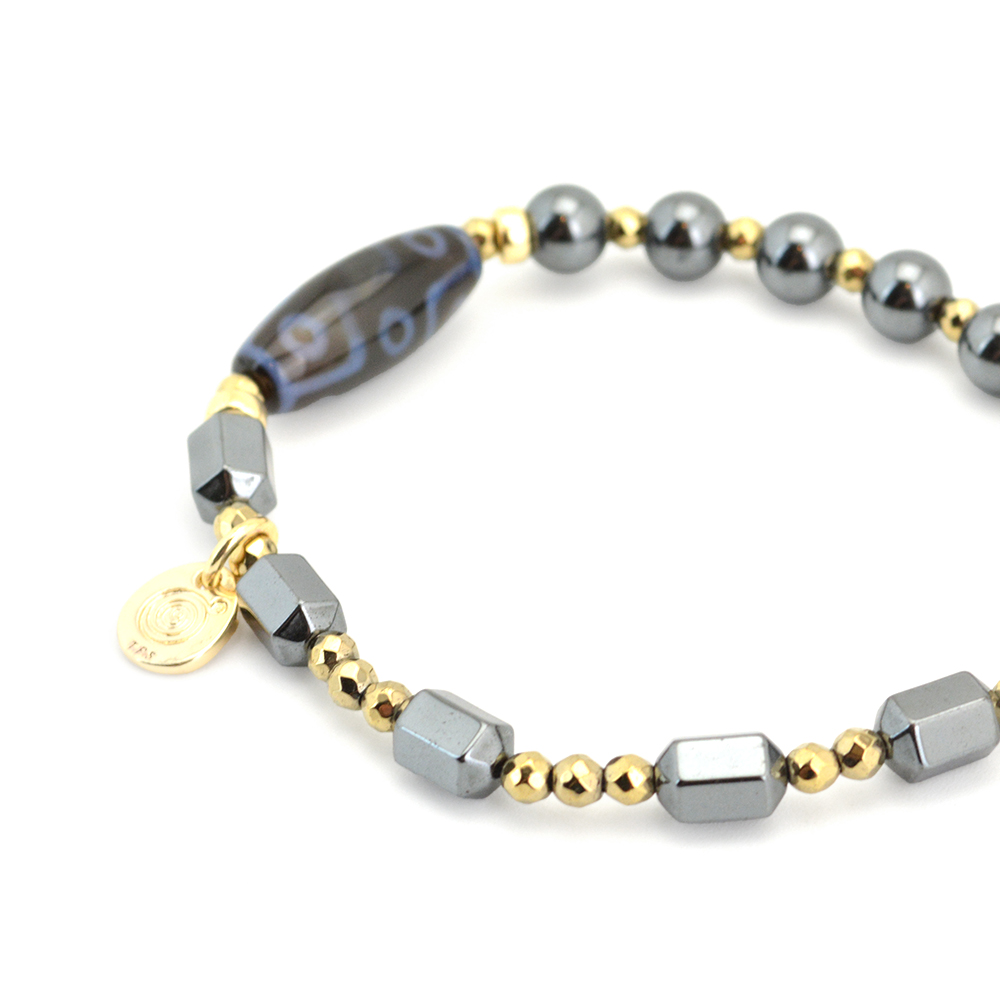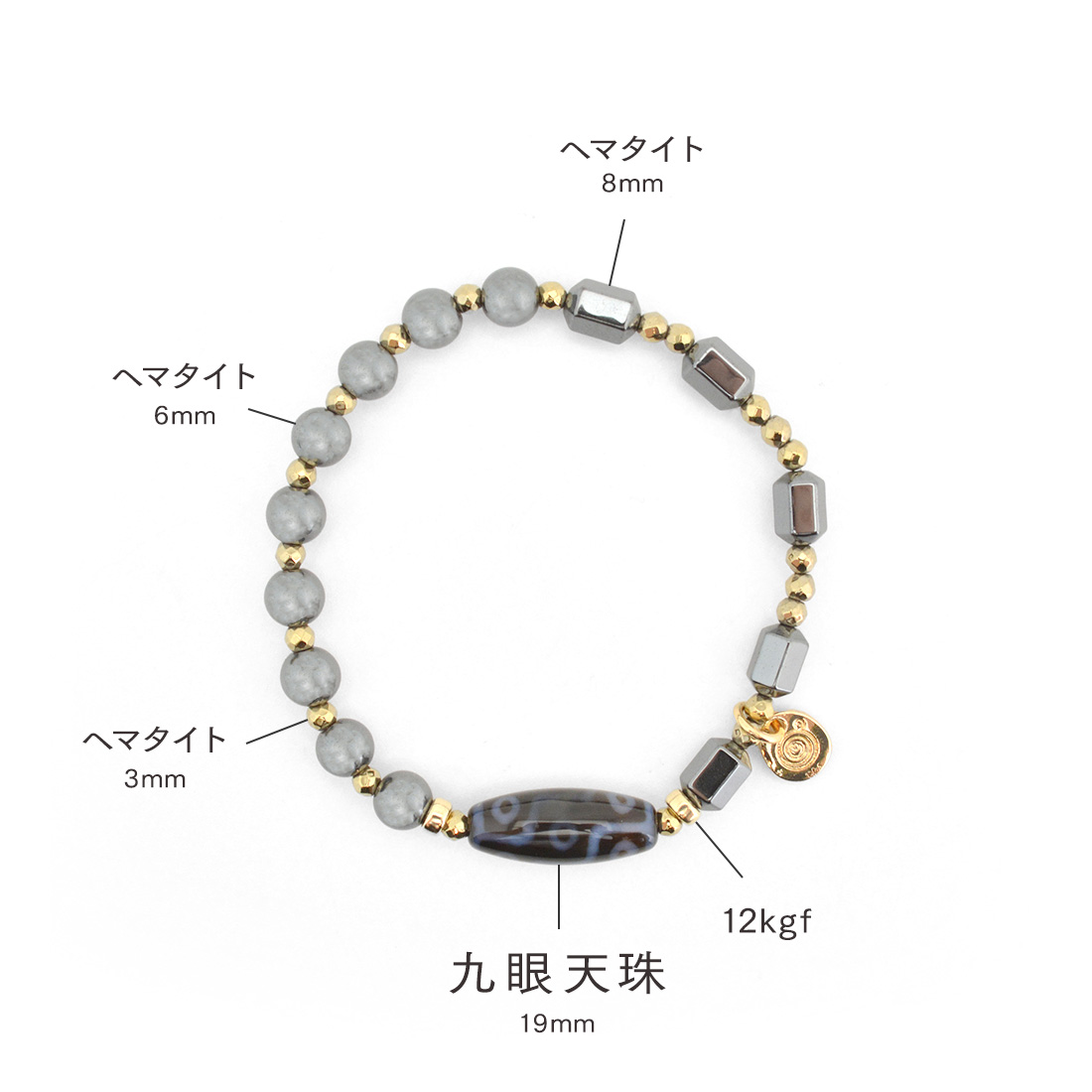 仕事運が向上。願望達成、権力と利益を倍増させるといわれている九眼天珠に、目標を達成し、勝利へ導く石とされるヘマタイトなどを組み合わせたブレスレットです。