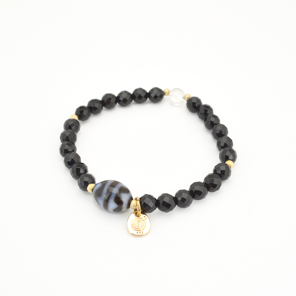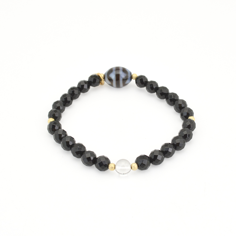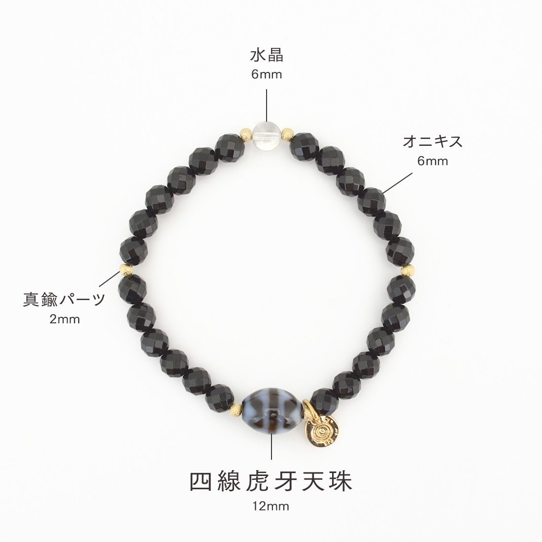 虎牙天珠を上回るパワーを持ち、強靭な心を身につけ、困難や災難を寄せつけないといわれている四線虎牙天珠に、潜在能力を活性化させ、魔除けの作用を持つ万能パワーストーンとされる水晶などを組み合わせたブレスレットです。