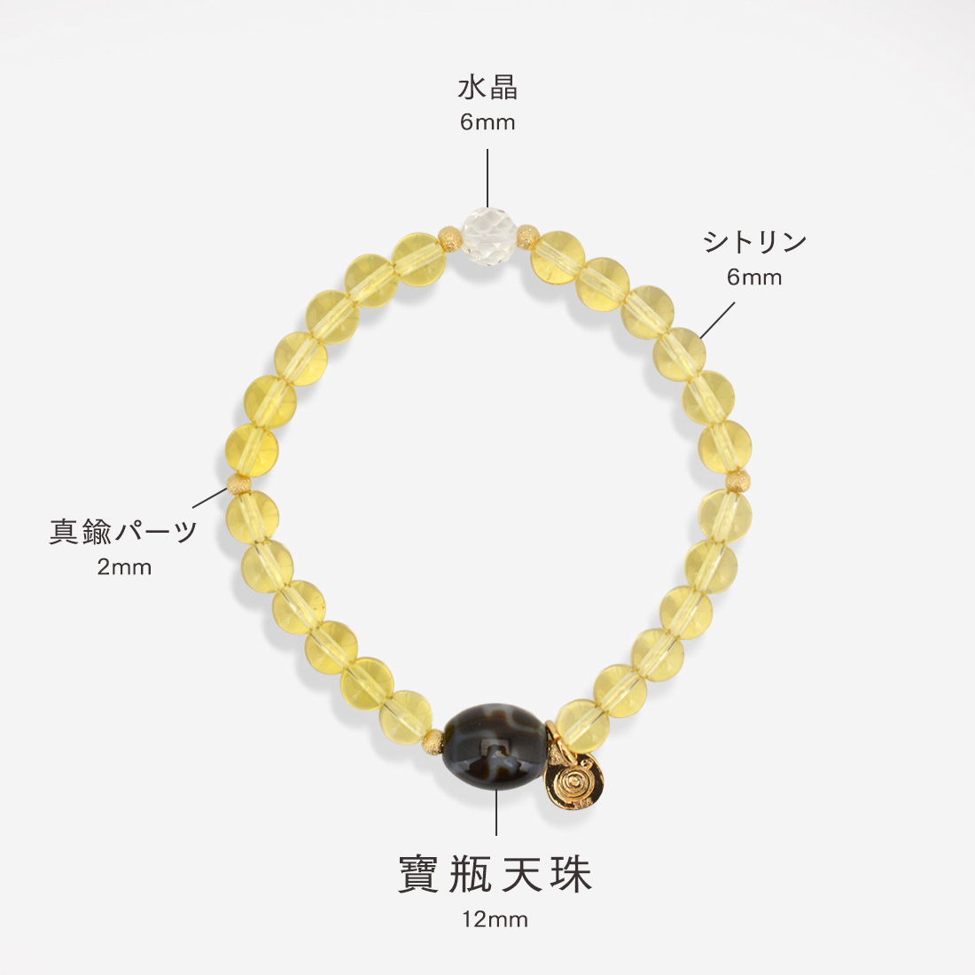 お金が貯まる入れ物を表す。大いなる金運を授かり、大財を築ける。子宝にも恵まれるといわれている寶瓶天珠に、潜在能力を活性化させ、魔除けの作用を持つ万能パワーストーンとされる水晶などを組み合わせたブレスレットです。