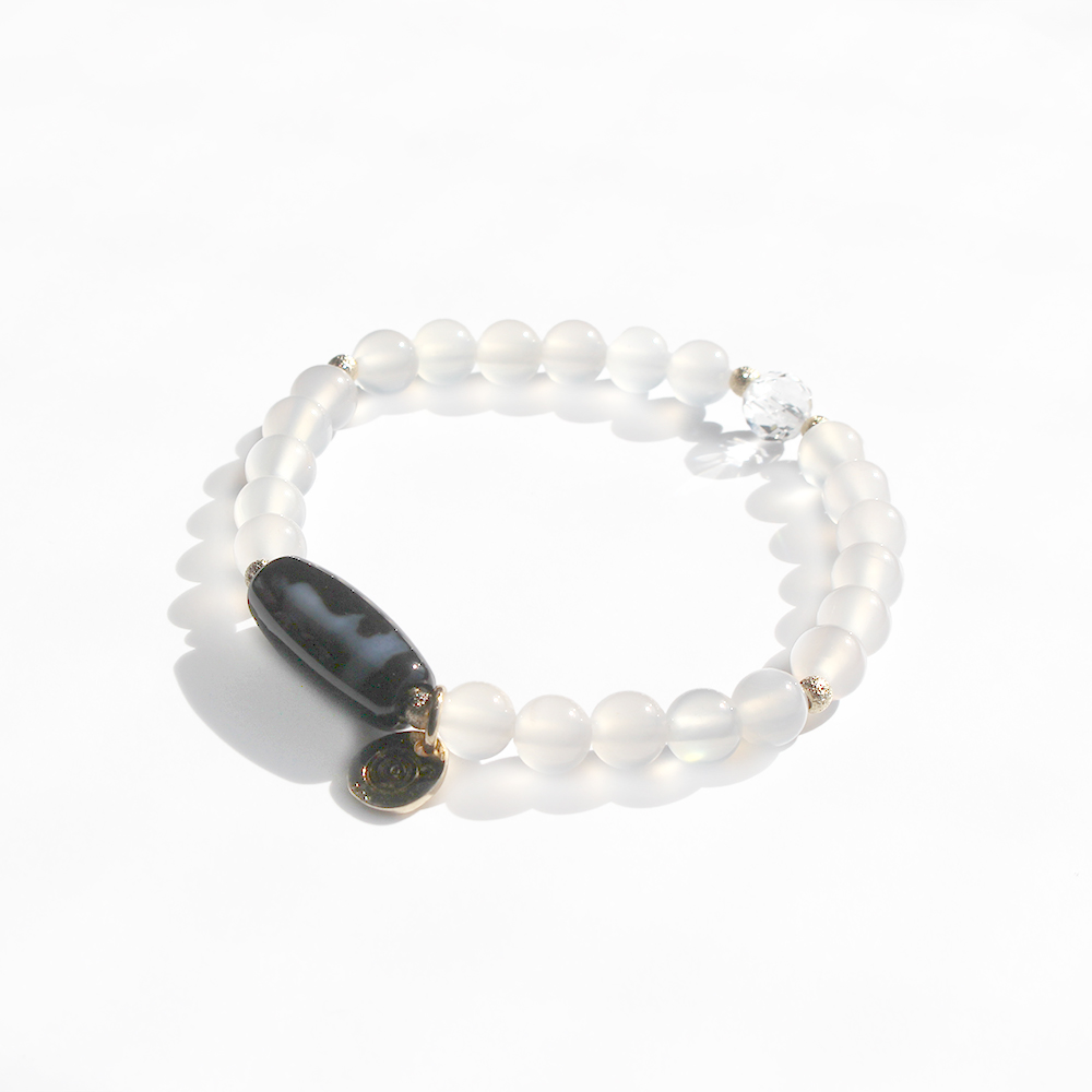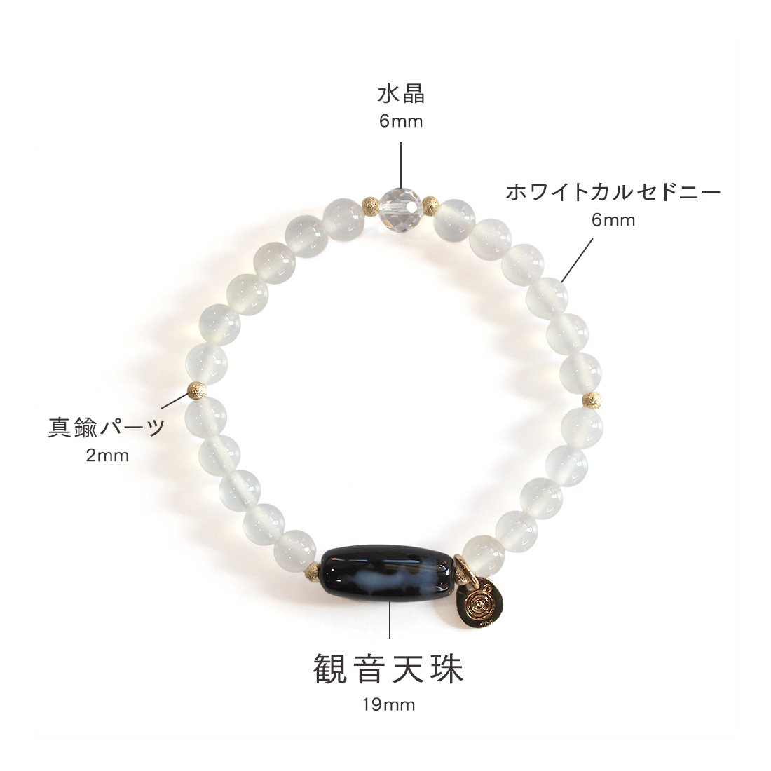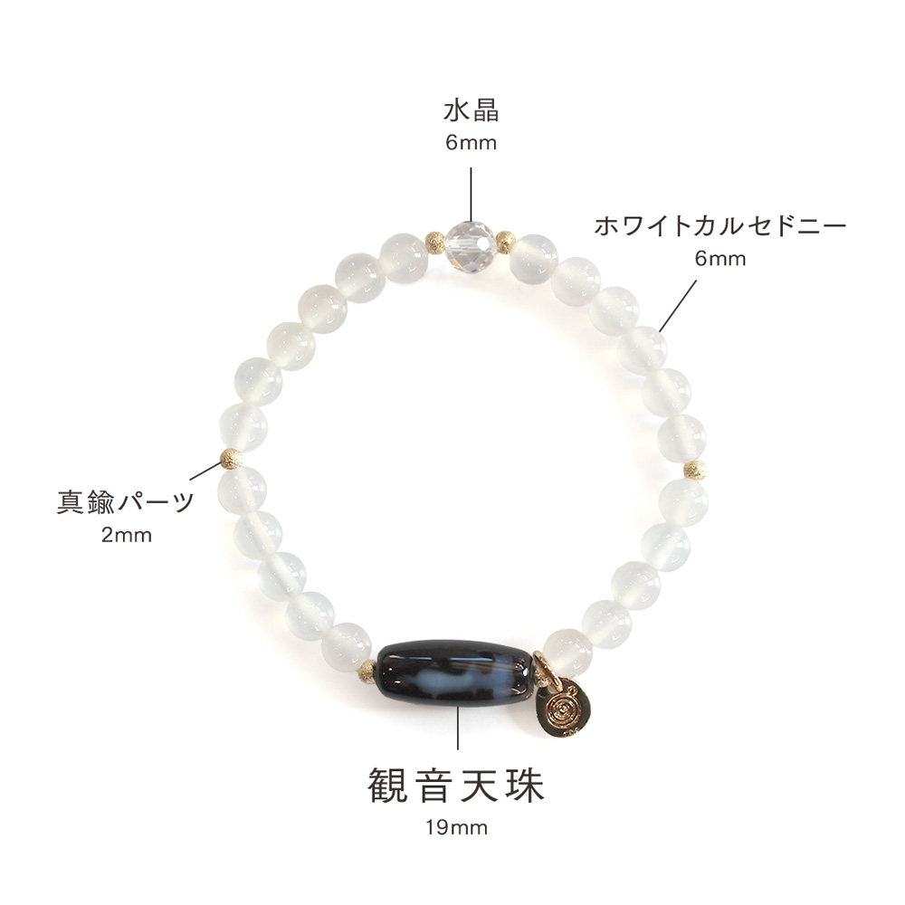 精神安定・金運招来・病魔退散・平和・幸福に導くといわれている観音天珠に、潜在能力を活性化させ、魔除けの作用を持つ万能パワーストーンとされる水晶などを組み合わせたブレスレットです。