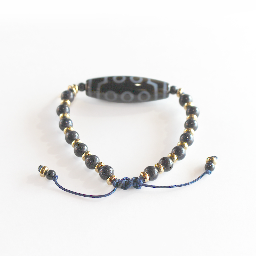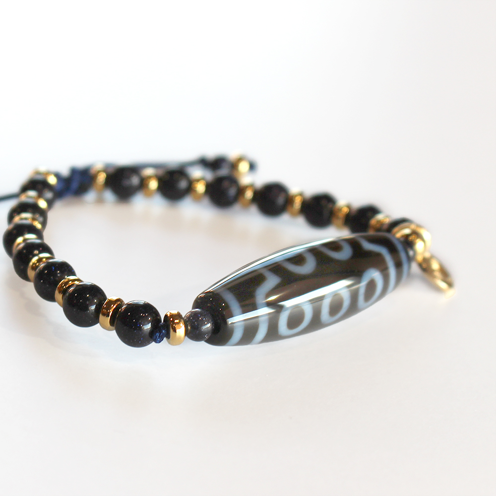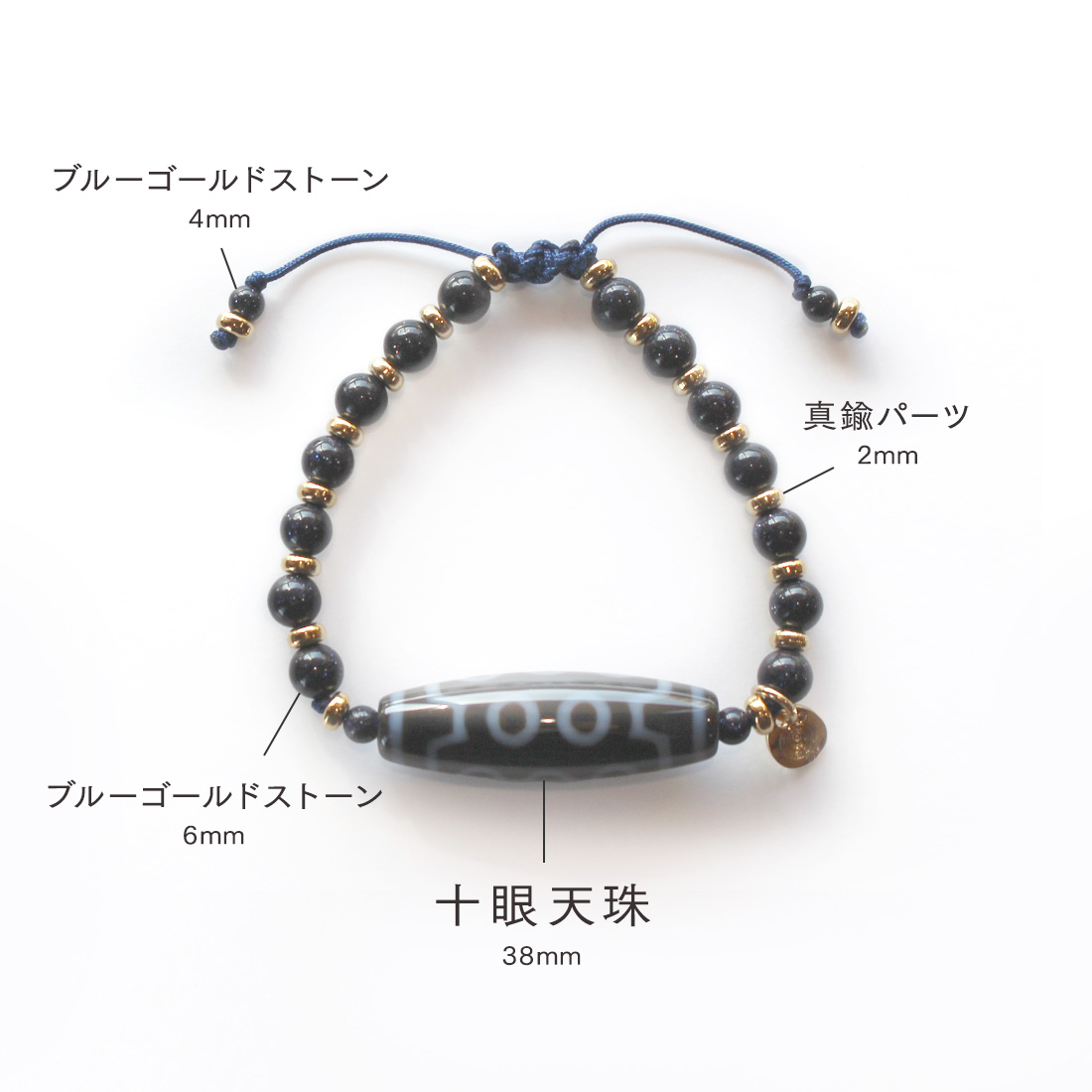 十全十美、全てが完璧になることを表す。人心・人気・愛情が得られ、災いや障害も取り除くといわれている十眼天珠に、自信を生み出し、人・物との出会いやチャンスを与えるとされるブルーゴールドストーンなどを組み合わせたブレスレットです。