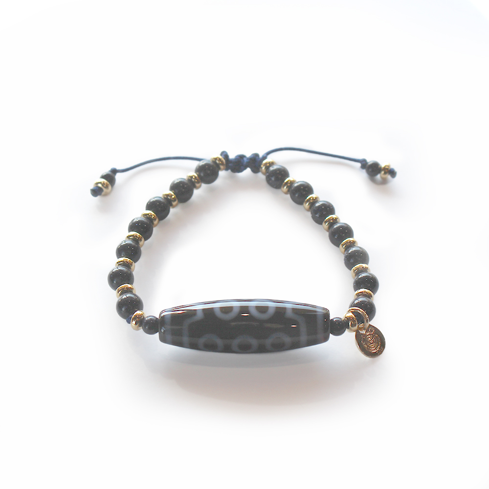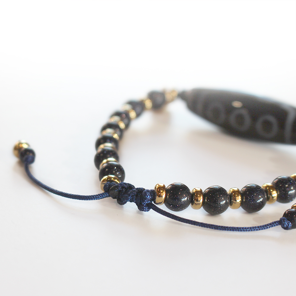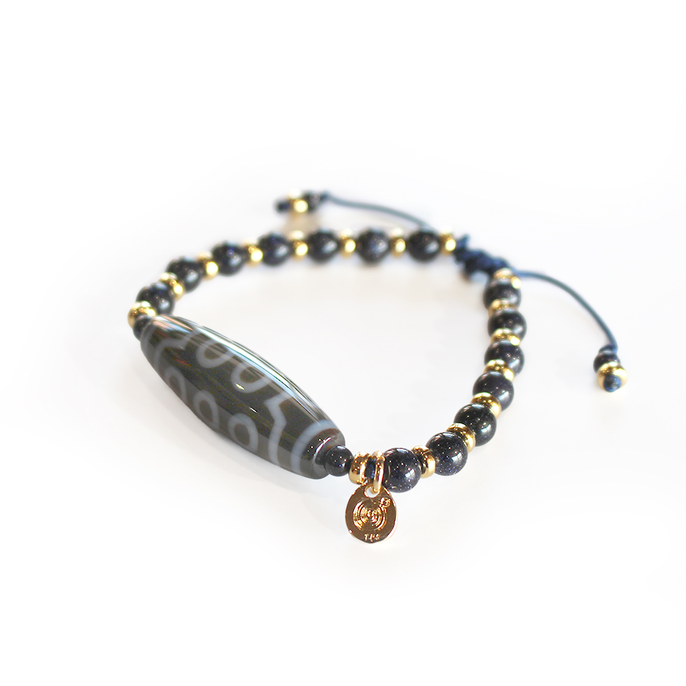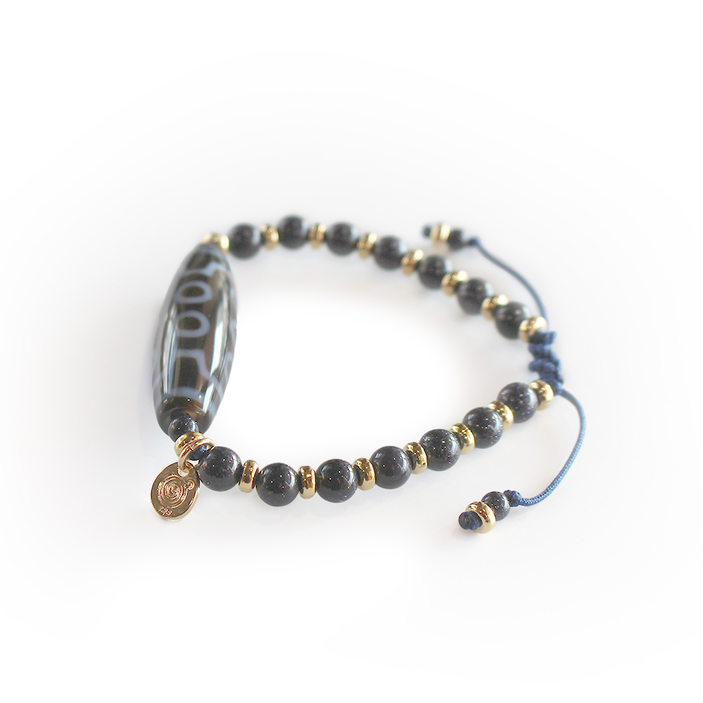 十全十美、全てが完璧になることを表す。人心・人気・愛情が得られ、災いや障害も取り除くといわれている十眼天珠に、自信を生み出し、人・物との出会いやチャンスを与えるとされるブルーゴールドストーンなどを組み合わせたブレスレットです。