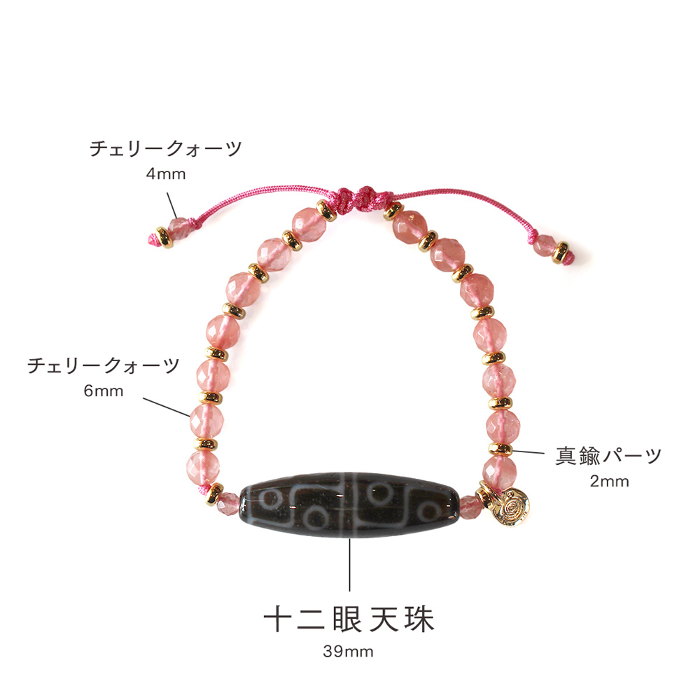薬師如来の十二神将のご加護で病気平癒・豊作・名誉・健康・長壽をもたらすといわれている十二眼天珠に、ポジティブなパワーを与え、前へ進むエネルギーを高めるとされるチェリークォーツなどを組み合わせたブレスレットです。