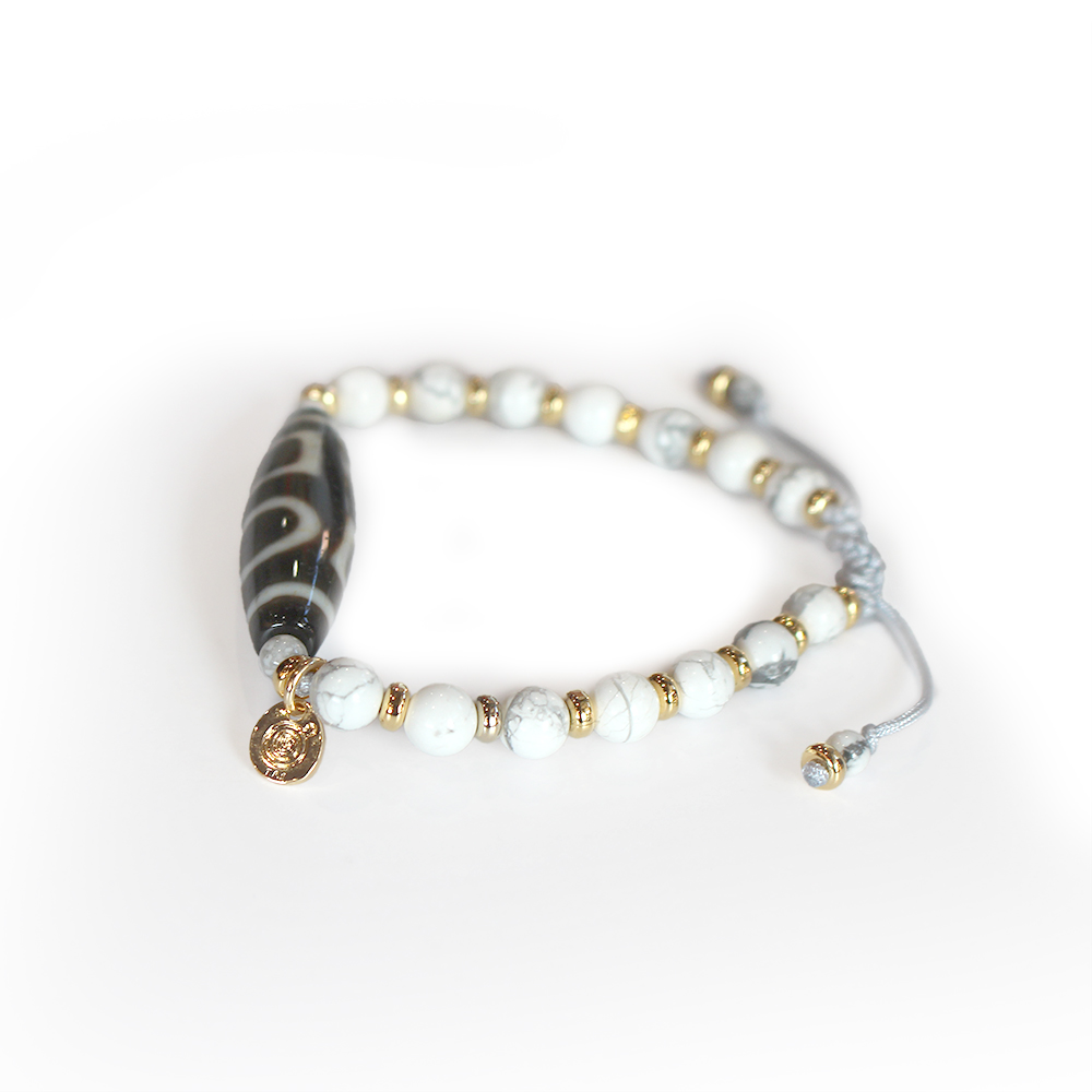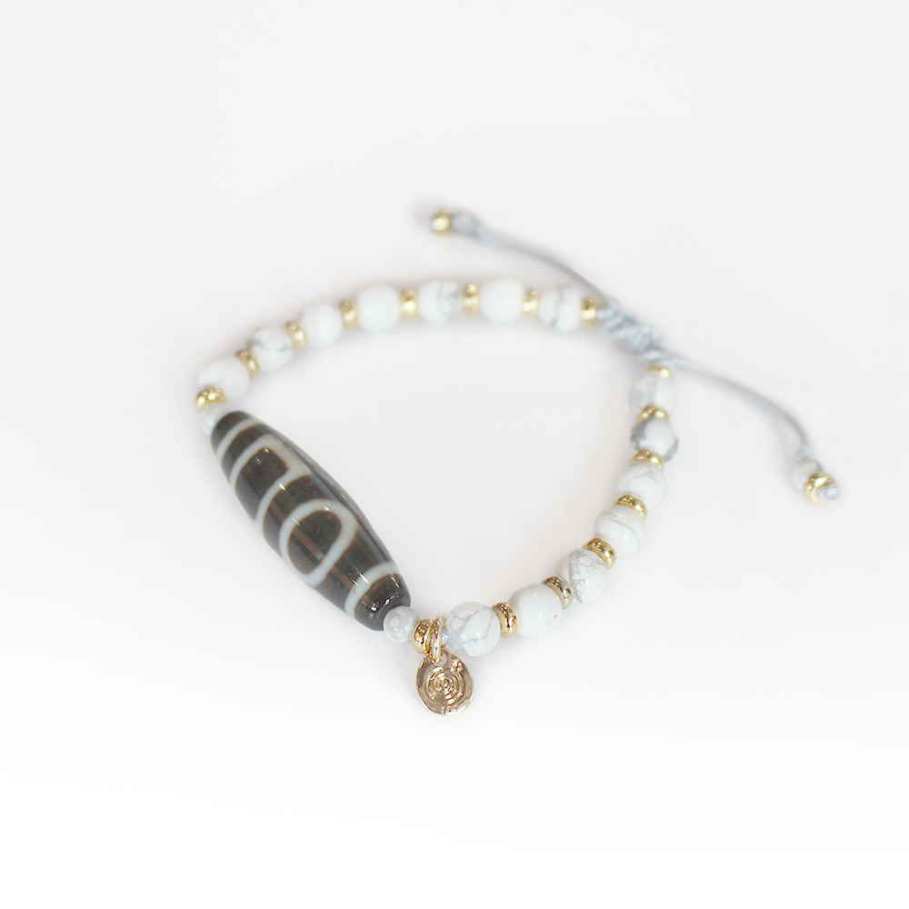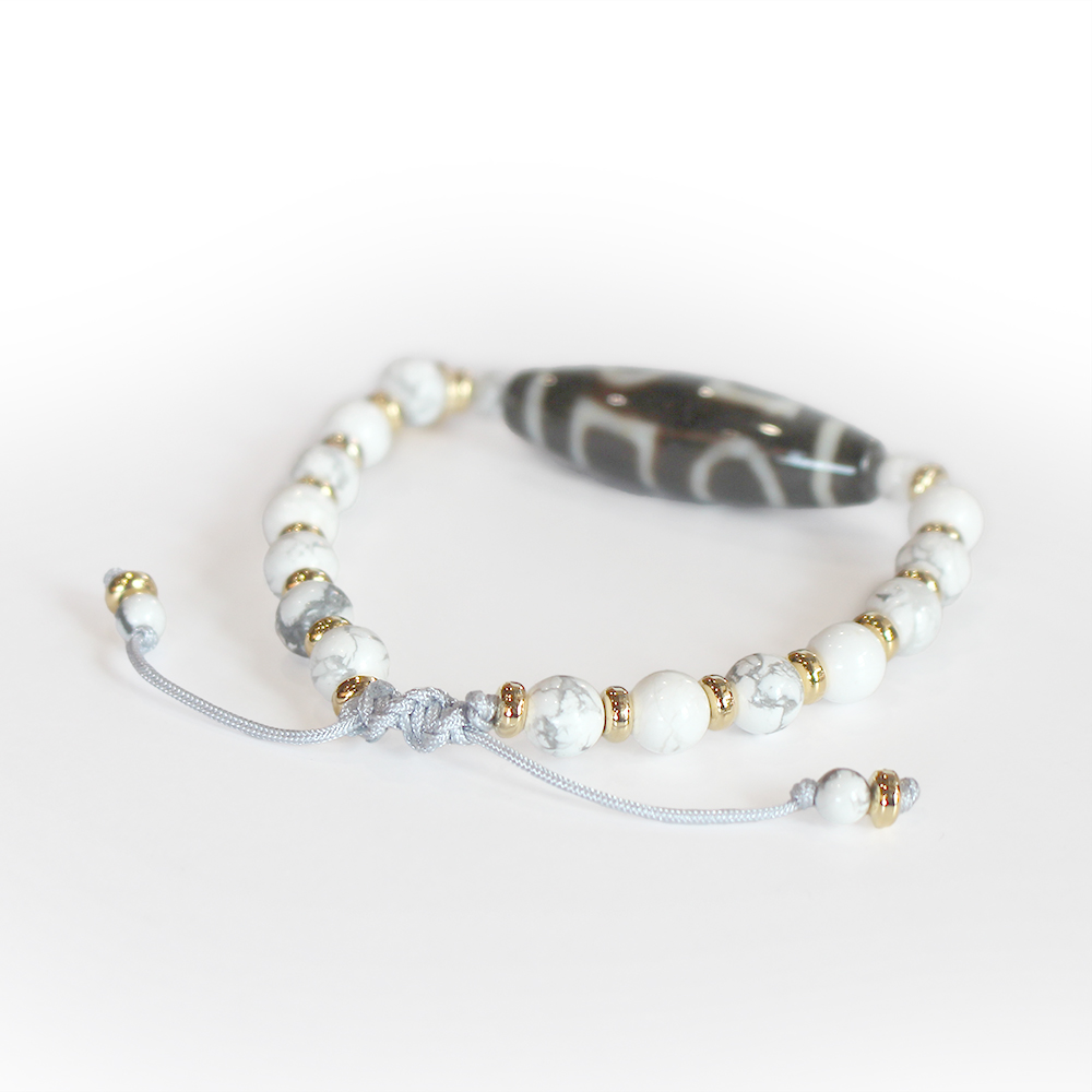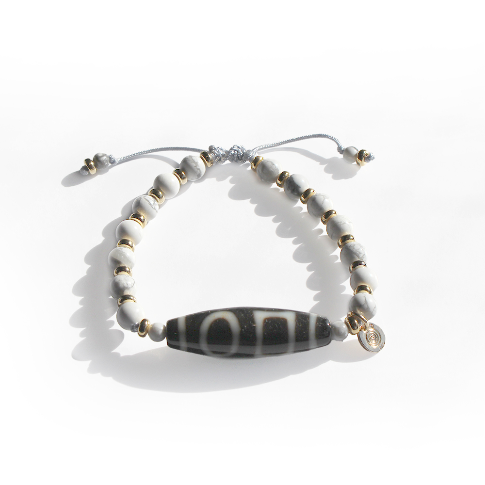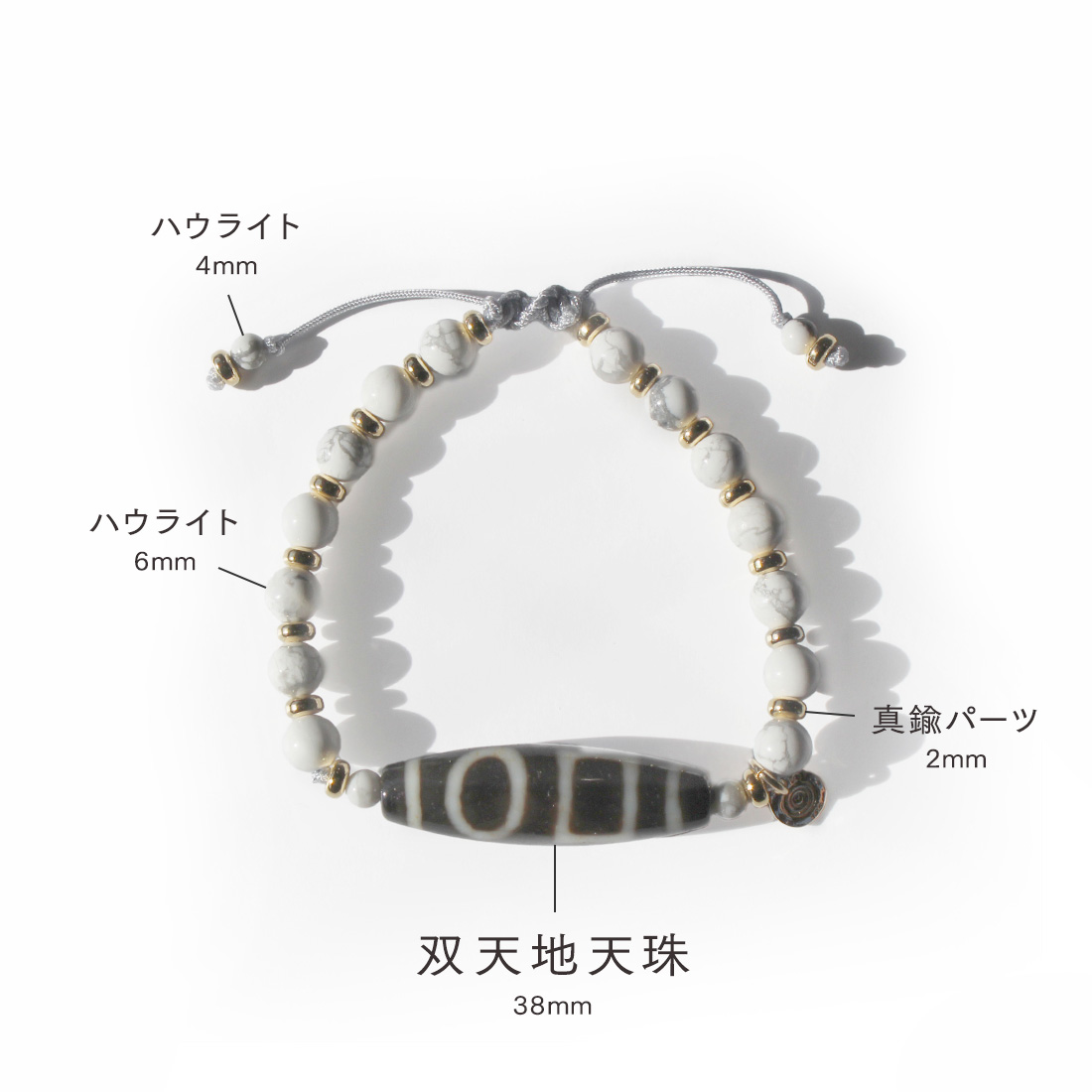 天地天珠の模様を二つ重ねることで、より強い力を生み出すといわれている双天地天珠に、純粋・無垢の象徴。感情を鎮静させ、冷静さや洞察力を取り戻すとされるハウライトなどを組み合わせたブレスレットです。