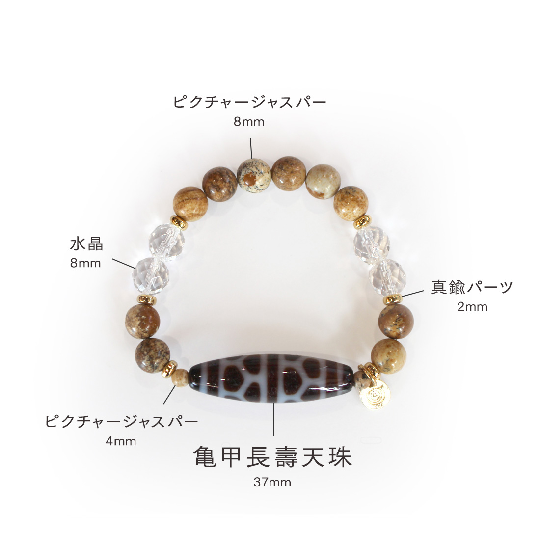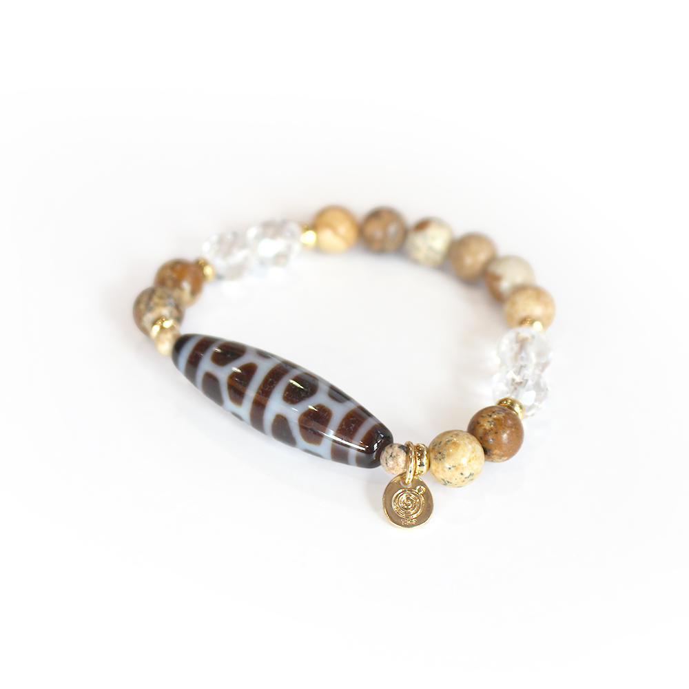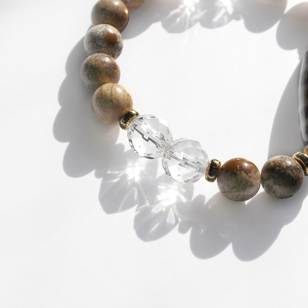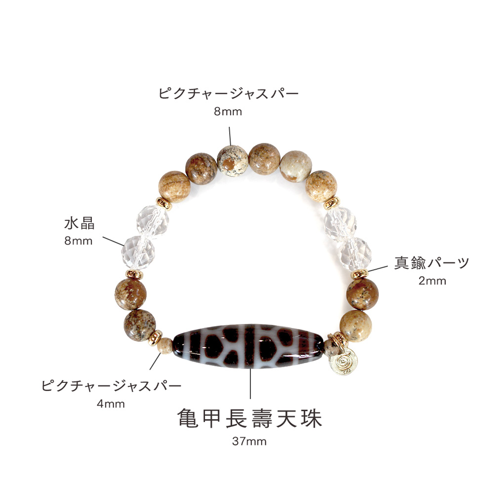 亀の甲羅を表す。病気や事故から身を守り、長生きできるといわれている亀甲長壽天珠に、大きな一歩を踏み出す力をサポートし、仕事運・判断力・勝負運を高めるとされるピクチャージャスパーなどを組み合わせたブレスレットです。