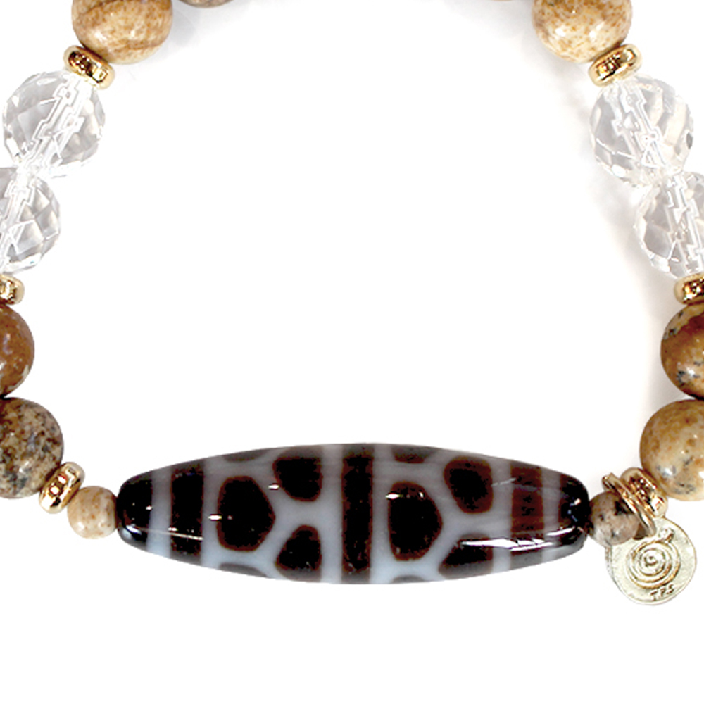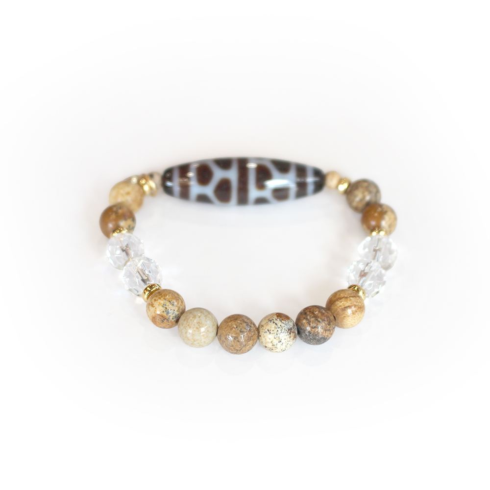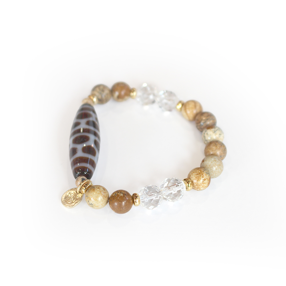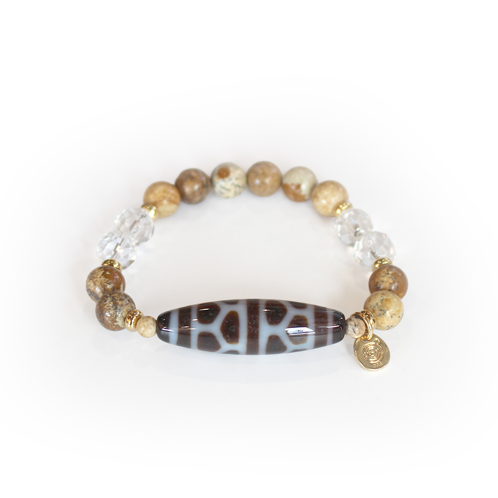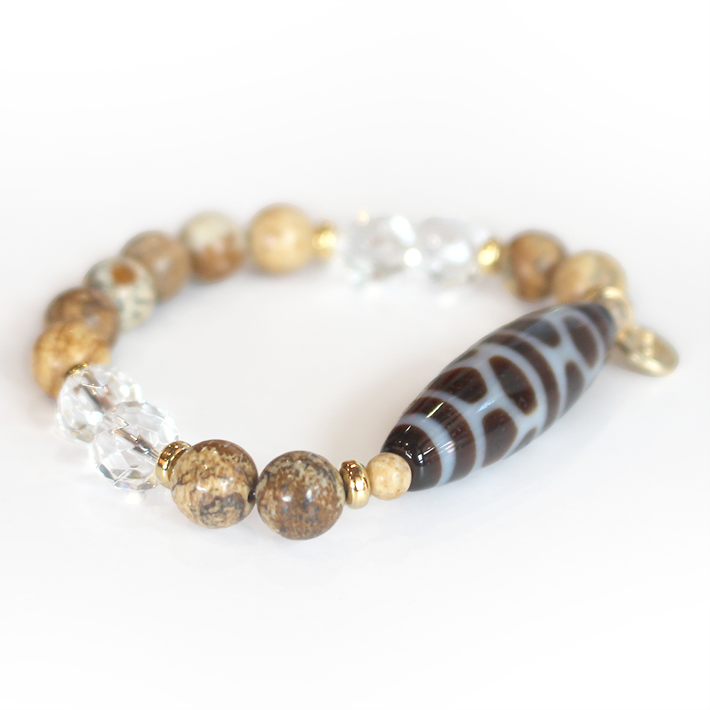 亀の甲羅を表す。病気や事故から身を守り、長生きできるといわれている亀甲長壽天珠に、大きな一歩を踏み出す力をサポートし、仕事運・判断力・勝負運を高めるとされるピクチャージャスパーなどを組み合わせたブレスレットです。