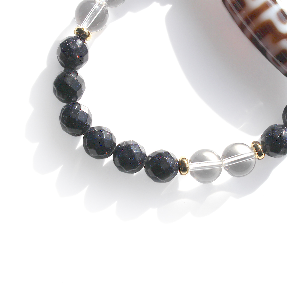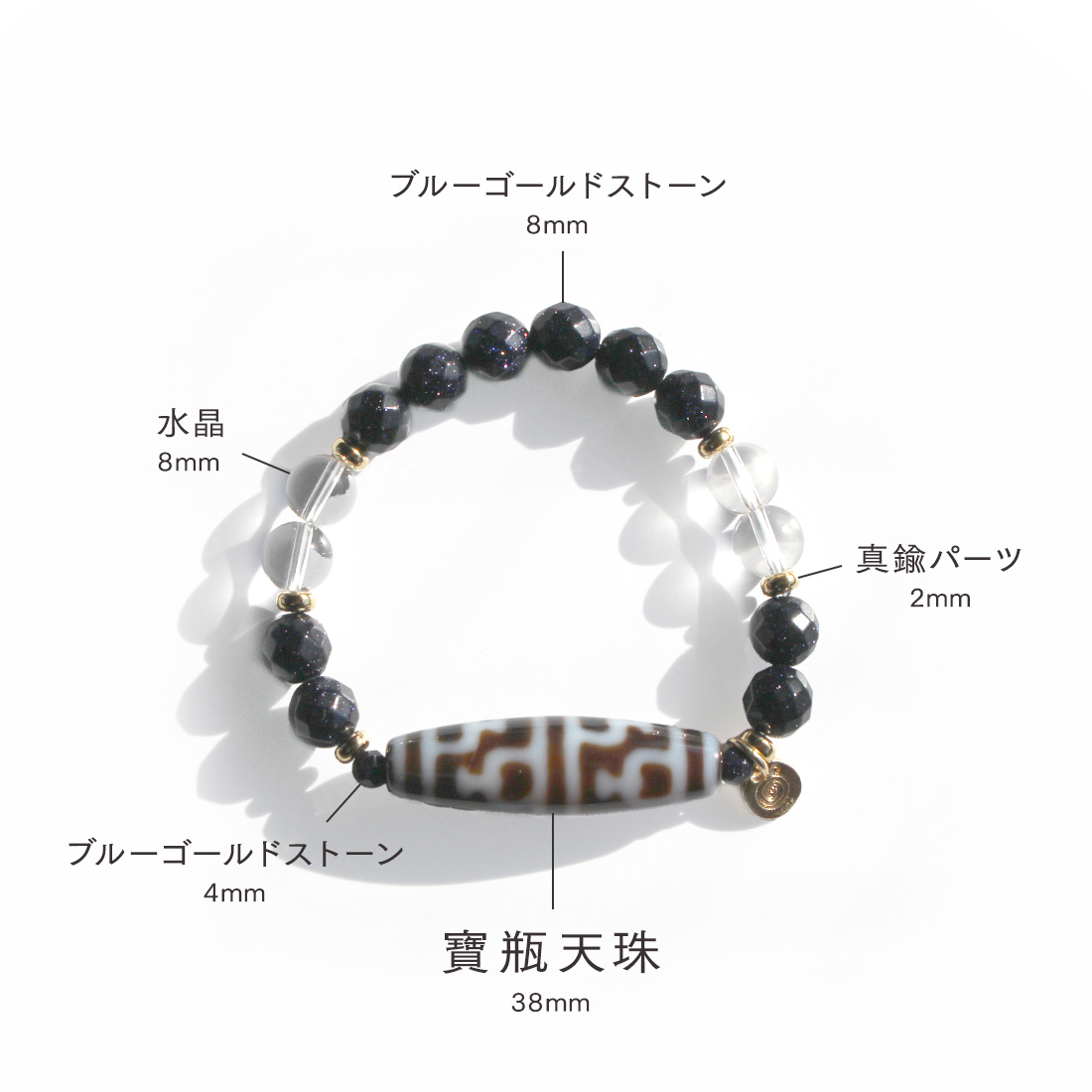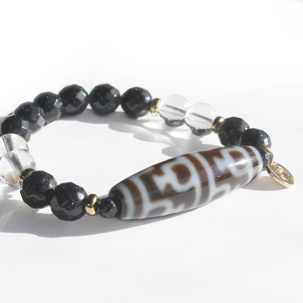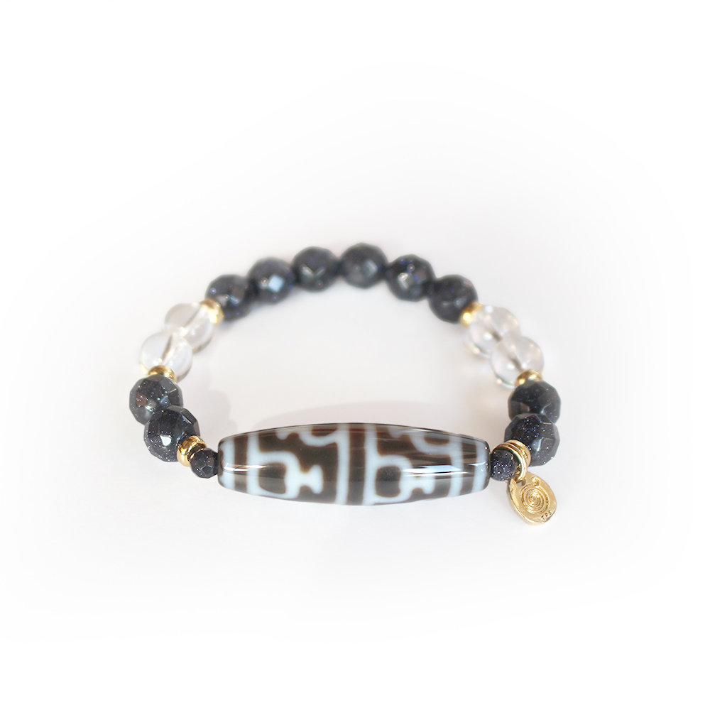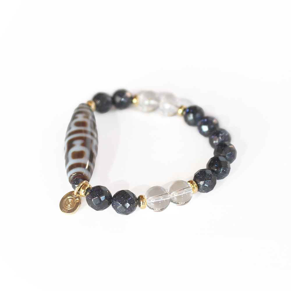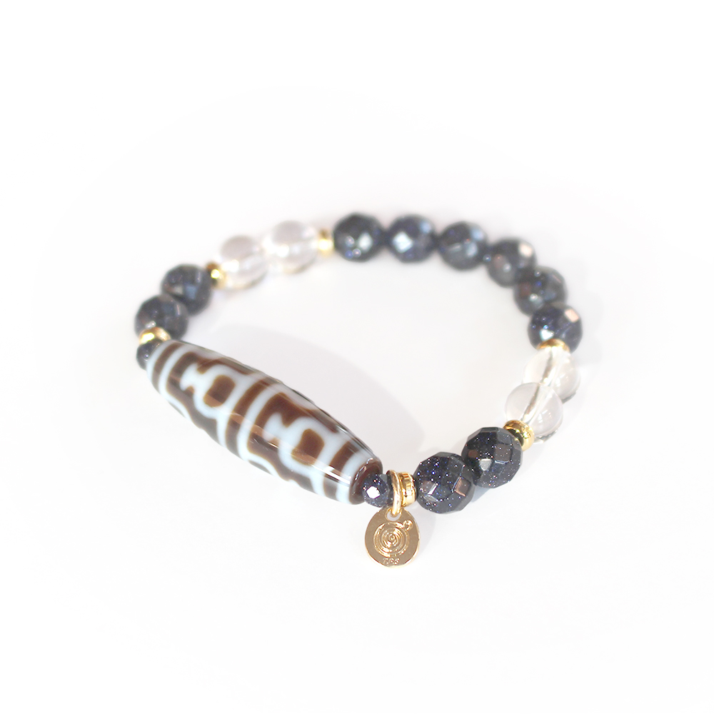 お金が貯まる入れ物を表す。大いなる金運を授かり、大財を築ける。子宝にも恵まれるといわれている寶瓶天珠に、自信を生み出し、人・物との出会いやチャンスを与えるとされるブルーゴールドストーンなどを組み合わせたブレスレットです。