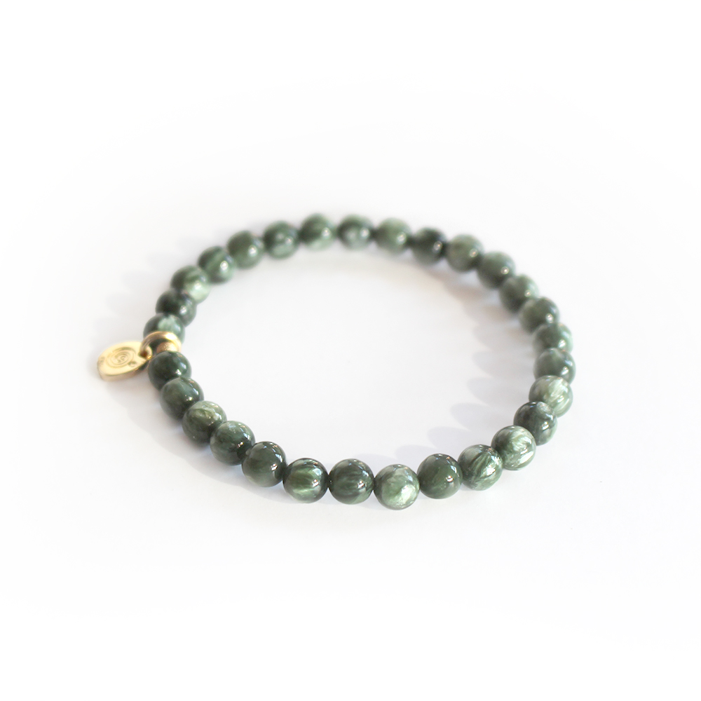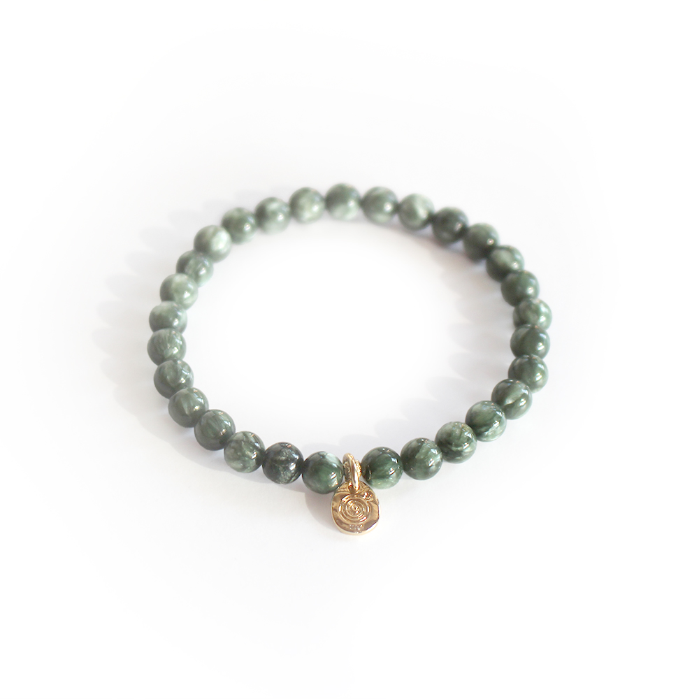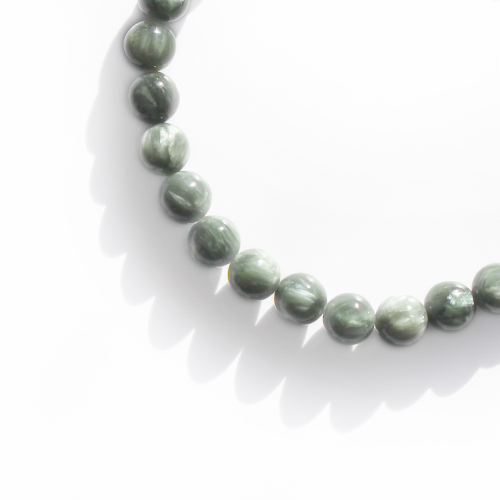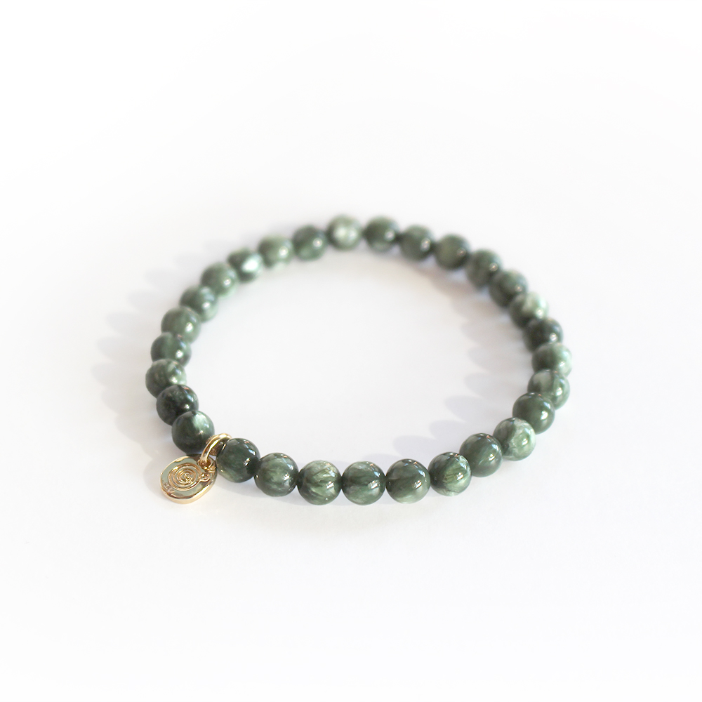 緊張感を和らげ、コミュニケーションを円滑にし、仕事が順調に進むとされるセラフィナイトなどを組み合わせたブレスレットです。