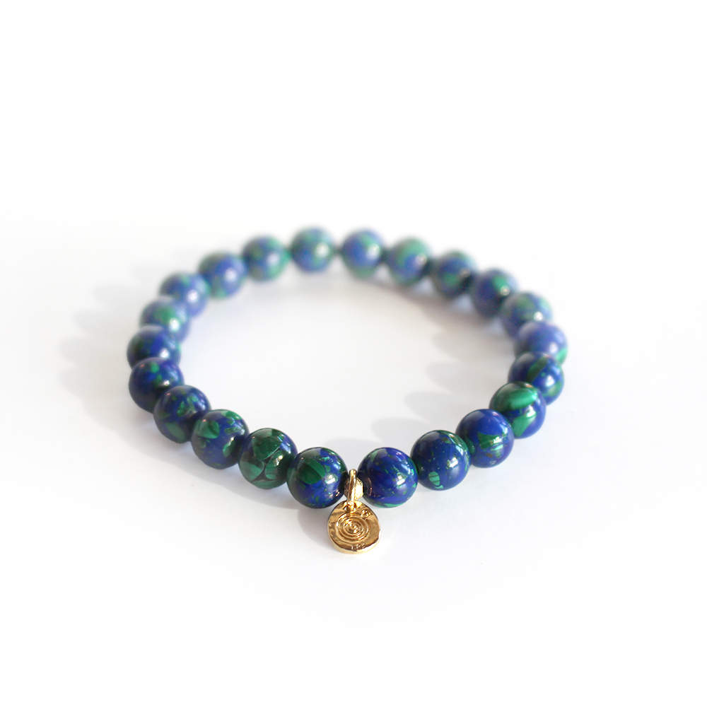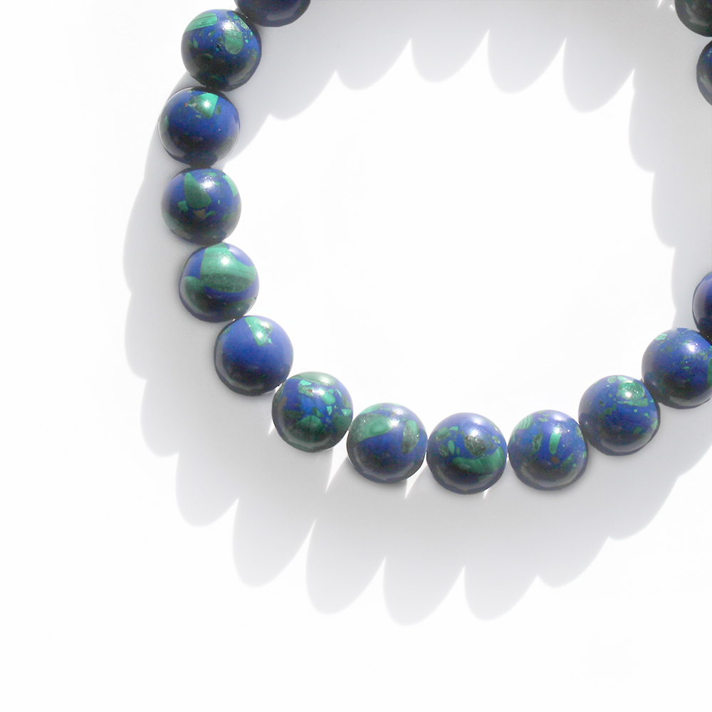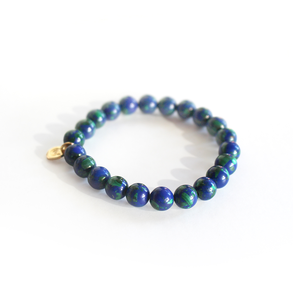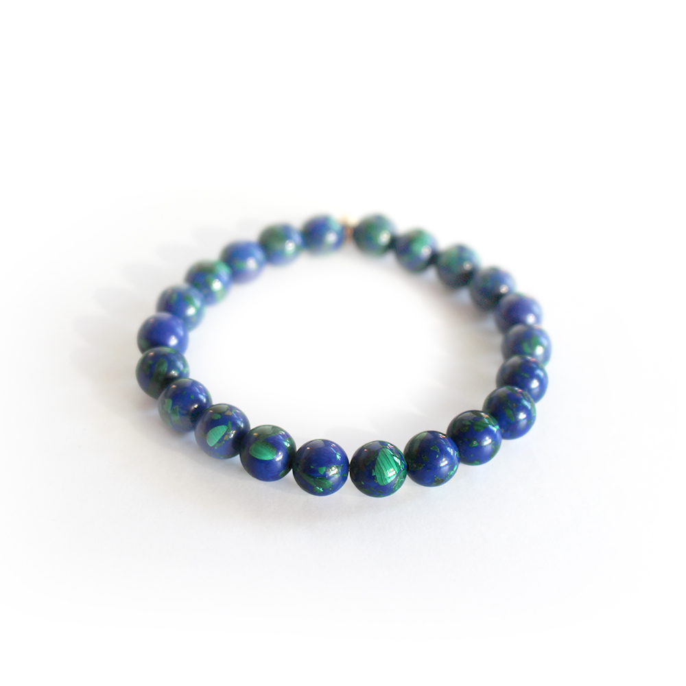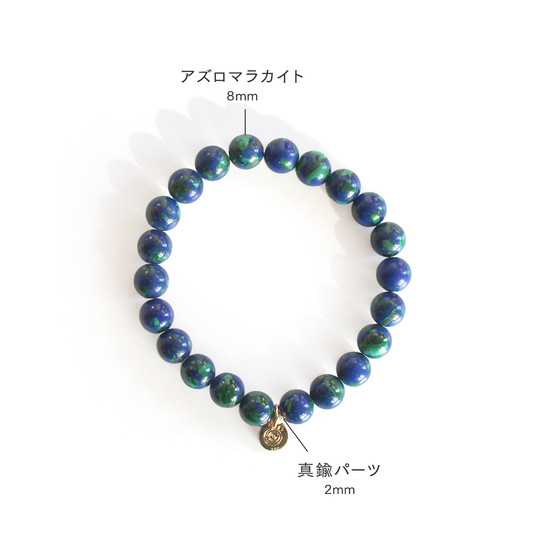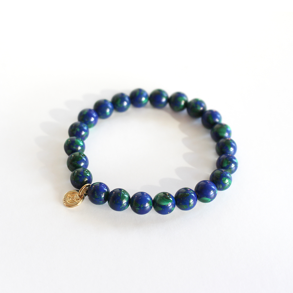 ビジネスや人との関わりの能力を高め、先を見抜く力が備わるのを助けてくれると言われているアズロマラカイトなどを組み合わせたブレスレットです。