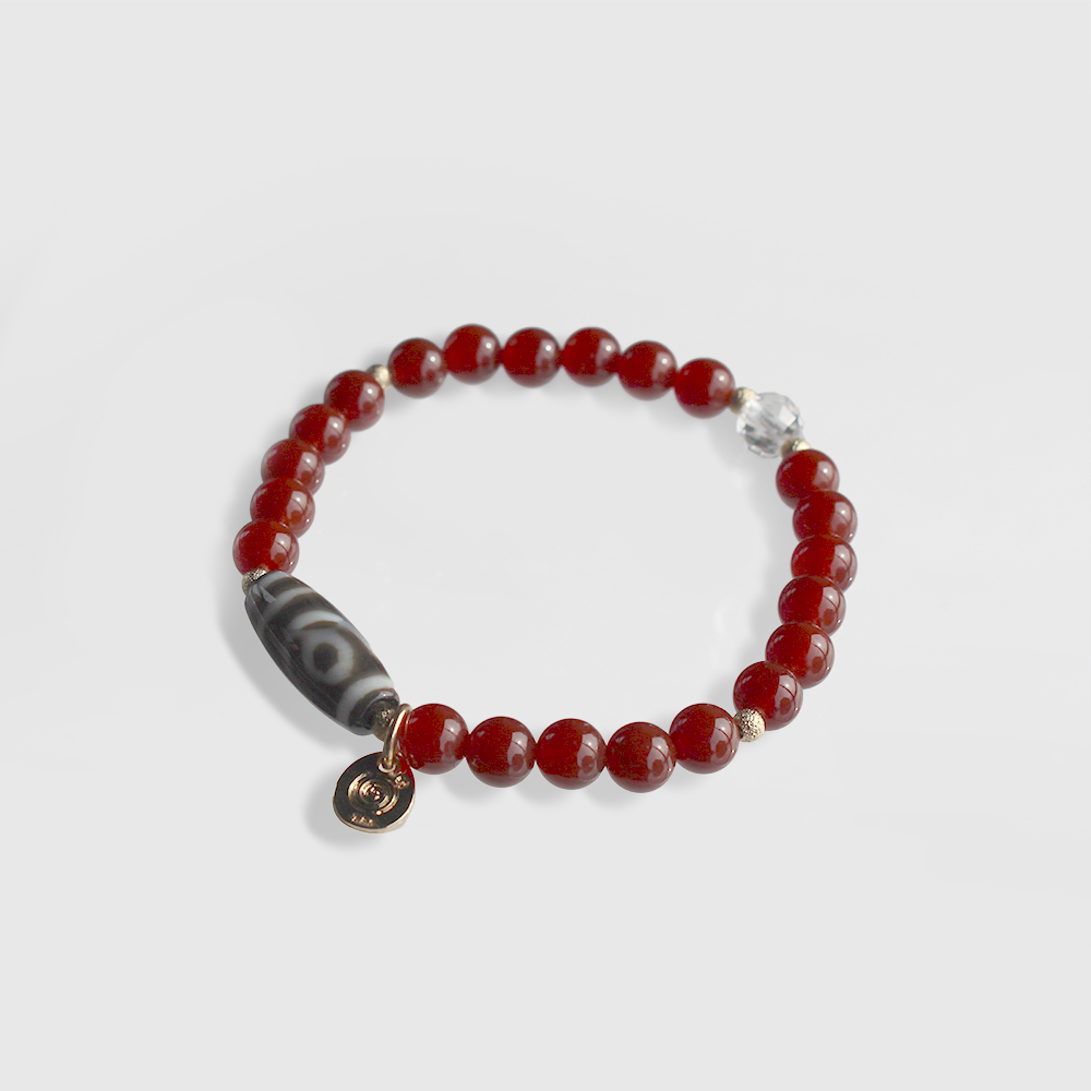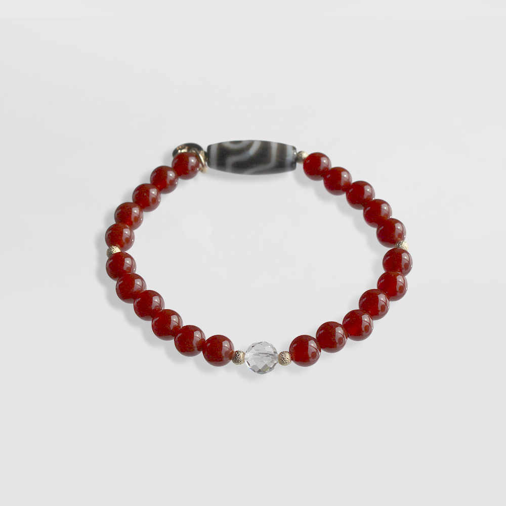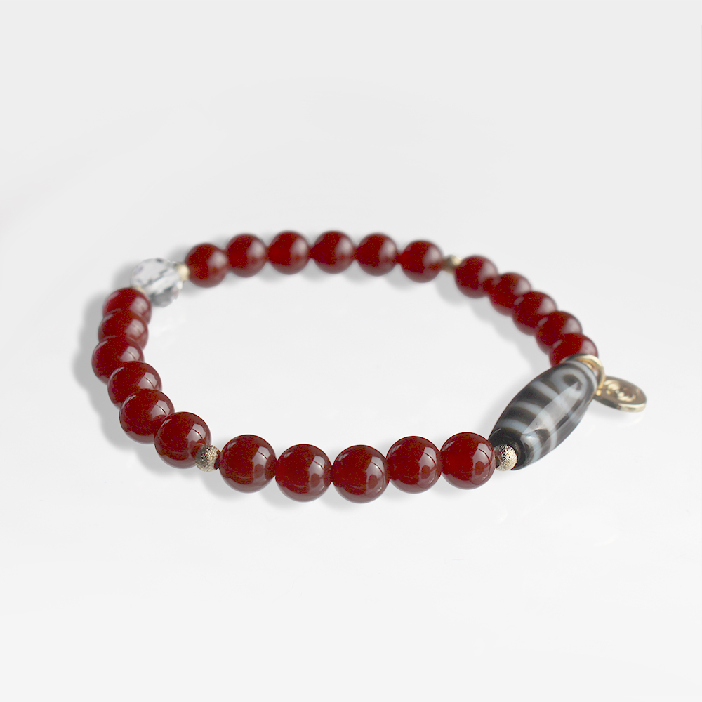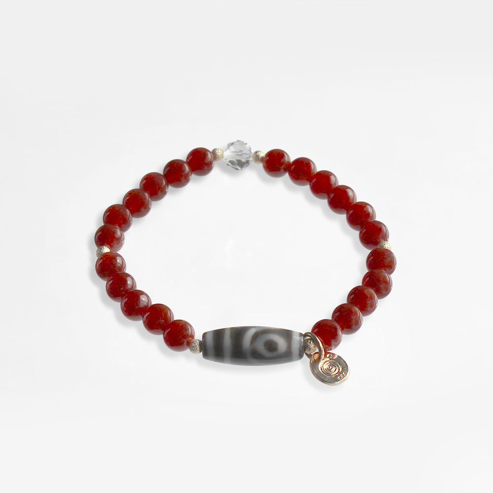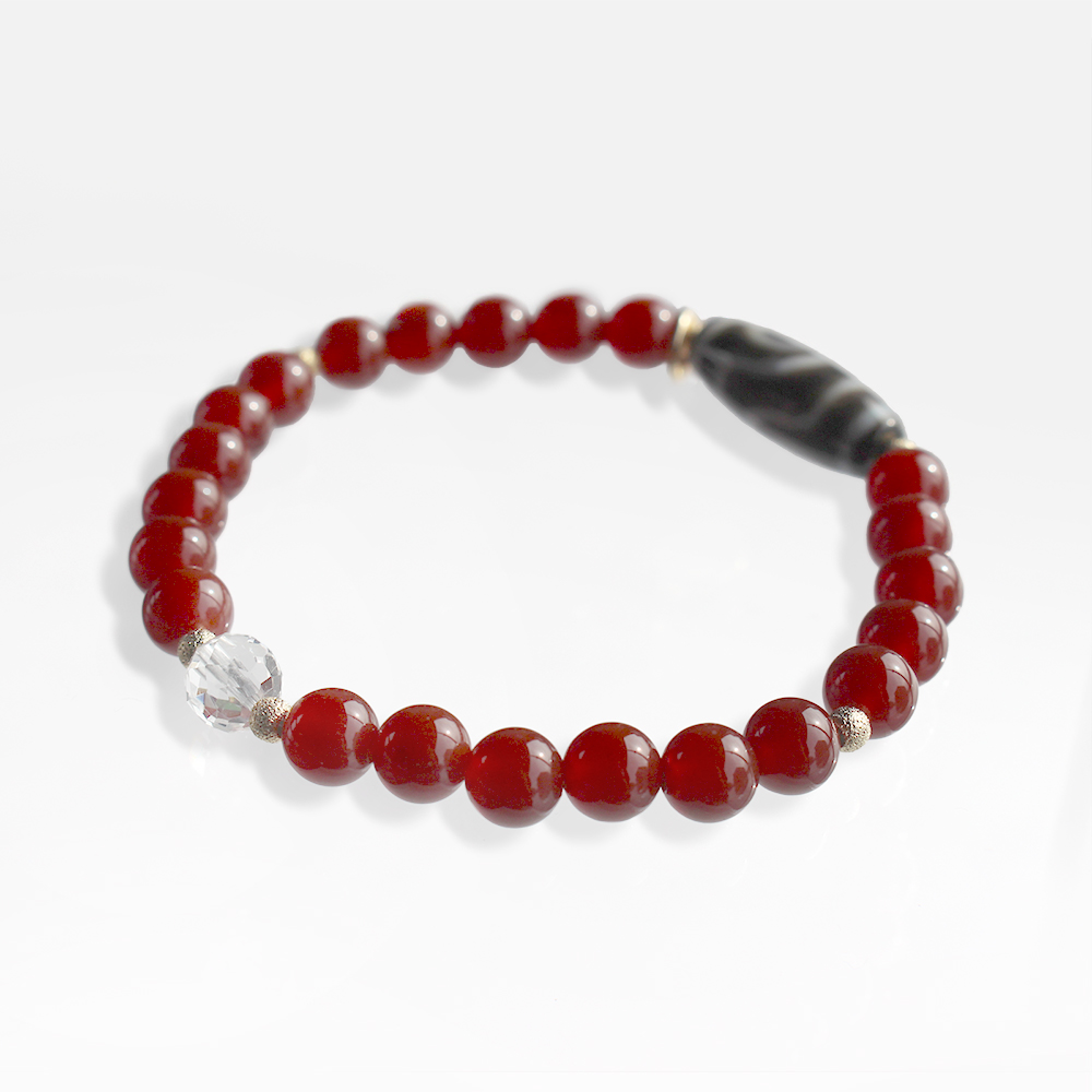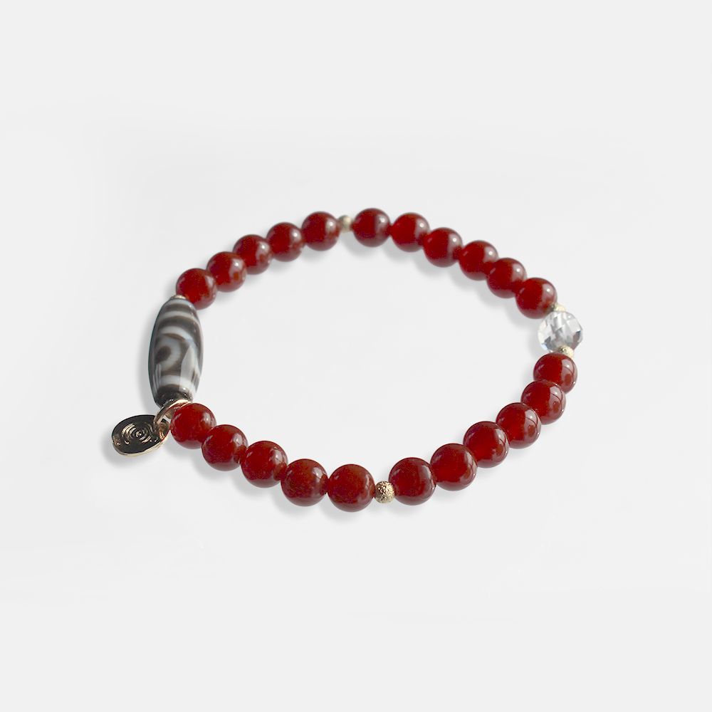 恋愛成就・夫婦円満・相互理解に力を発揮し、商売においても調和を促すといわれている二眼天珠に、家庭円満・子宝に恵まれ、情熱や積極性を呼び起こすとされるレッドアゲートなどを組み合わせたブレスレットです。