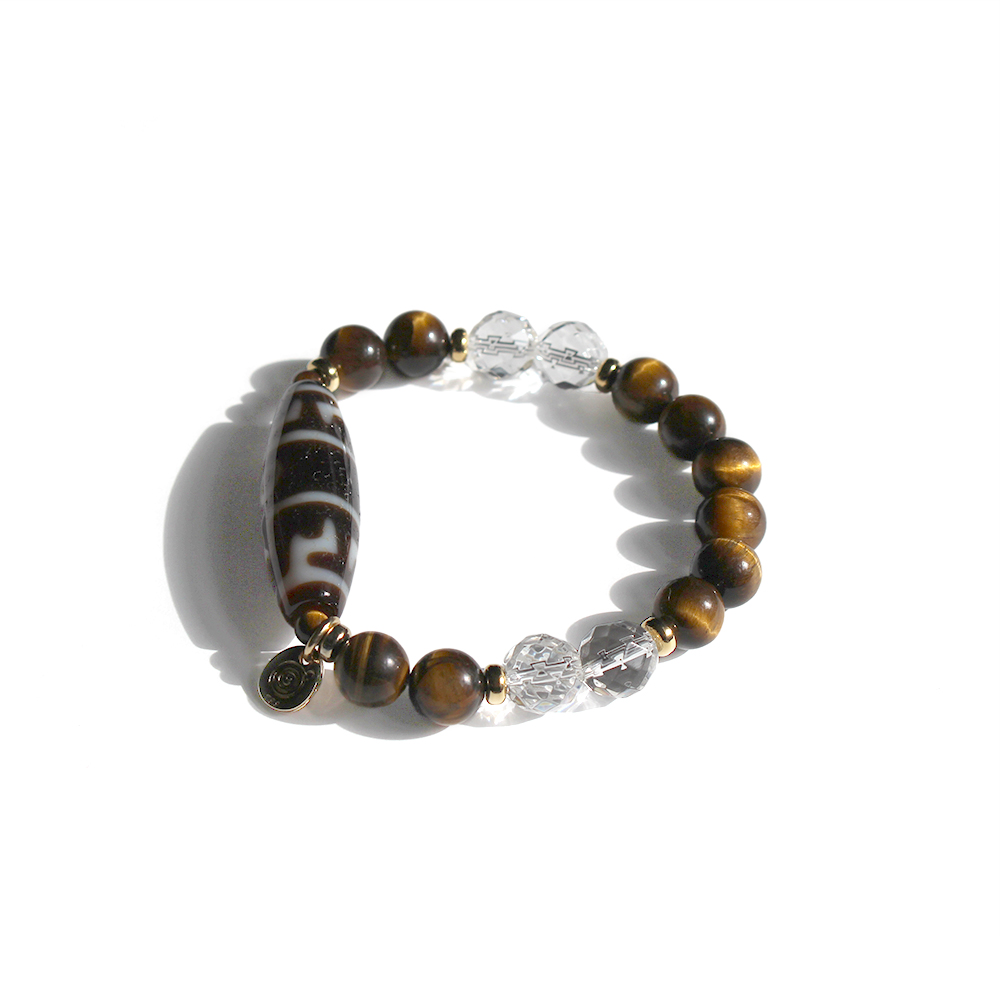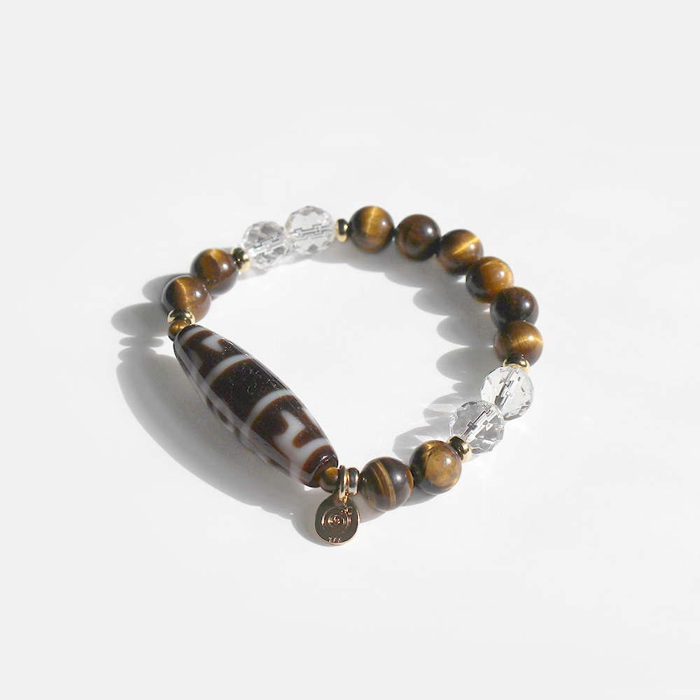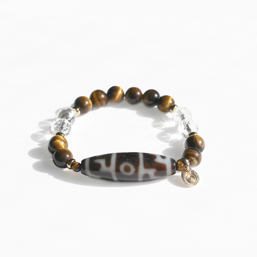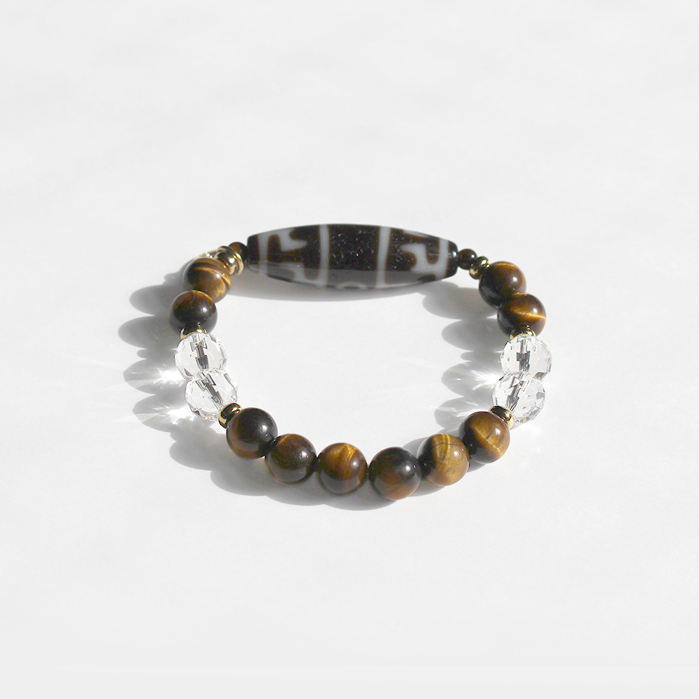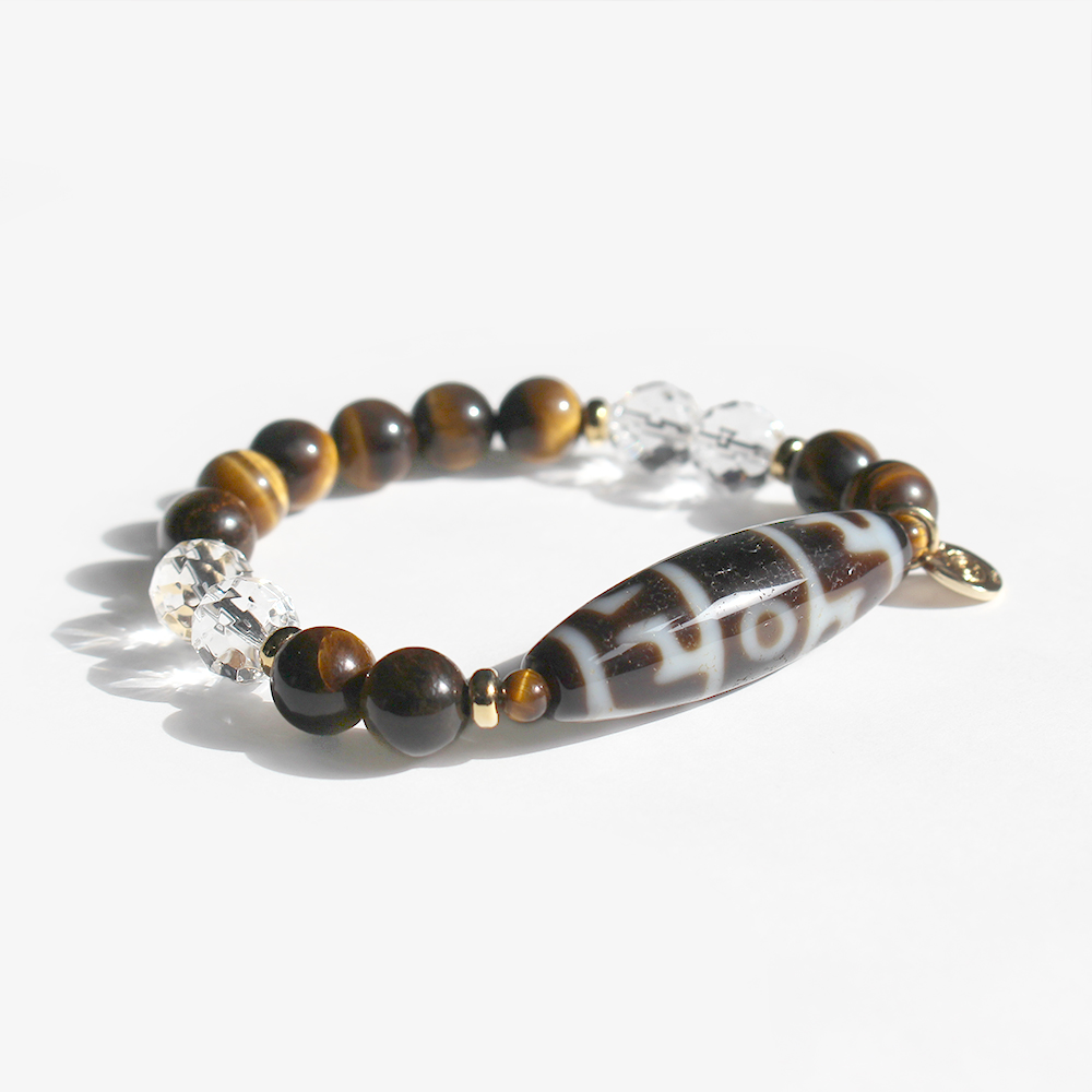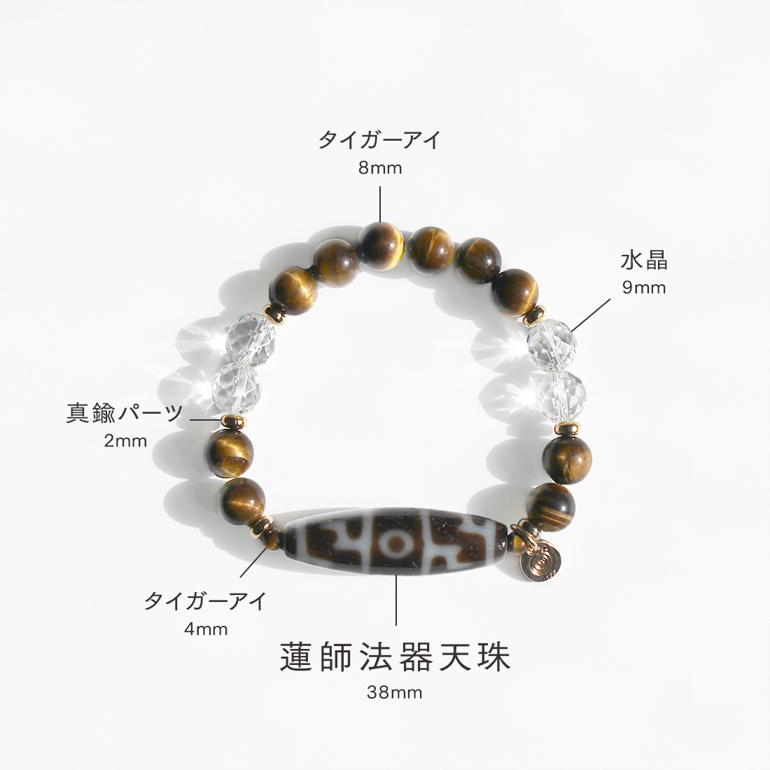 密教の法具を象徴する天珠。魔除け・厄除けに強い力を発揮するといわれている蓮師法器天珠に、決断力・洞察力を養うとされ、金運・仕事運・勝負運アップによいといわれるタイガーアイなどを組み合わせたブレスレットです。