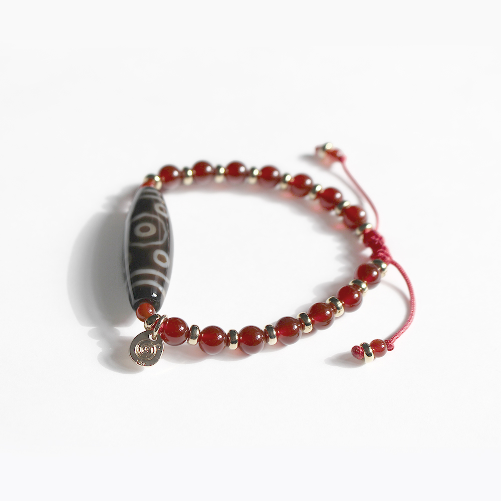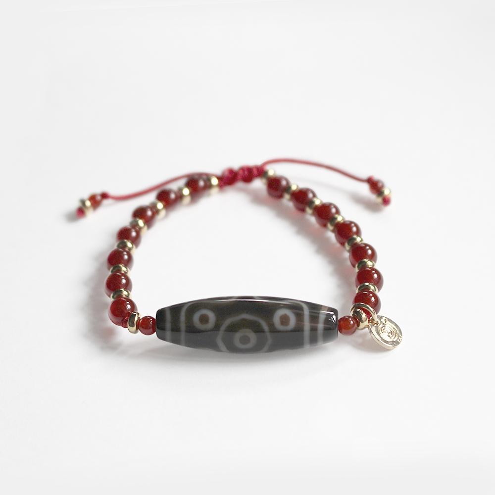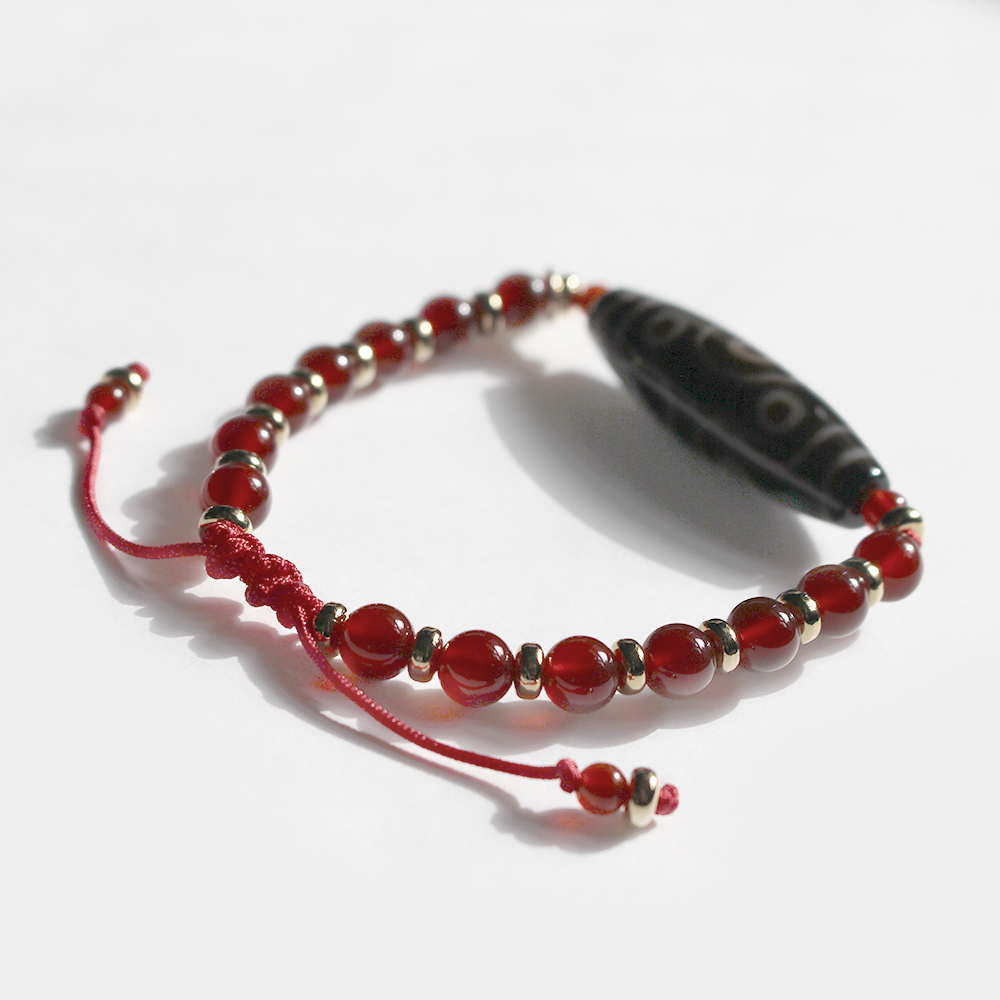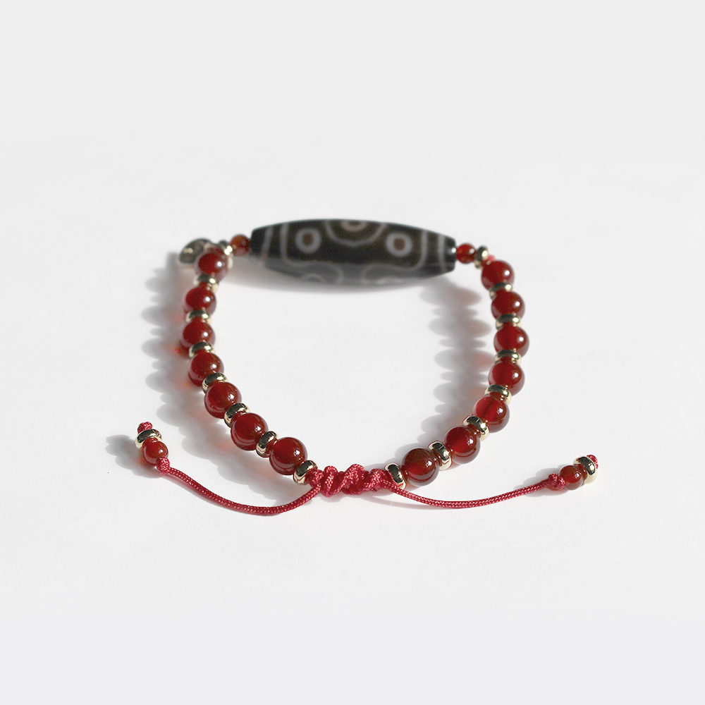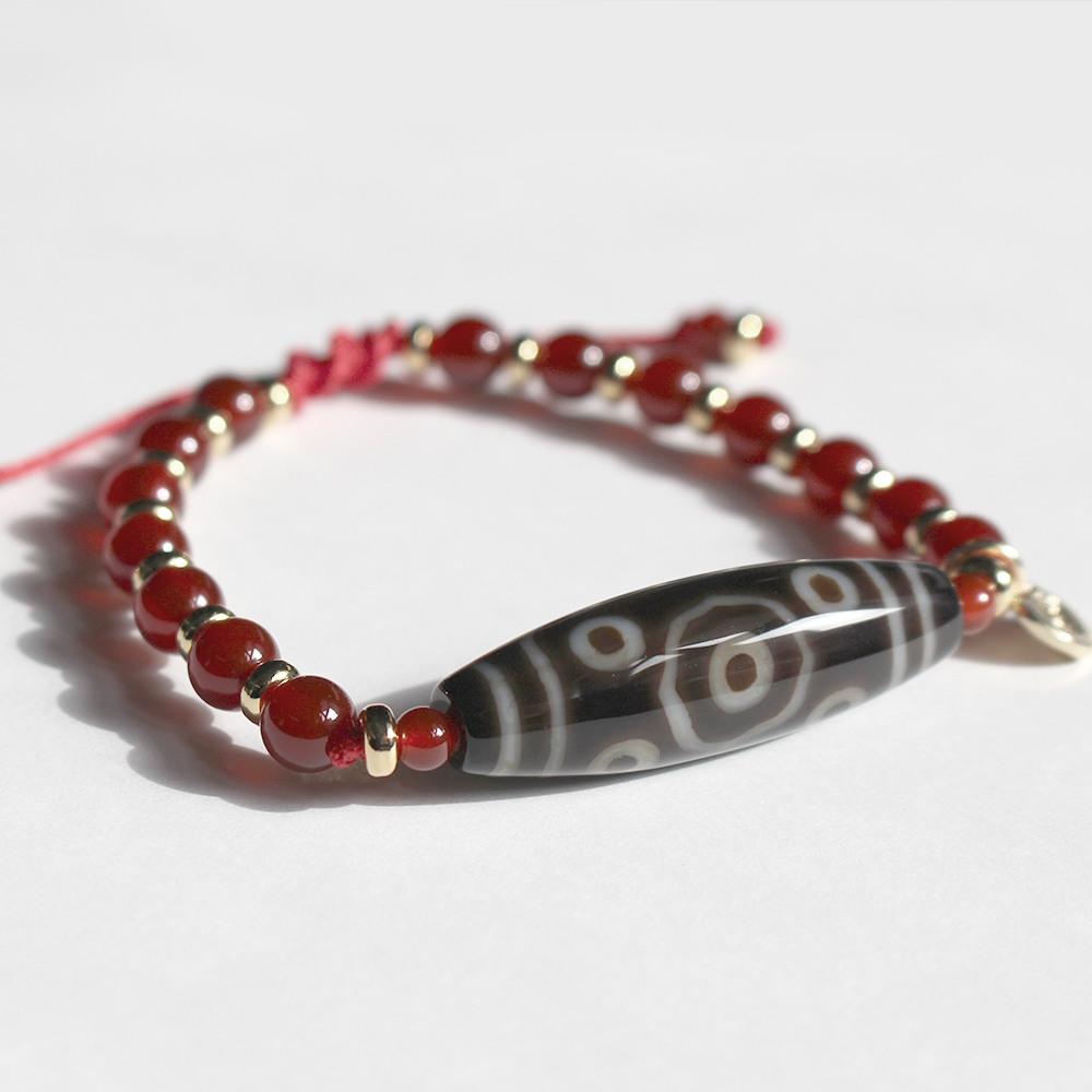 新しい目的への出発、知力向上・福運をもたらし、大切な物が手に入るといわれている十一眼天珠に、家庭円満・子宝に恵まれ、情熱や積極性を呼び起こすとされるレッドアゲートなどを組み合わせたブレスレットです。