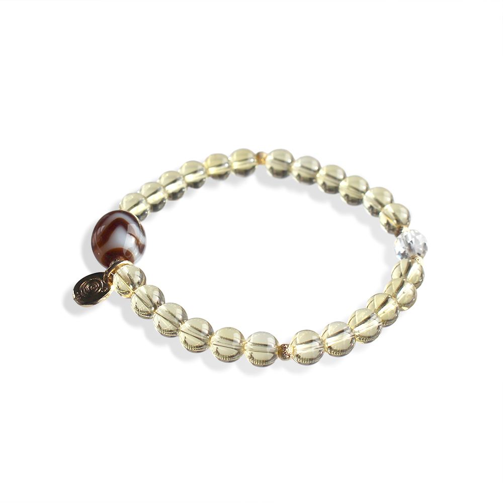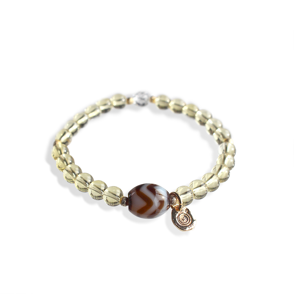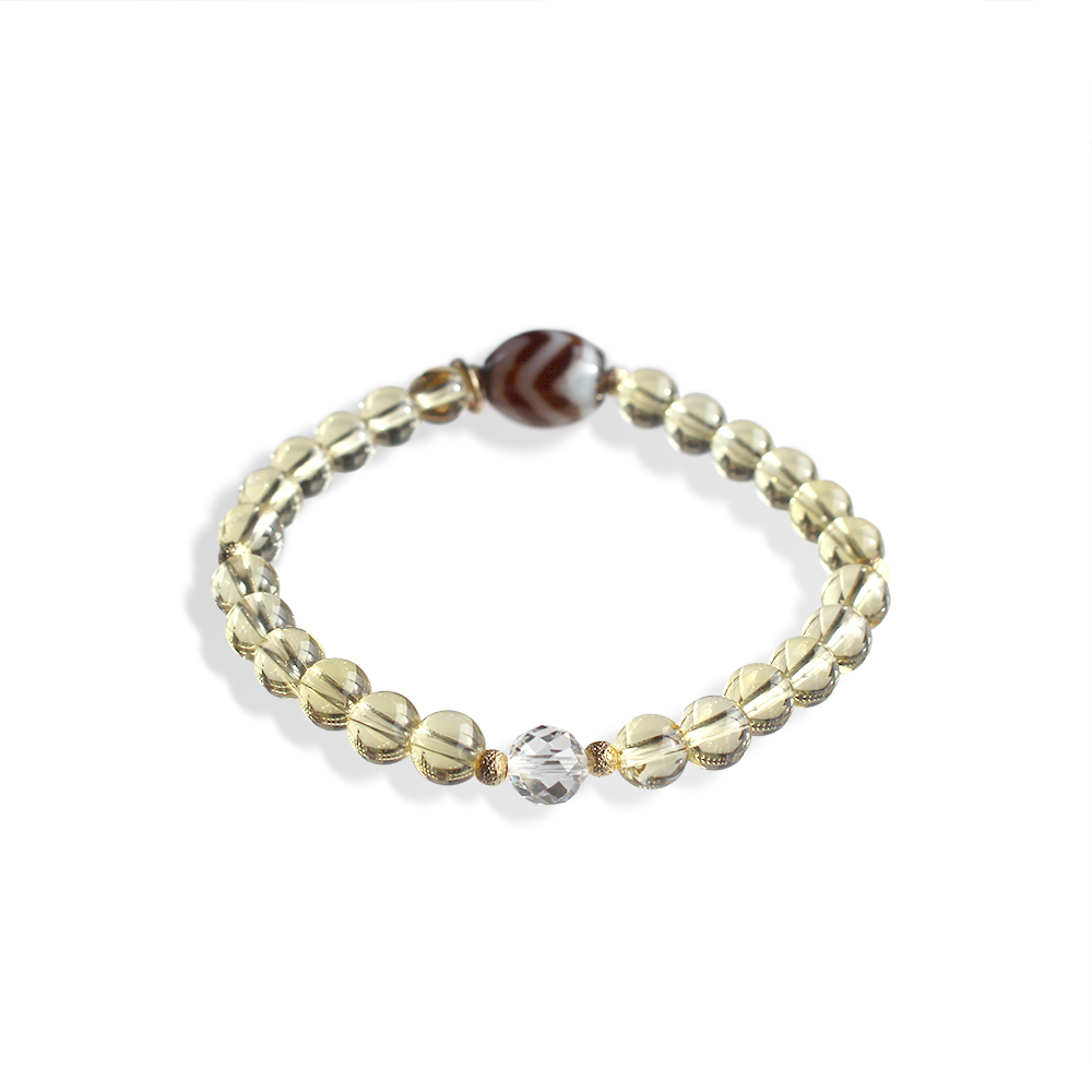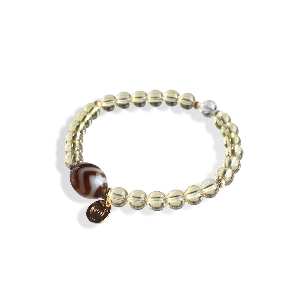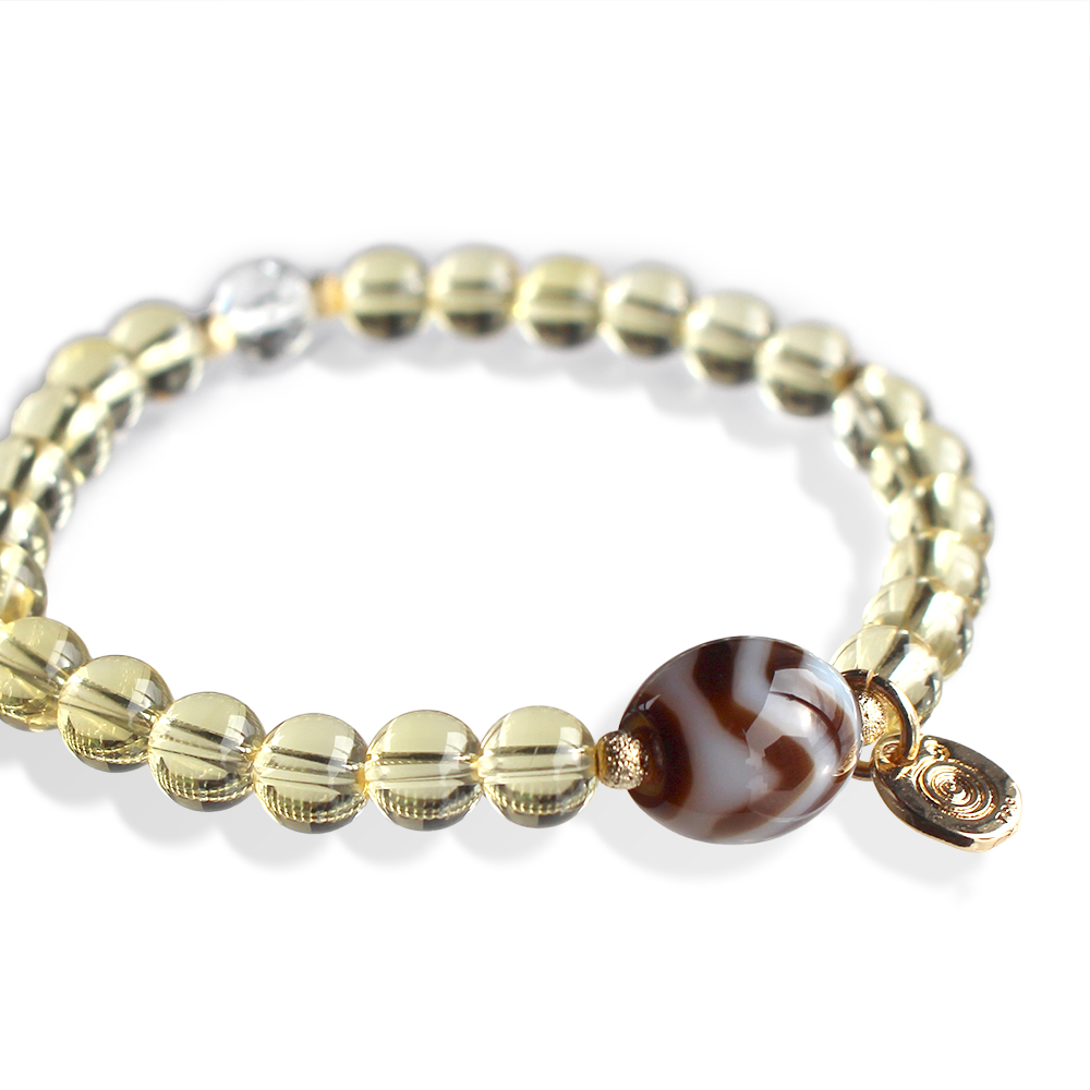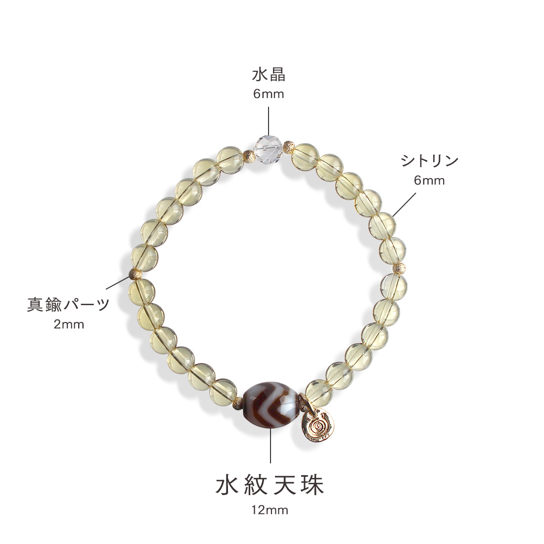 水が万物を育てるように、人や財を育てるとされ、泉のように金運が溢れ、絶えることがないといわれている水紋天珠に、太陽を象徴する石とされ、商売繁盛・事業成功・金運・財運・貯蓄運アップによいといわれているシトリン、潜在能力を活性化させ、魔除けの作用を持つ万能パワーストーンとされる水晶などを組み合わせたブレスレットです。