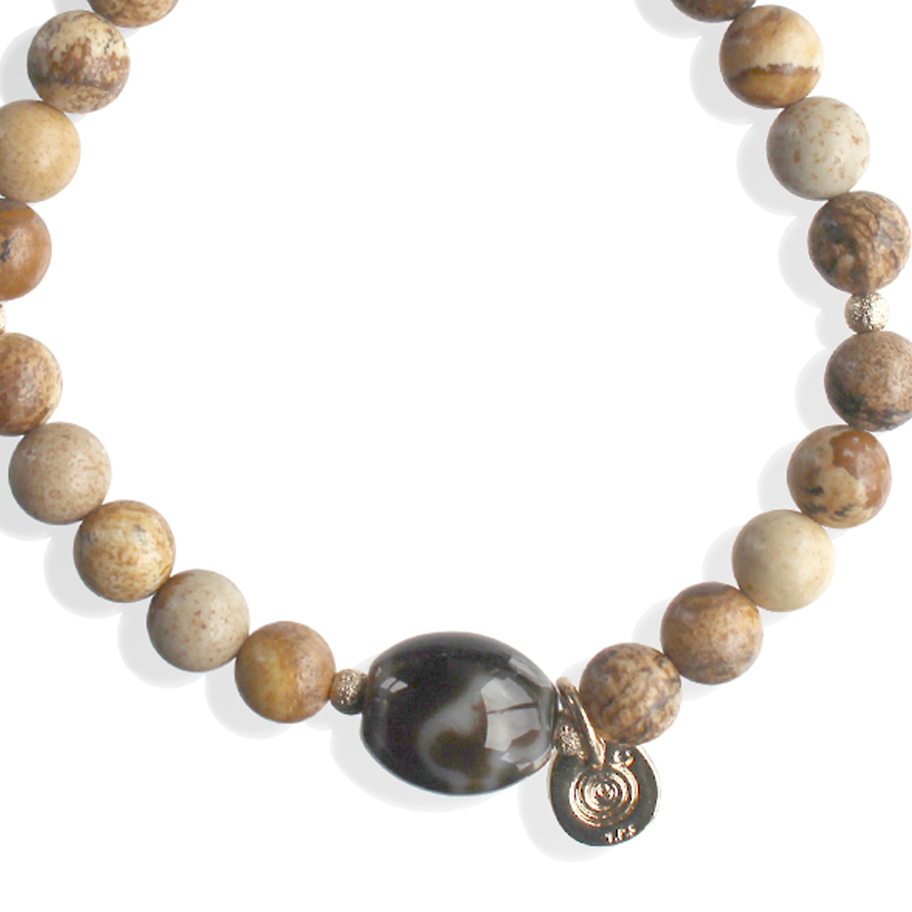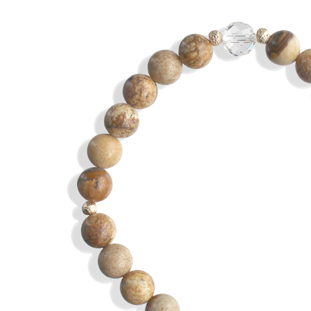 迷いや悩みを消し去り、正道へと導いてくれる。自分に自信をつけてくれるといわれている菩提天珠に、大きな一歩を踏み出す力をサポートし、仕事運・判断力・勝負運を高めるとされるピクチャージャスパー、潜在能力を活性化させ、魔除けの作用を持つ万能パワーストーンとされる水晶などを組み合わせたブレスレットです。