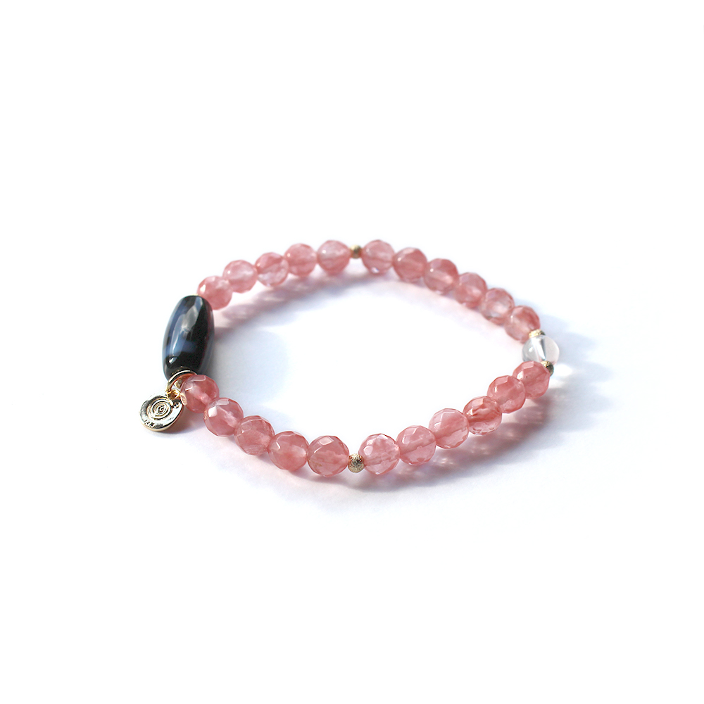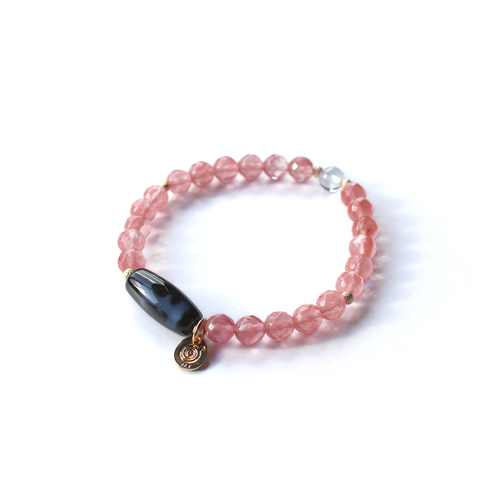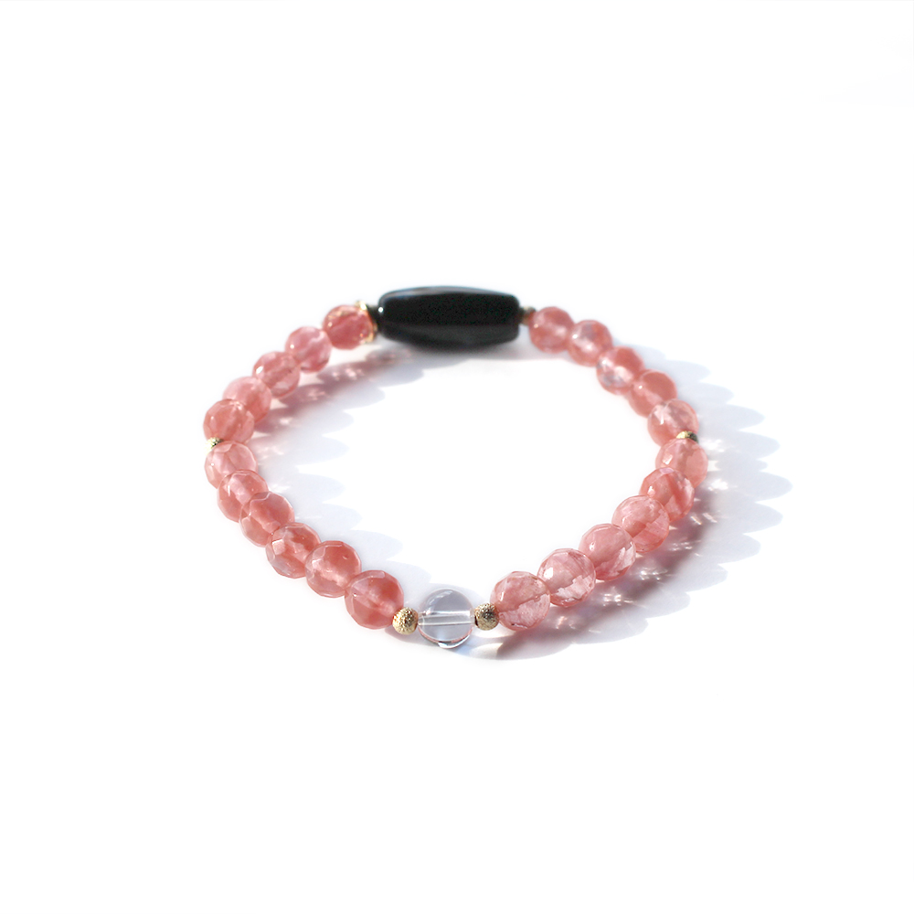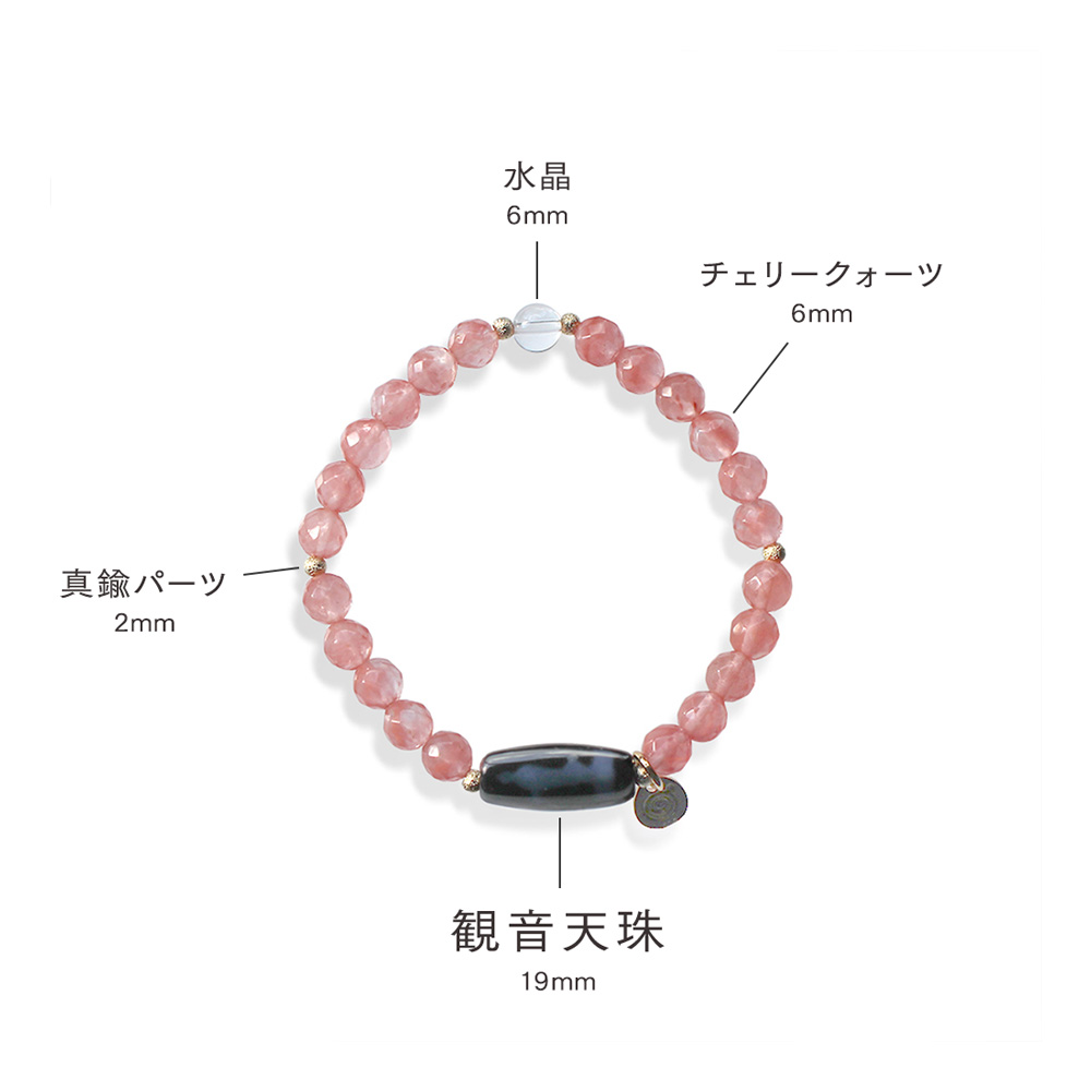 精神安定・金運招来・病魔退散・平和・幸福に導くといわれている観音天珠に、ポジティブなパワーを与え、前へ進むエネルギーを高めるとされるチェリークォーツ、潜在能力を活性化させ、魔除けの作用を持つ万能パワーストーンとされる水晶などを組み合わせたブレスレットです。
