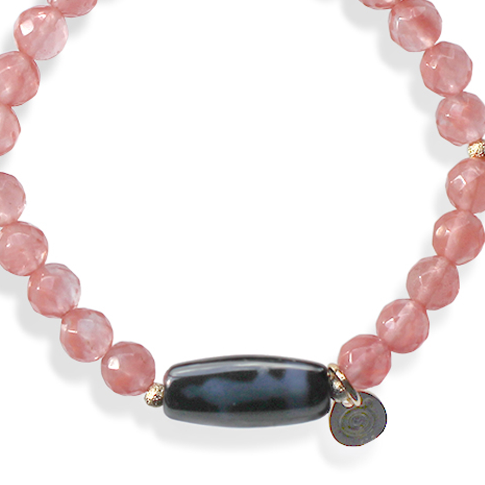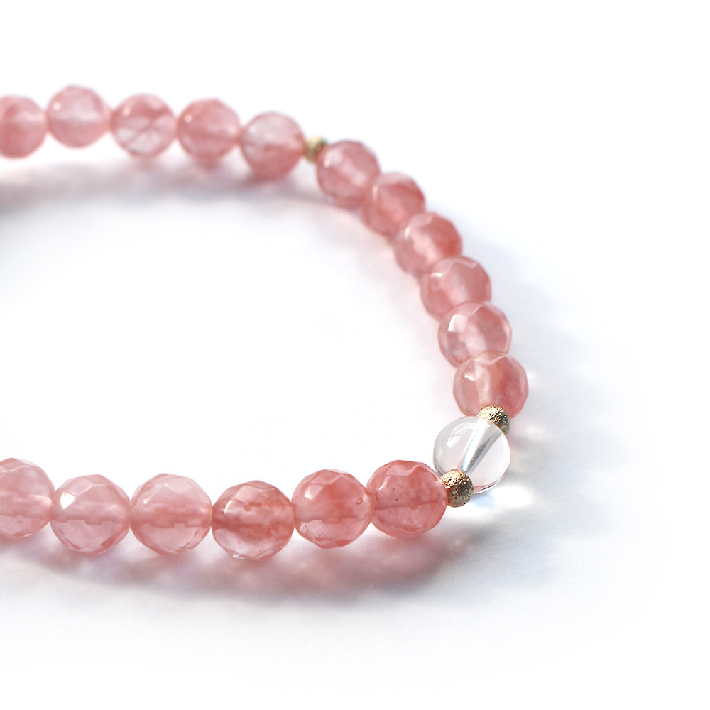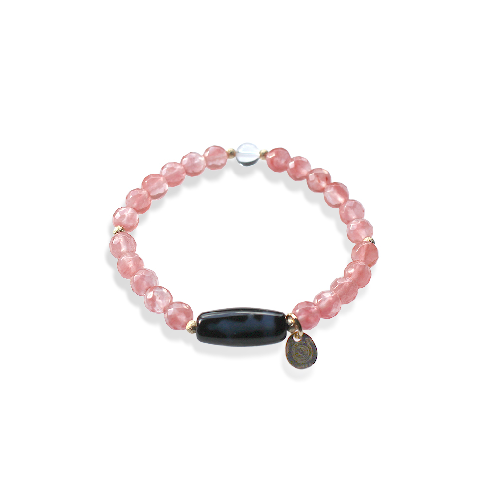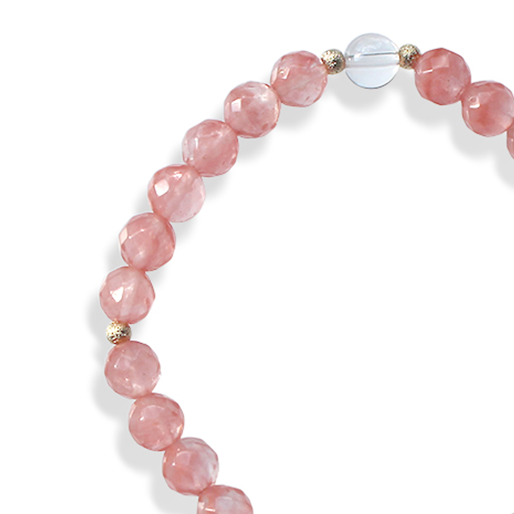 精神安定・金運招来・病魔退散・平和・幸福に導くといわれている観音天珠に、ポジティブなパワーを与え、前へ進むエネルギーを高めるとされるチェリークォーツ、潜在能力を活性化させ、魔除けの作用を持つ万能パワーストーンとされる水晶などを組み合わせたブレスレットです。