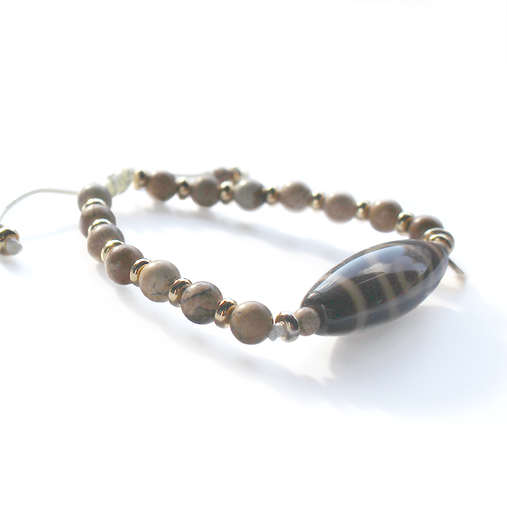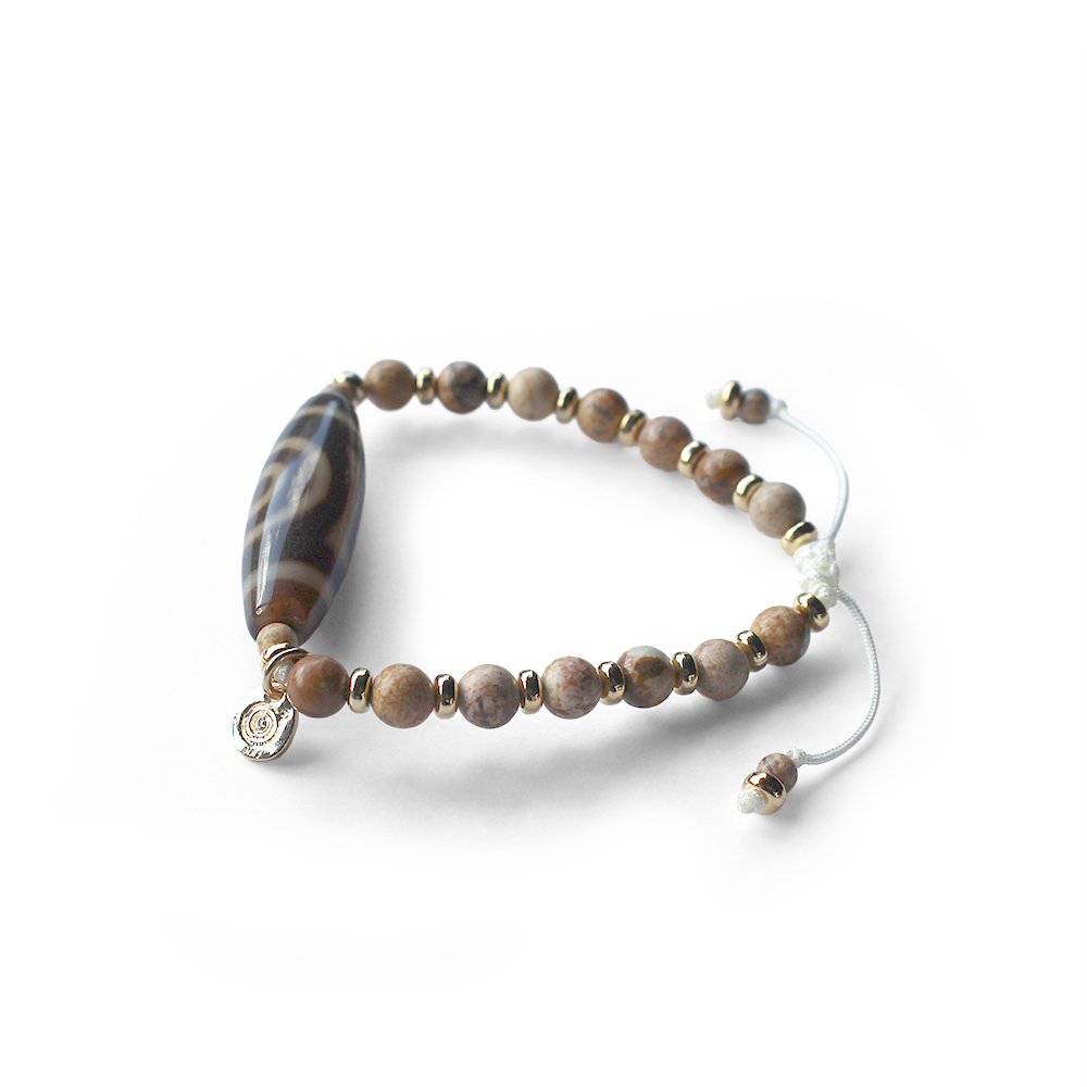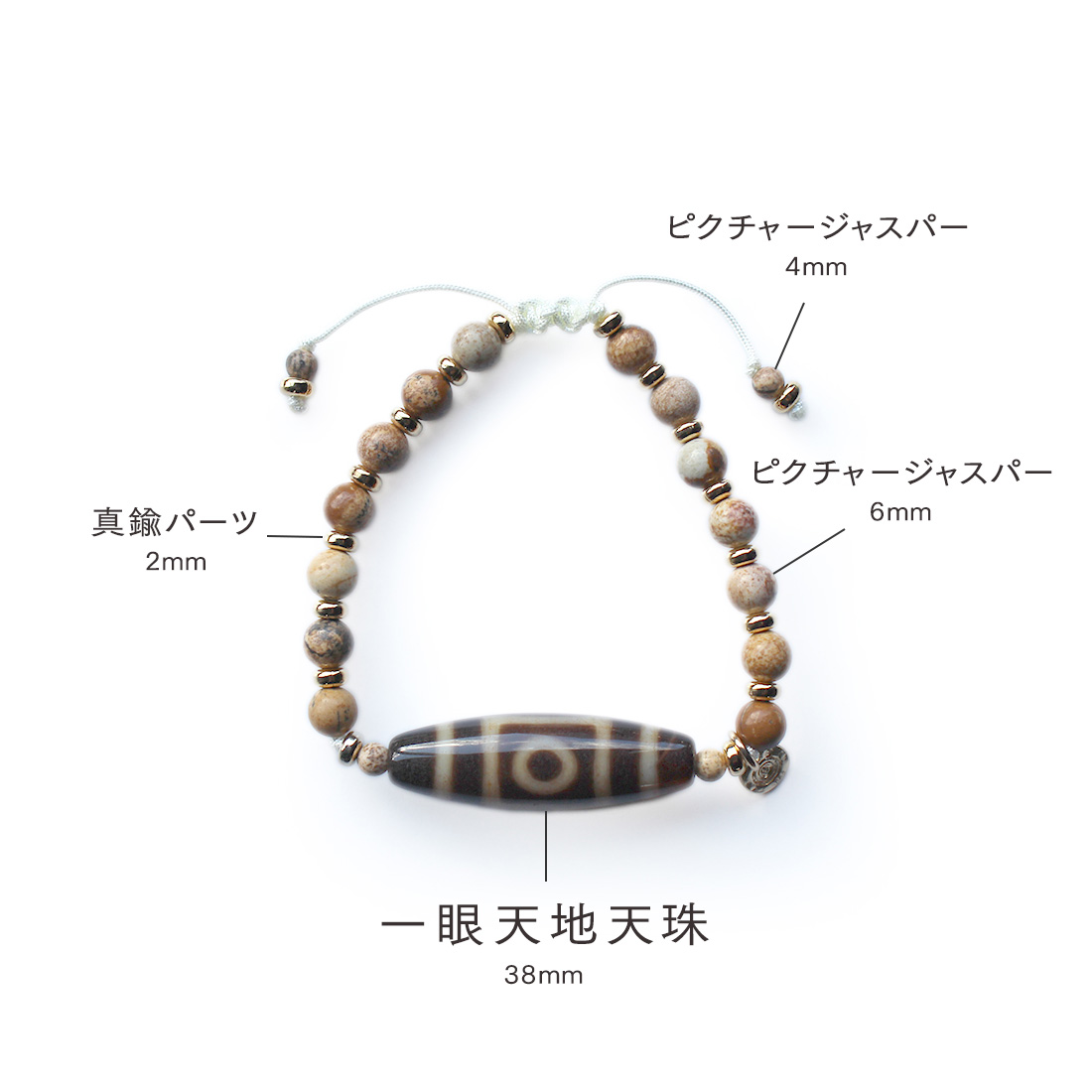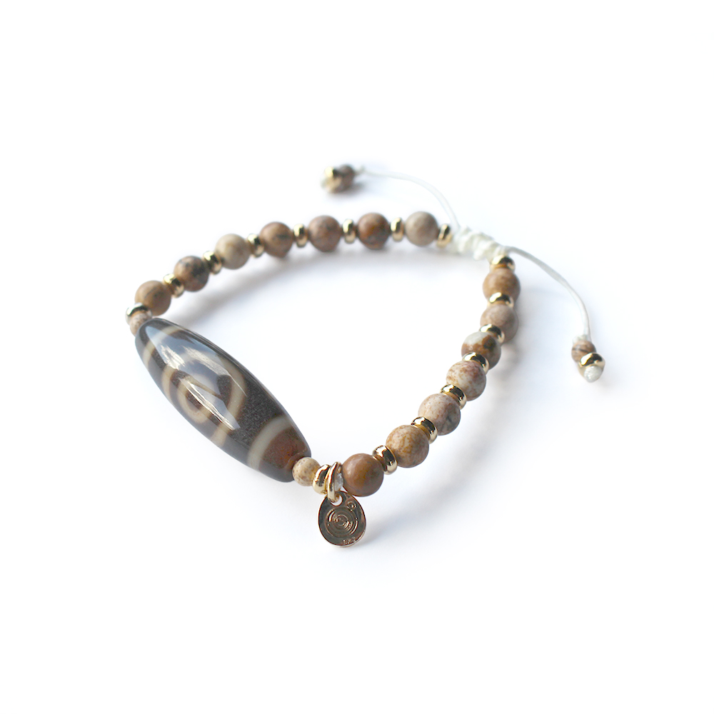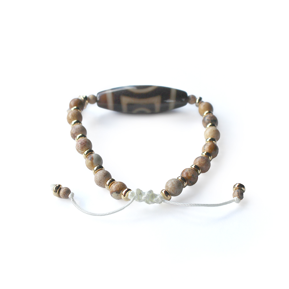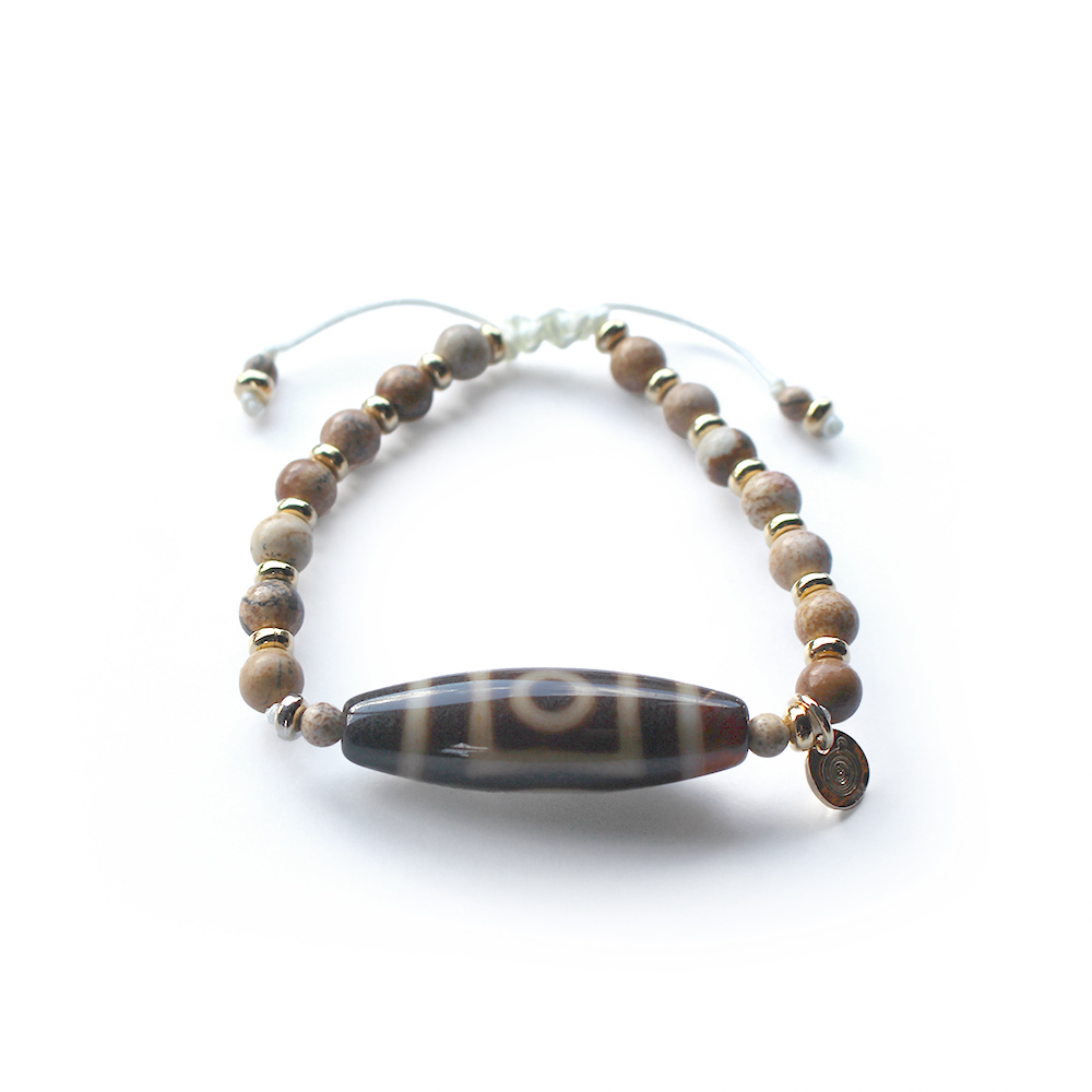 悪い運を良い運に変えるといわれる。頭脳明晰・学業向上・願望達成・平和円満・災難を消すとされ、開運などの成功に導くといわれている一眼天地天珠に、大きな一歩を踏み出す力をサポートし、仕事運・判断力・勝負運を高めるとされるピクチャージャスパーなどを組み合わせたブレスレットです。