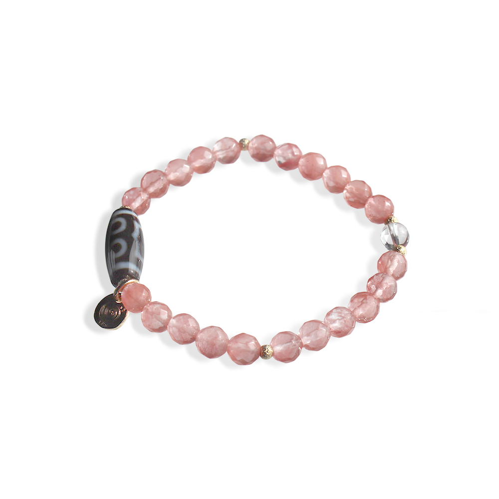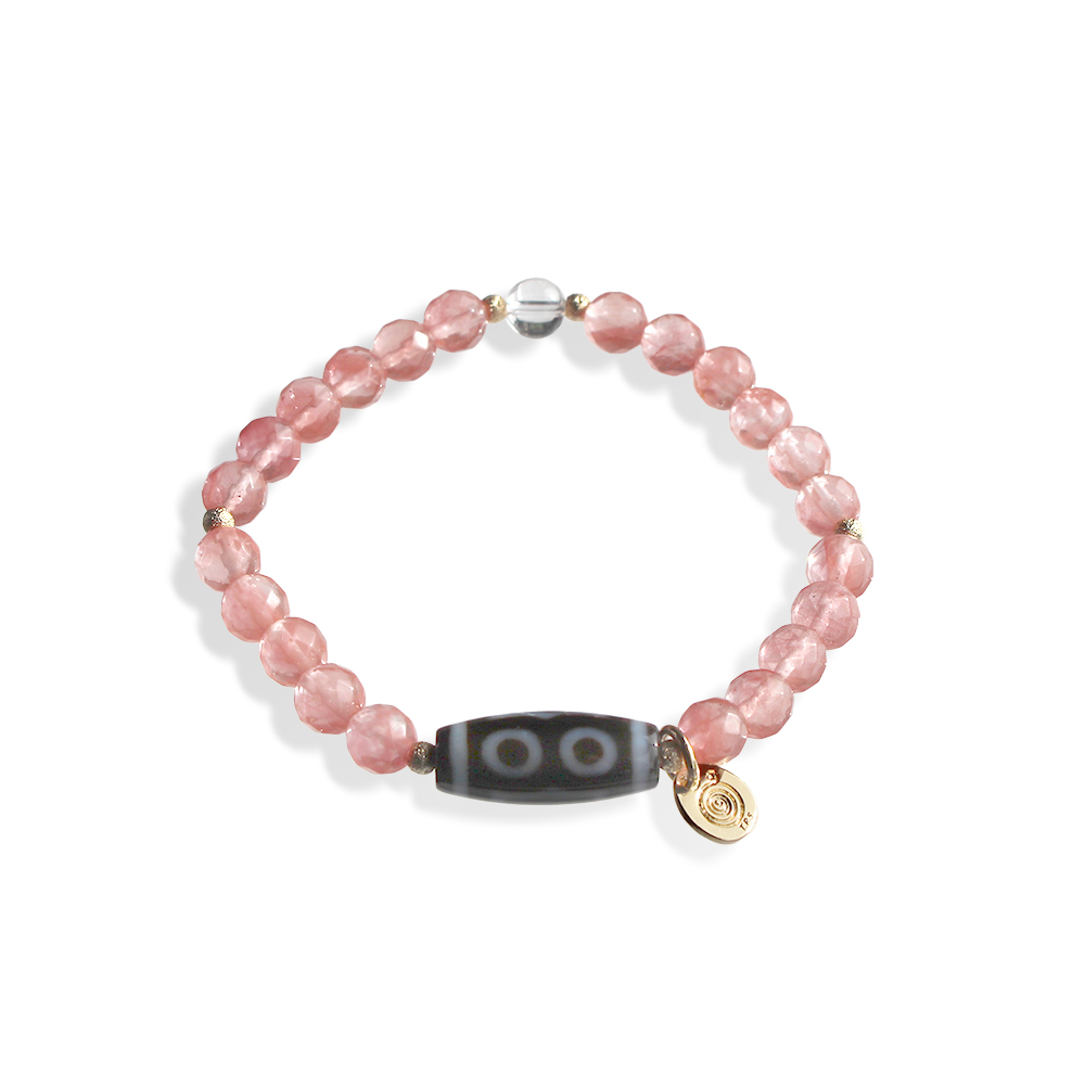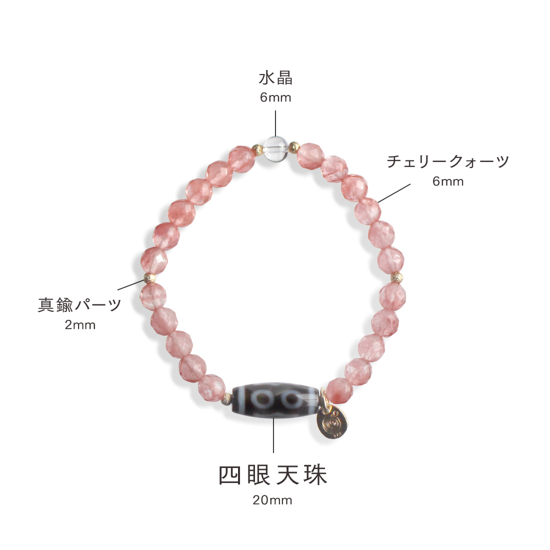 まとまりや安定を意味し、婚姻運・財産保全・学業成就に良いといわれている四眼天珠に、ポジティブなパワーを与え、前へ進むエネルギーを高めるとされるチェリークォーツ、潜在能力を活性化させ、魔除けの作用を持つ万能パワーストーンとされる水晶などを組み合わせたブレスレットです。