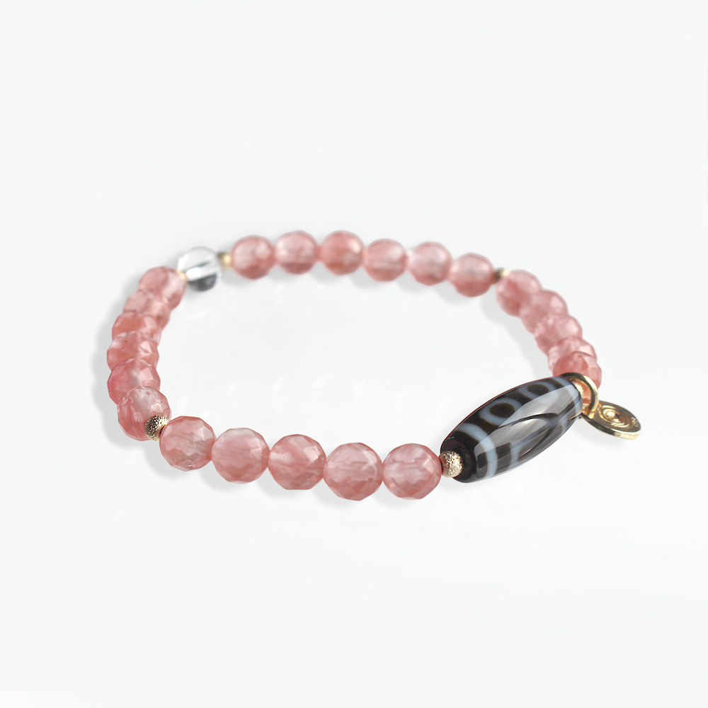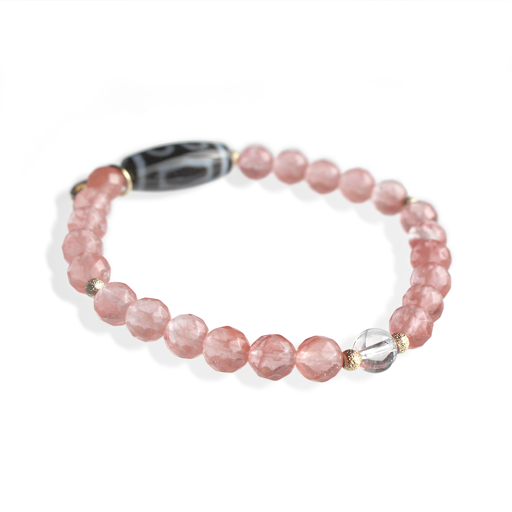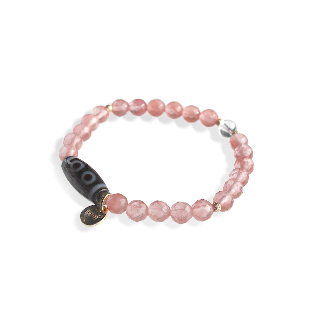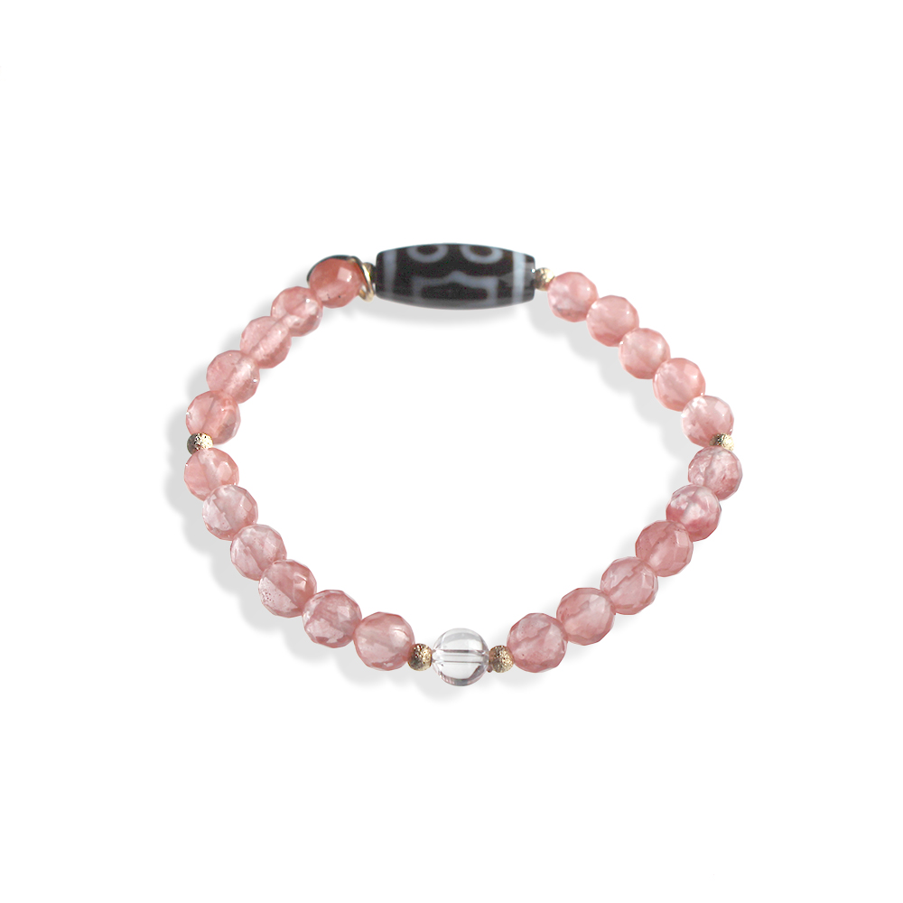 まとまりや安定を意味し、婚姻運・財産保全・学業成就に良いといわれている四眼天珠に、ポジティブなパワーを与え、前へ進むエネルギーを高めるとされるチェリークォーツ、潜在能力を活性化させ、魔除けの作用を持つ万能パワーストーンとされる水晶などを組み合わせたブレスレットです。