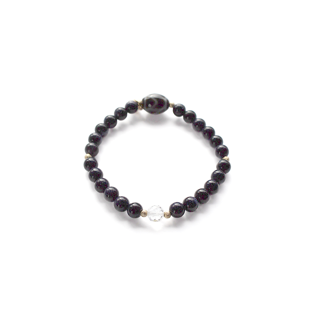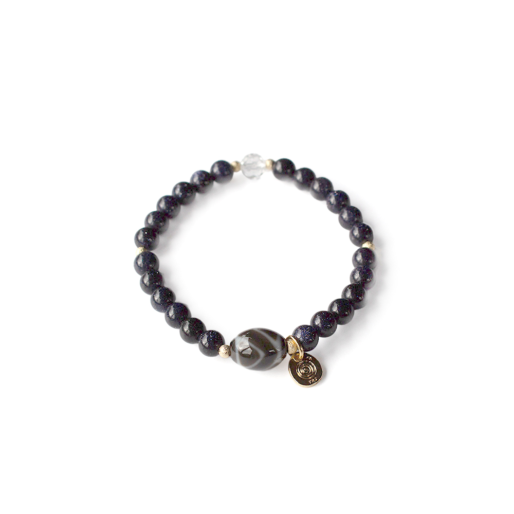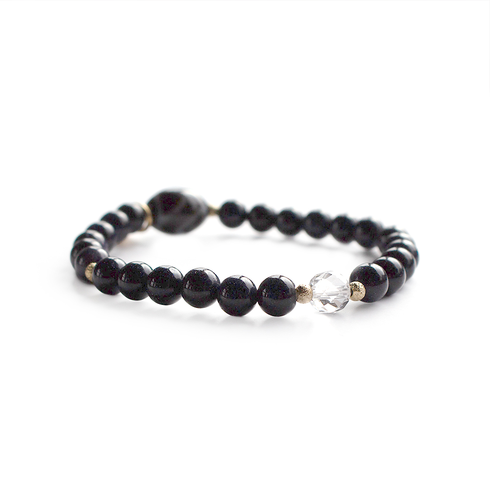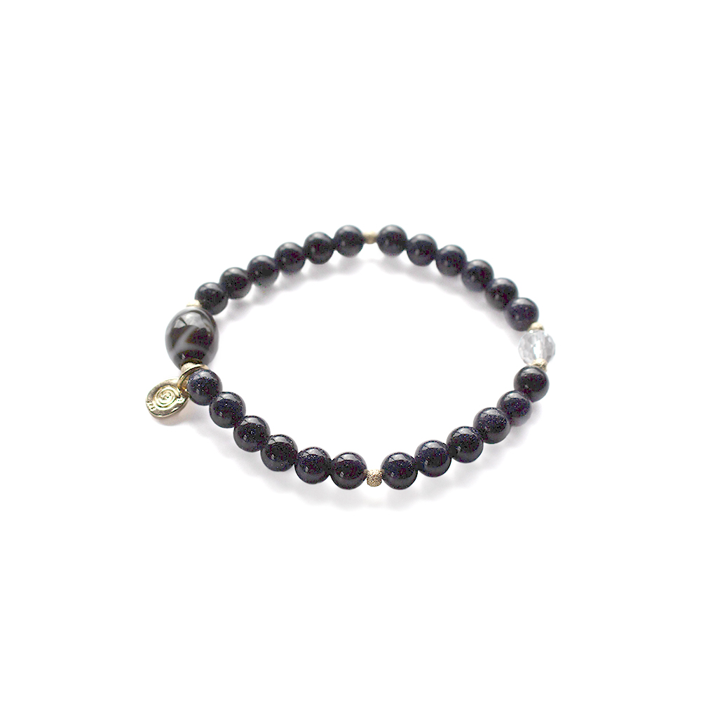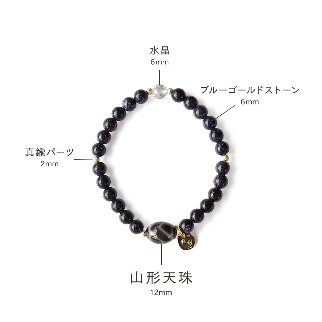 抱えている問題や障害を乗り越え、平穏な日々が歩めるようになるといわれている山形天珠に、自信を生み出し、人・物との出会いやチャンスを与えるとされるブルーゴールドストーン、潜在能力を活性化させ、魔除けの作用を持つ万能パワーストーンとされる水晶などを組み合わせたブレスレットです。