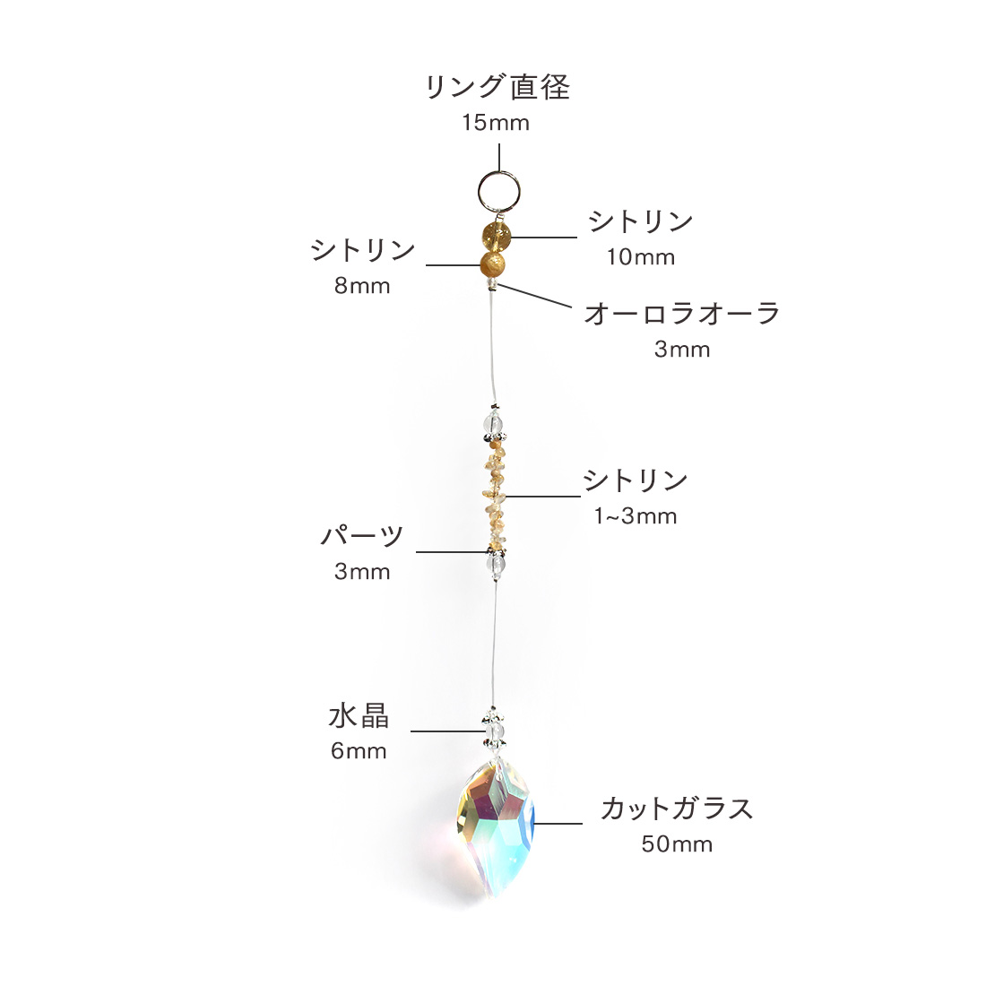 太陽を象徴する石とされ、商売繁盛・事業成功・金運・財運・貯蓄運アップによいといわれているシトリン、潜在能力を活性化させ、魔除けの作用を持つ万能パワーストーンとされる水晶、夢や目標に向かって、一歩踏み出す力を与えるとされるオーロラオーラなどを組み合わせたサンキャッチャーです。