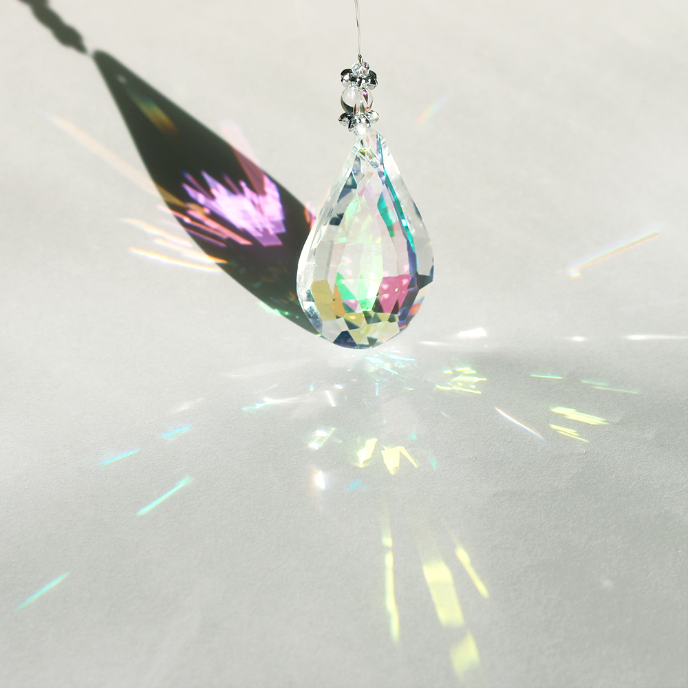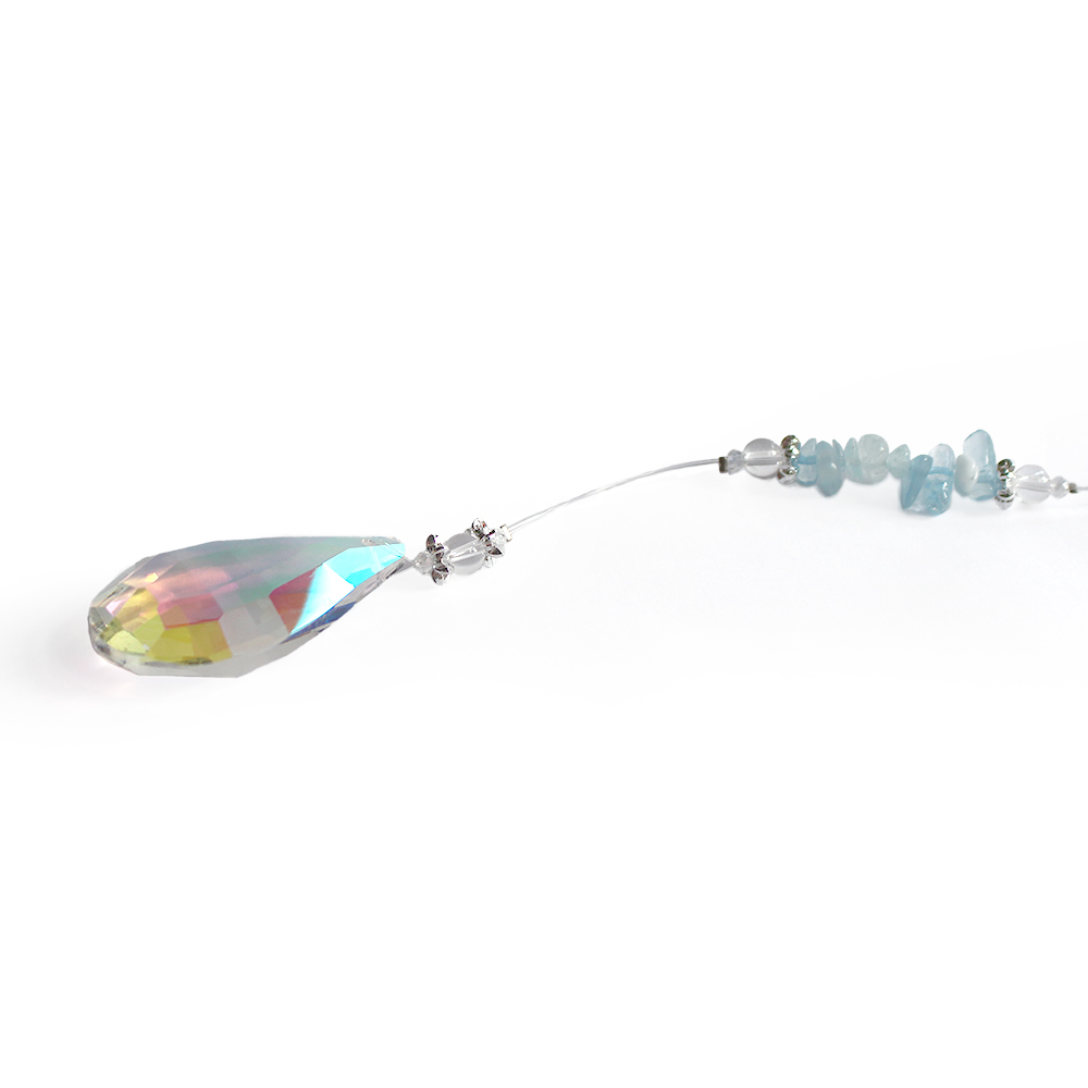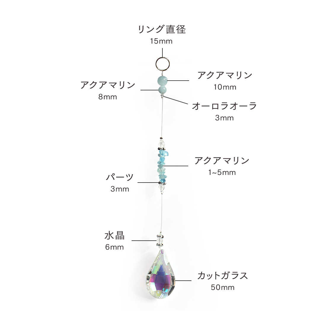 清らかな癒しのエネルギーで満たしてくれるとされるアクアマリン、潜在能力を活性化させ、魔除けの作用を持つ万能パワーストーンとされる水晶、夢や目標に向かって、一歩踏み出す力を与えるとされるオーロラオーラなどを組み合わせたサンキャッチャーです。