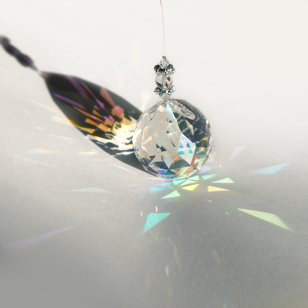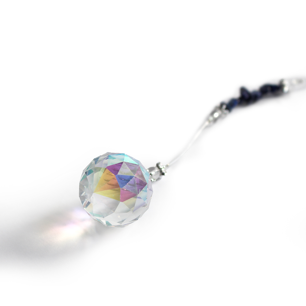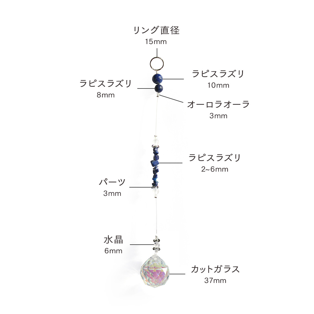 世界最初のパワーストーンとされ、魔除けの作用や幸運を招き願い事を叶えるといわれるラピスラズリ、潜在能力を活性化させ、魔除けの作用を持つ万能パワーストーンとされる水晶、夢や目標に向かって、一歩踏み出す力を与えるとされるオーロラオーラなどを組み合わせたサンキャッチャーです。