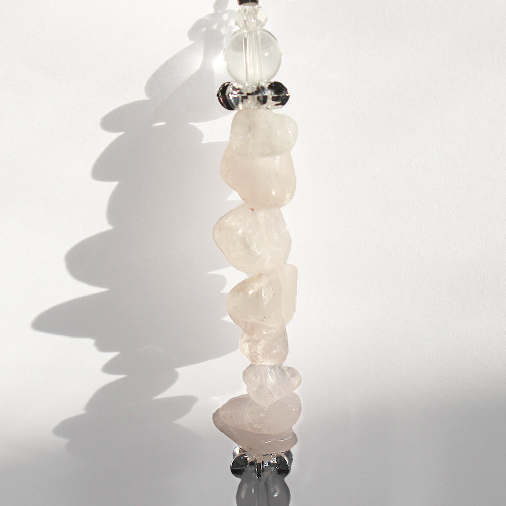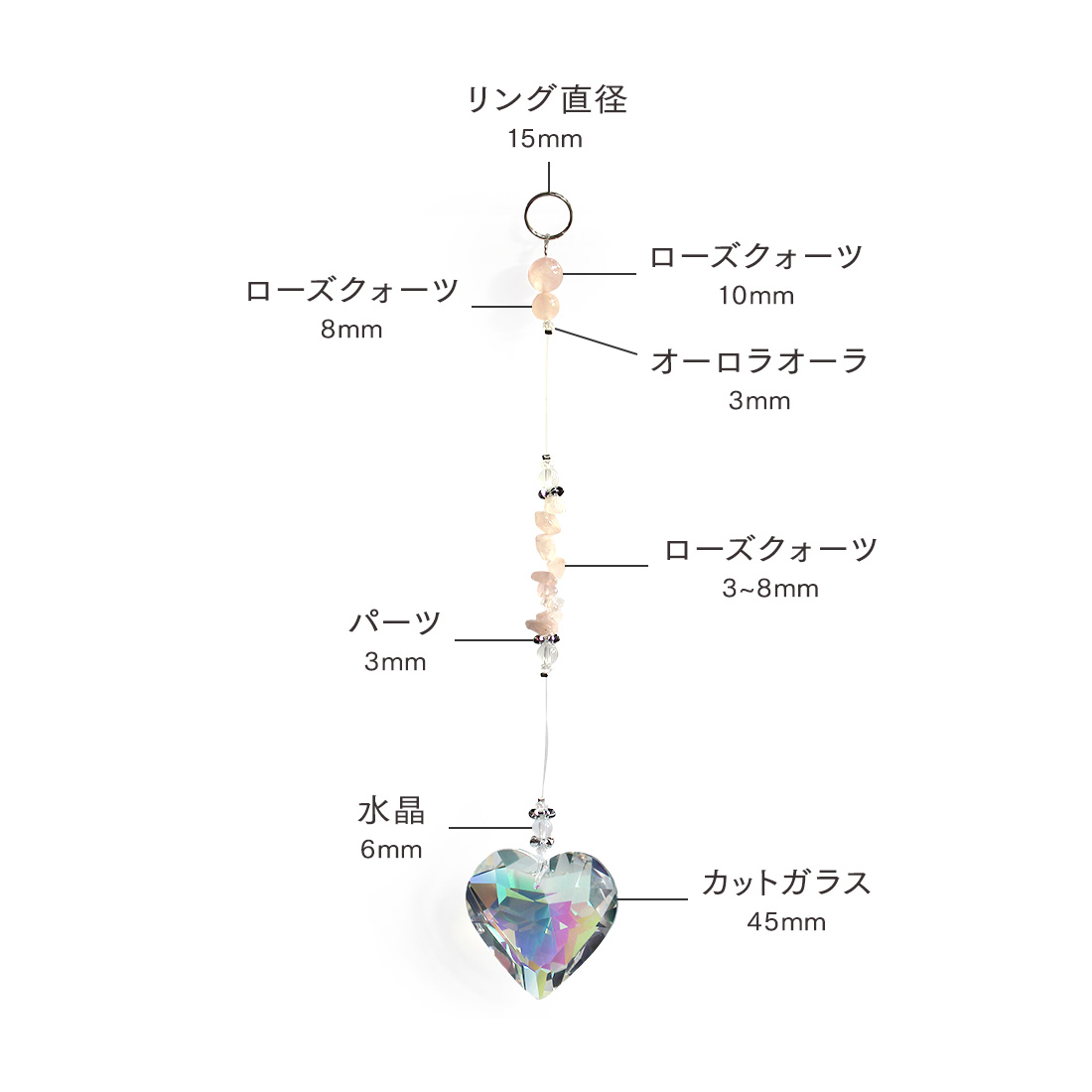 愛の成就・若返りなど、愛と癒しの象徴。美的感覚向上、心身安定によいといわれているローズクォーツ、潜在能力を活性化させ、魔除けの作用を持つ万能パワーストーンとされる水晶、夢や目標に向かって、一歩踏み出す力を与えるとされるオーロラオーラなどを組み合わせたサンキャッチャーです。