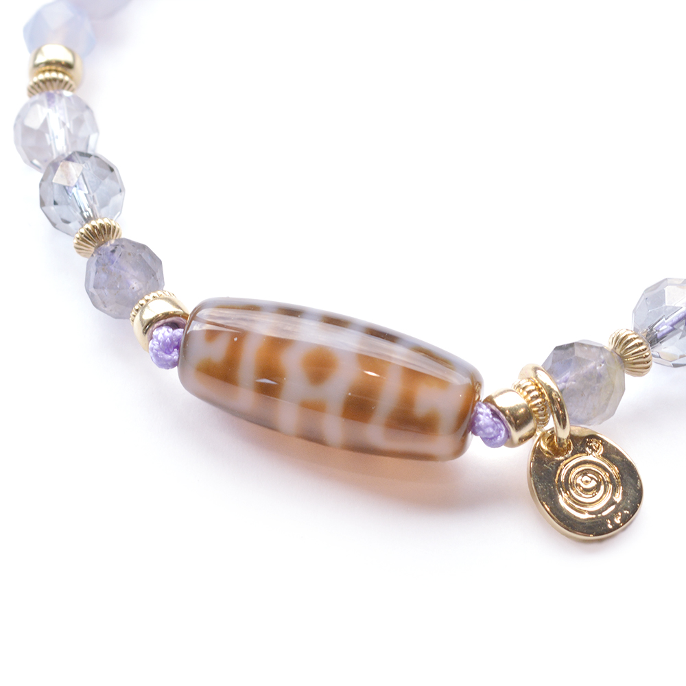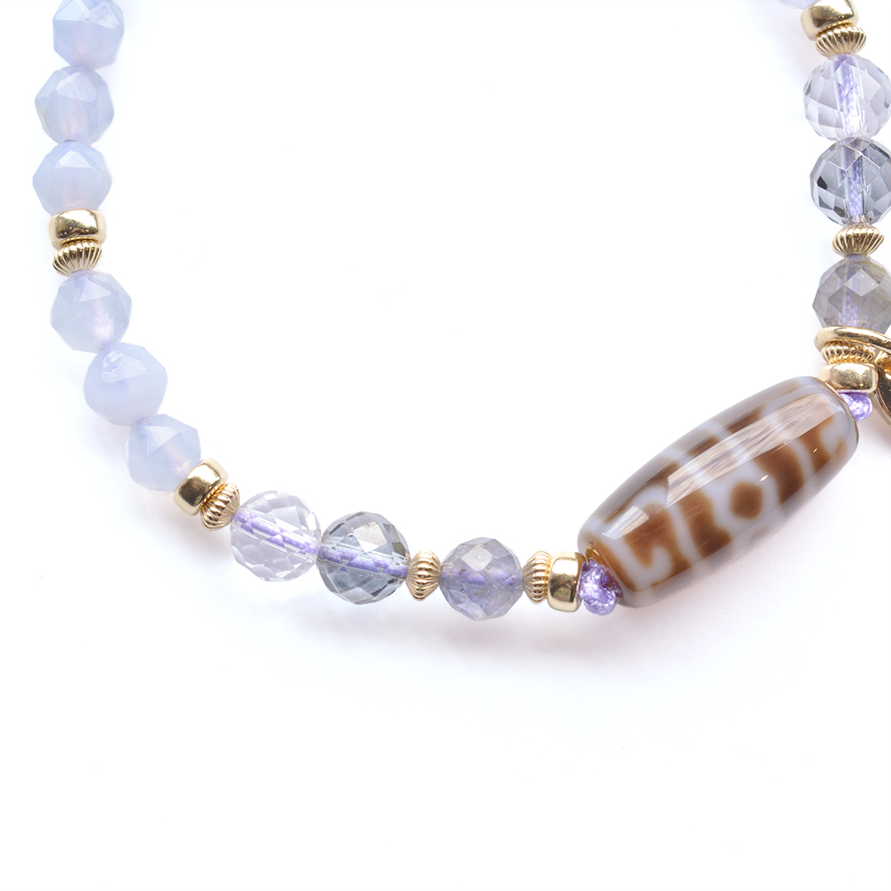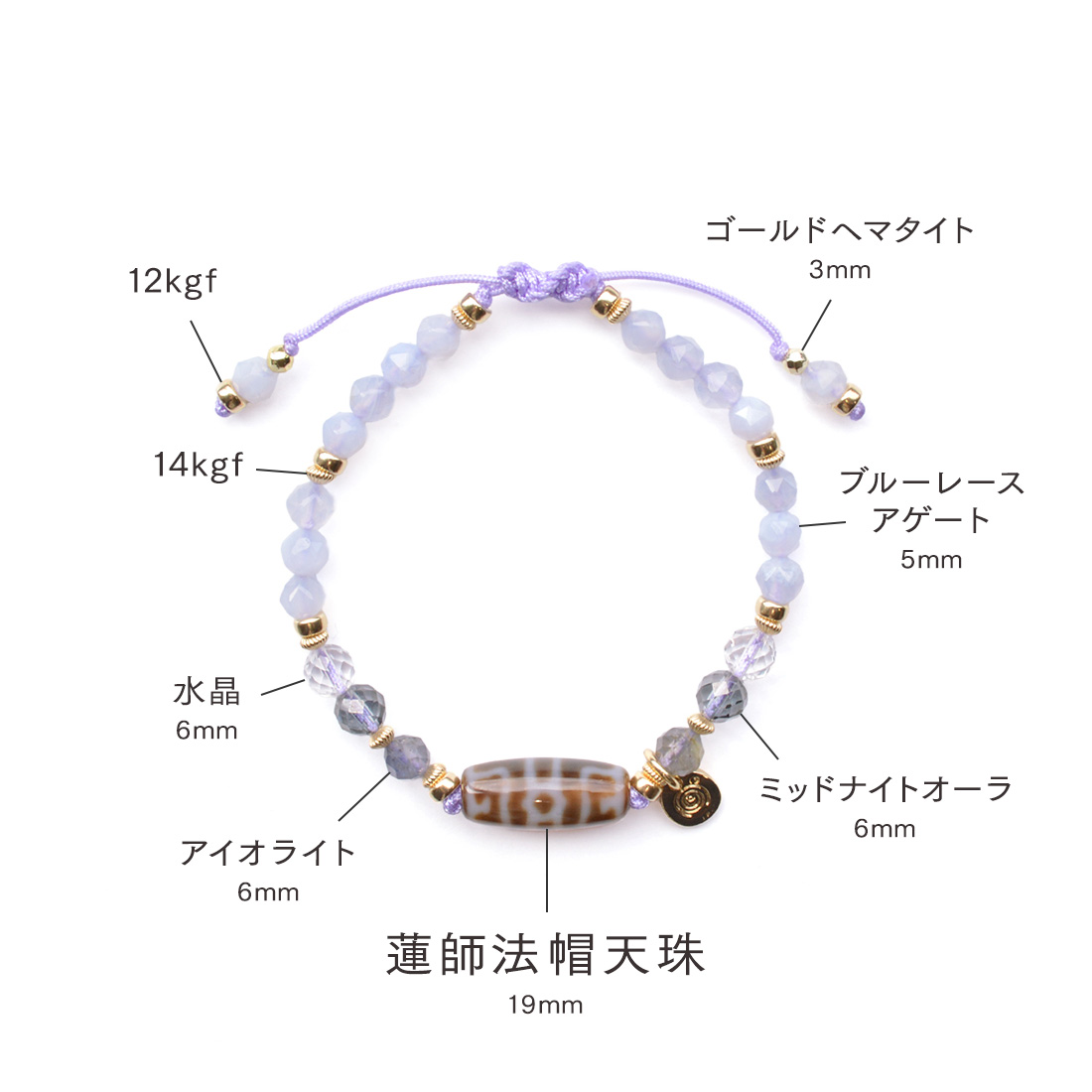 チベット高僧がかぶる帽子を表す。知恵や功名を授かるといわれている蓮師法帽天珠に、古くから神の石として崇められてきた石であり、癒しを与えるとされるブルーレースアゲートなどを組み合わせたブレスレットです。
