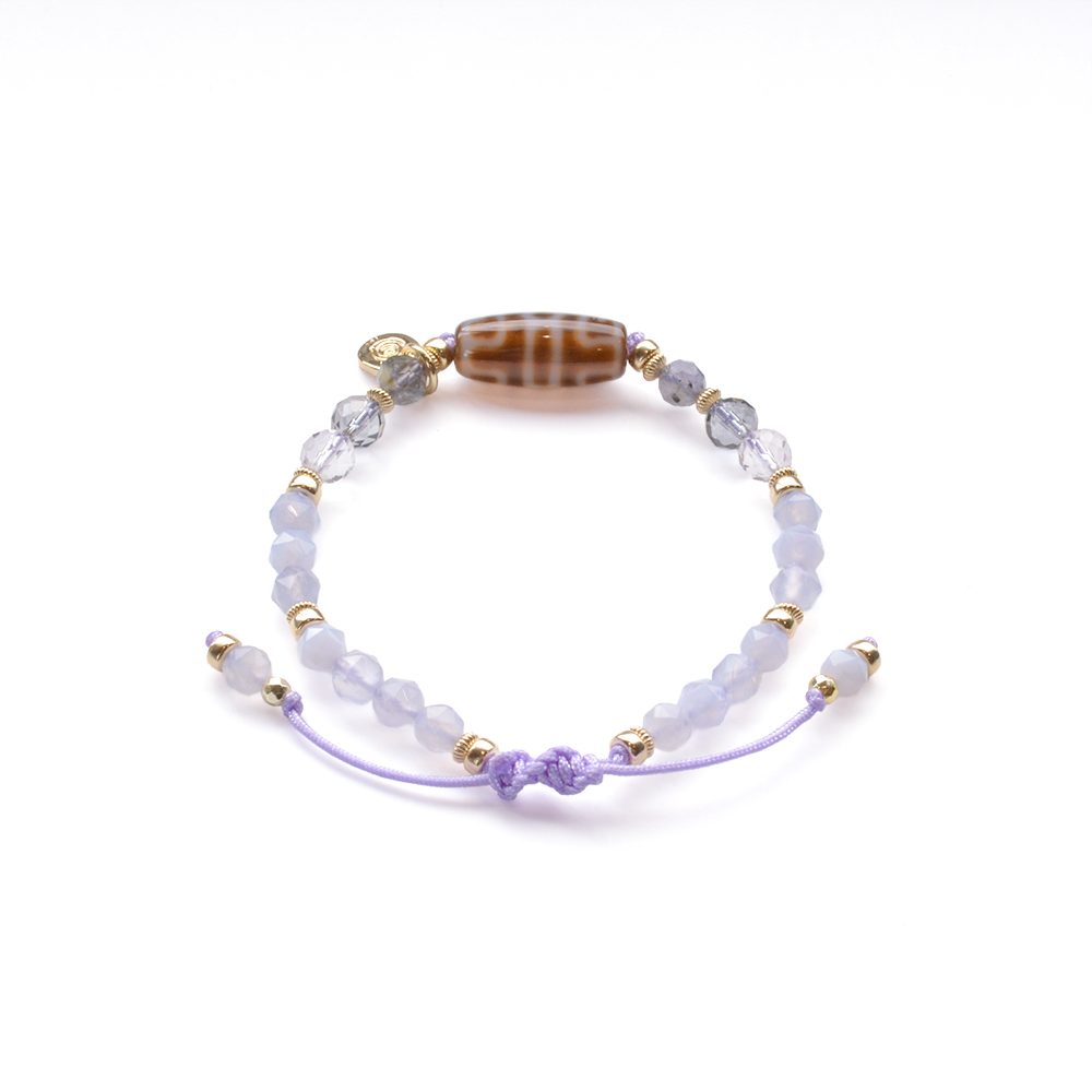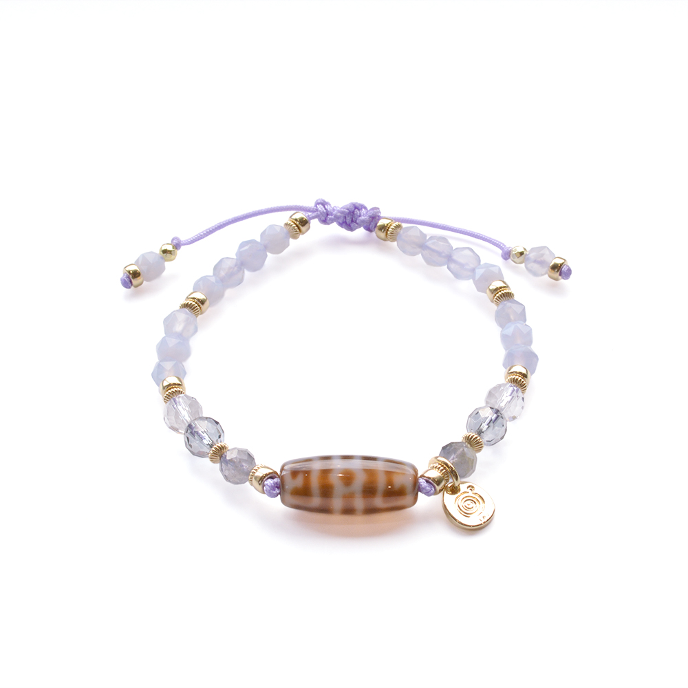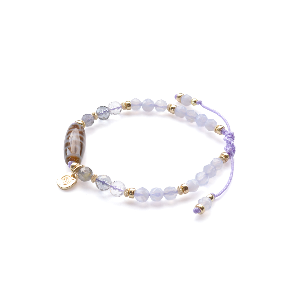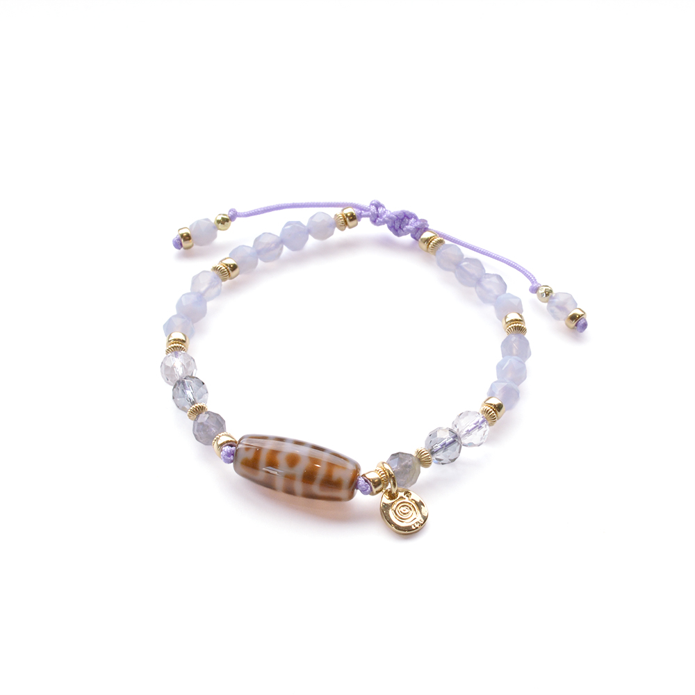 チベット高僧がかぶる帽子を表す。知恵や功名を授かるといわれている蓮師法帽天珠に、古くから神の石として崇められてきた石であり、癒しを与えるとされるブルーレースアゲートなどを組み合わせたブレスレットです。