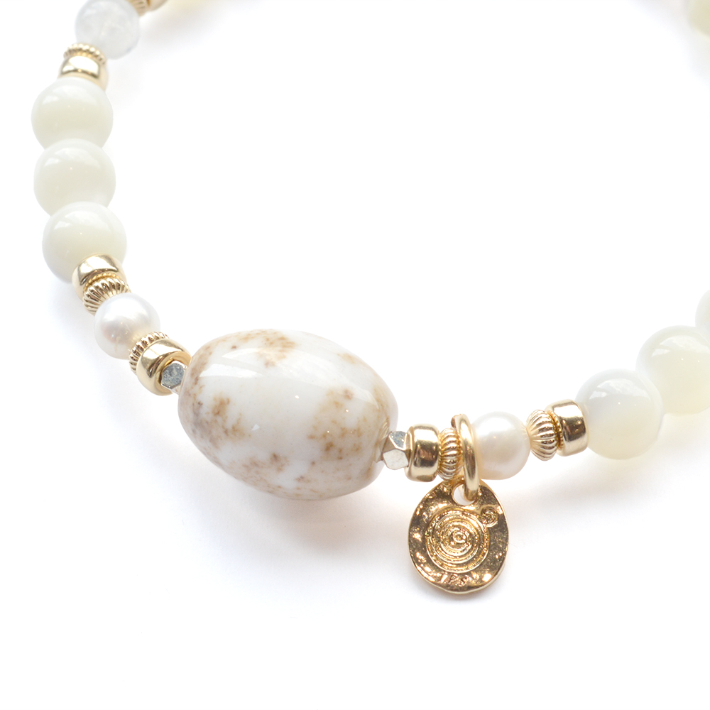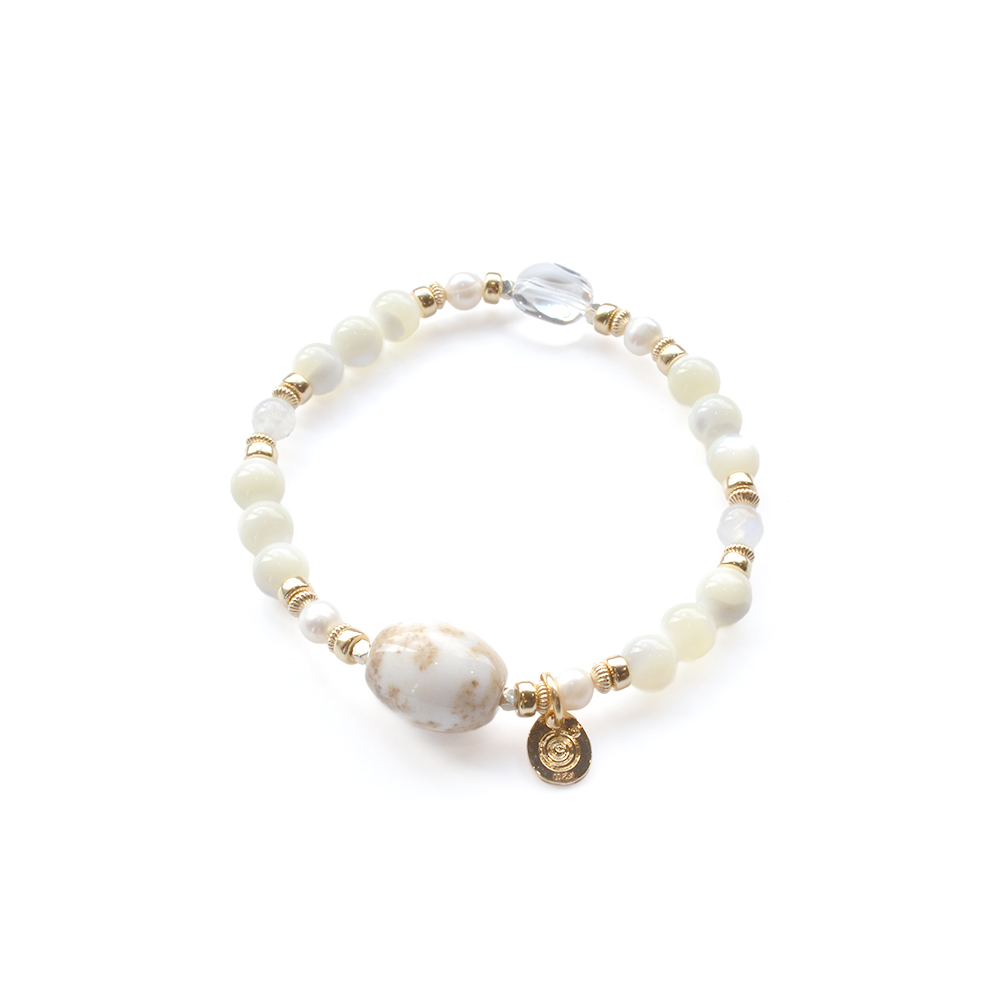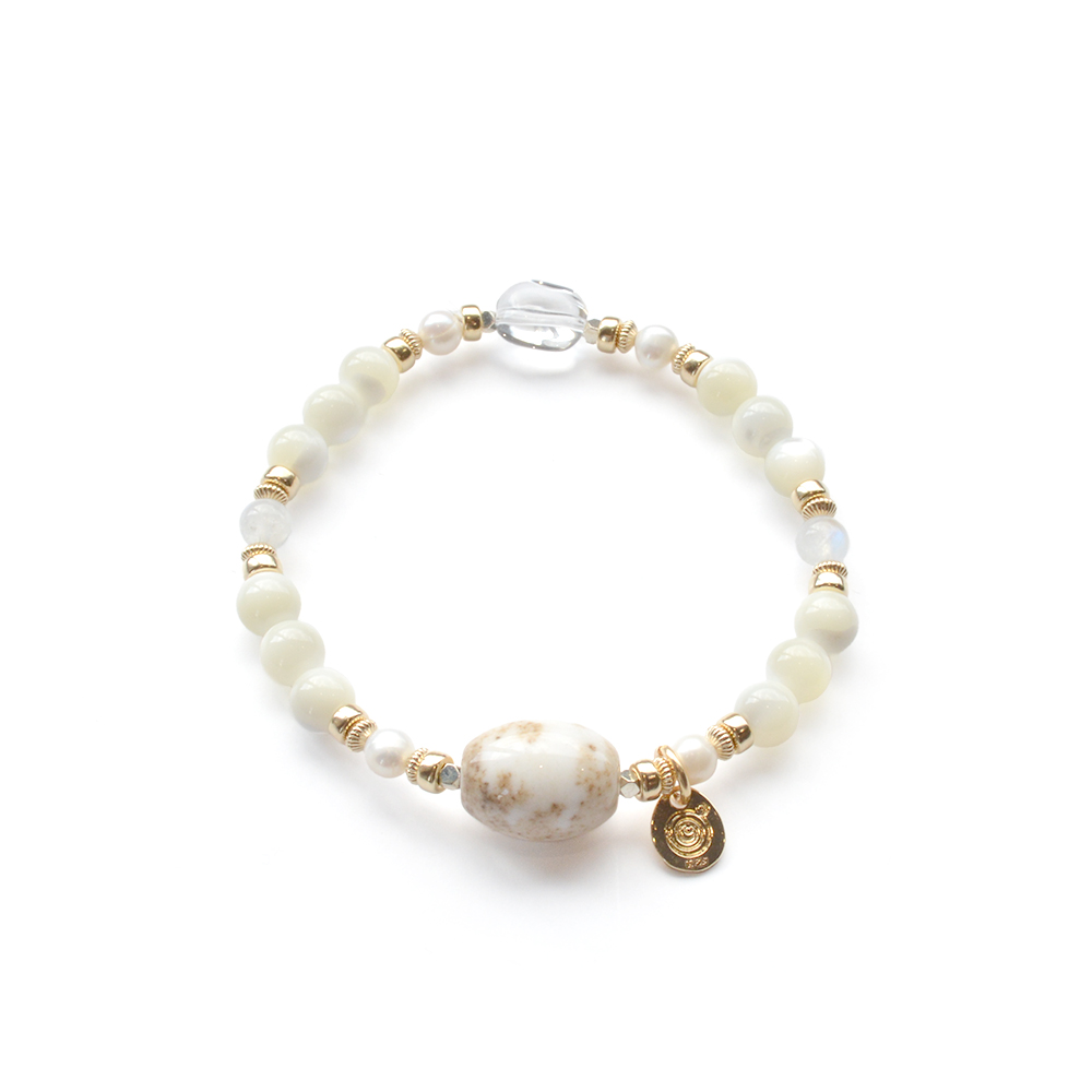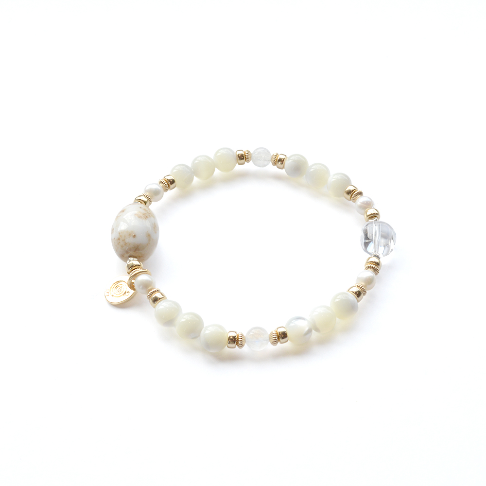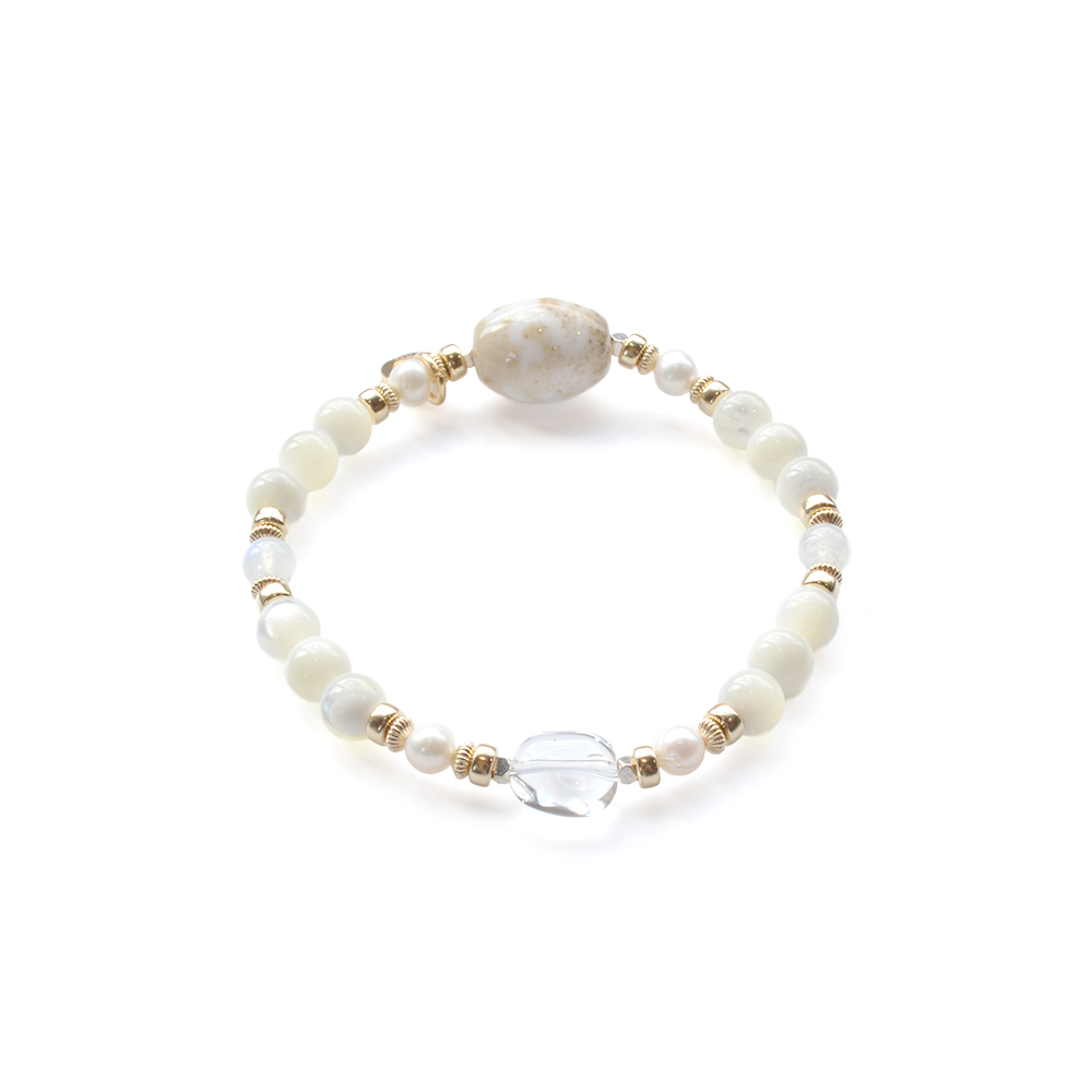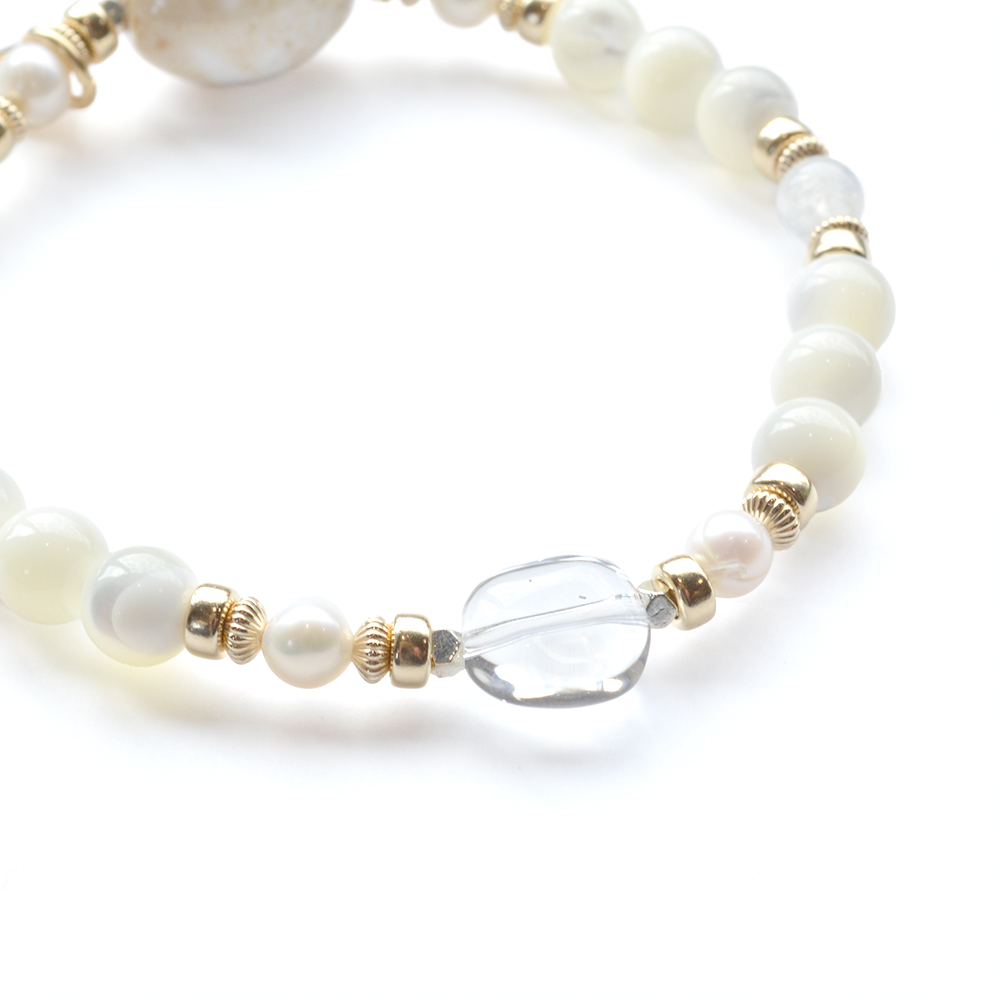 潜在能力を活性化させ、魔除けの作用を持つ万能パワーストーンとされる水晶、美の象徴とされ、女性のステータスを上げるといわれているパール、意識の変革や静かな直観力・洞察力を養うとされ幸運を呼び込むといわれるレインボームーンストーンなどを組み合わせました。