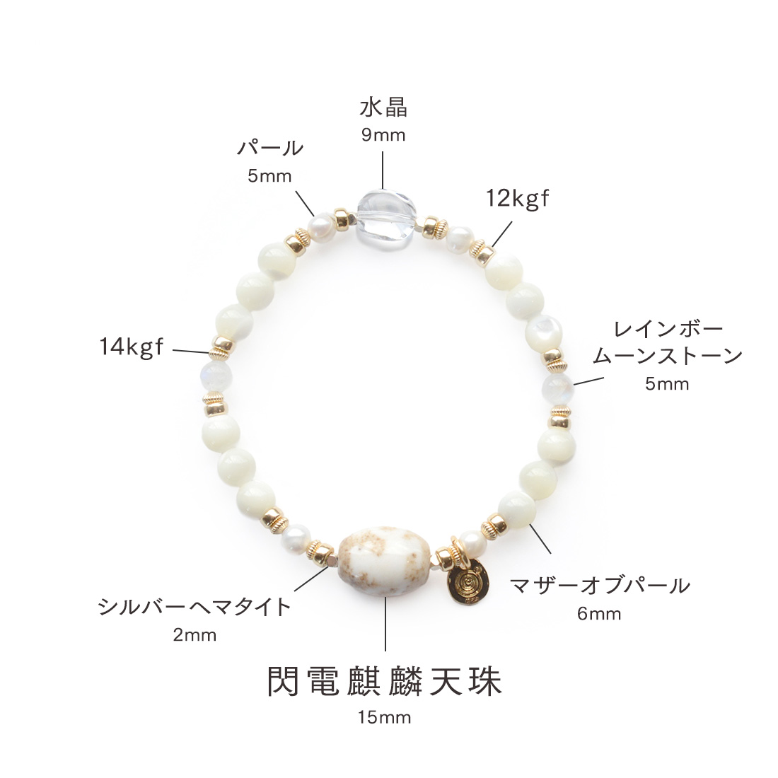 「麒」が雄、「麟」が雌を表し、夫婦円満の象徴とされ、運勢が急速に上昇し宝くじ運なども高まるといわれる閃電麒麟天珠に、子宝や繁栄の象徴として、女性の魅力を高める石とされるマザーオブパールなどを組み合わせたブレスレットです。