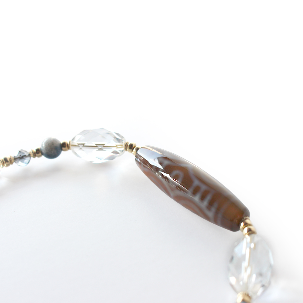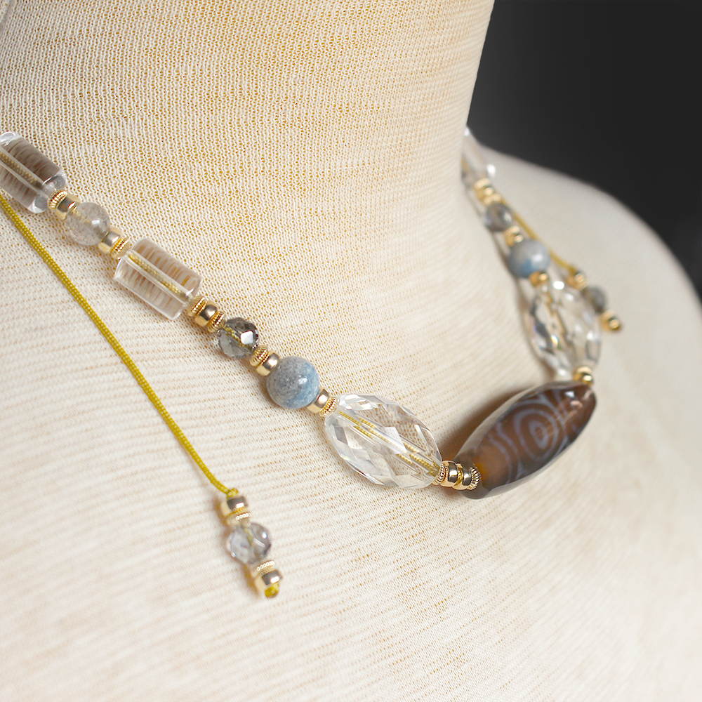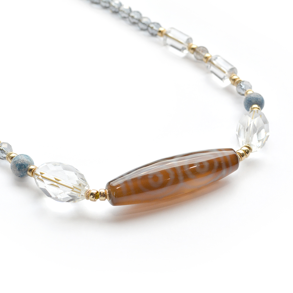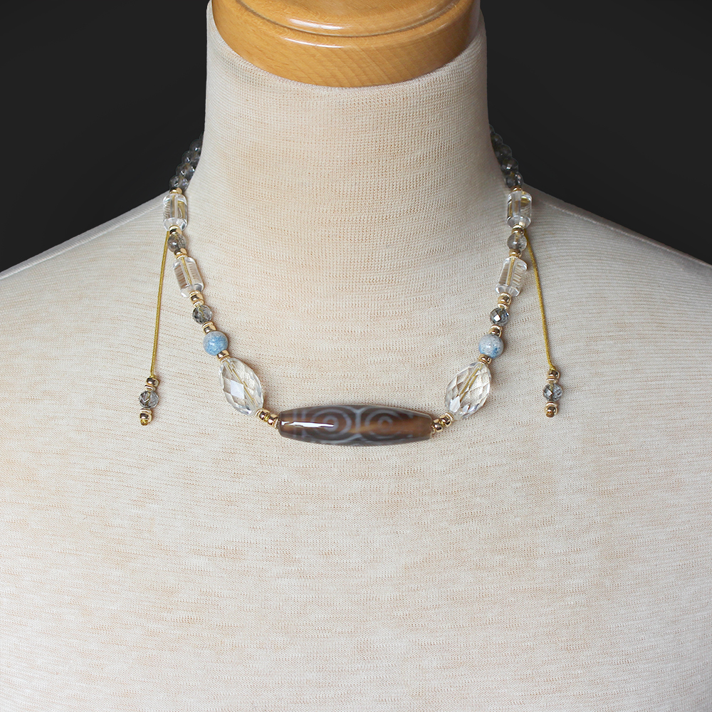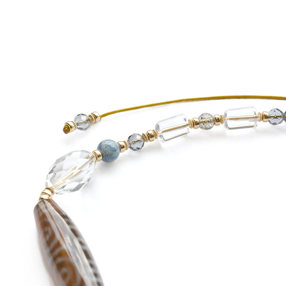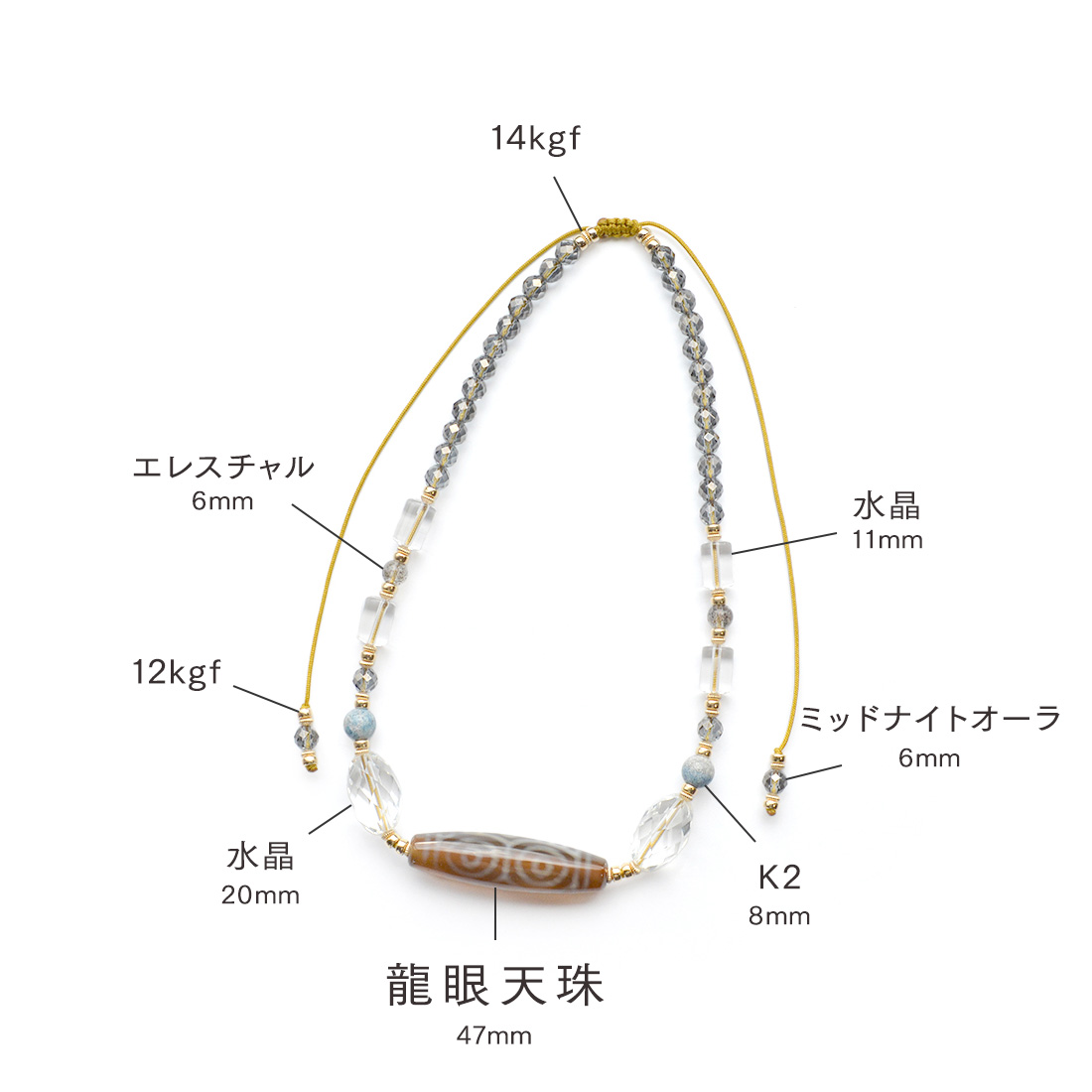 あらゆる運気が向上。苦難を排除し、特に権力・富財が増大するといわれている龍眼天珠に、潜在能力を開花させ、総合的に運気を好転させるといわれているエレスチャル、自身の成長を促し、自信を与えてくれるといわれるミッドナイトオーラなどを組み合わせたネックレスです。