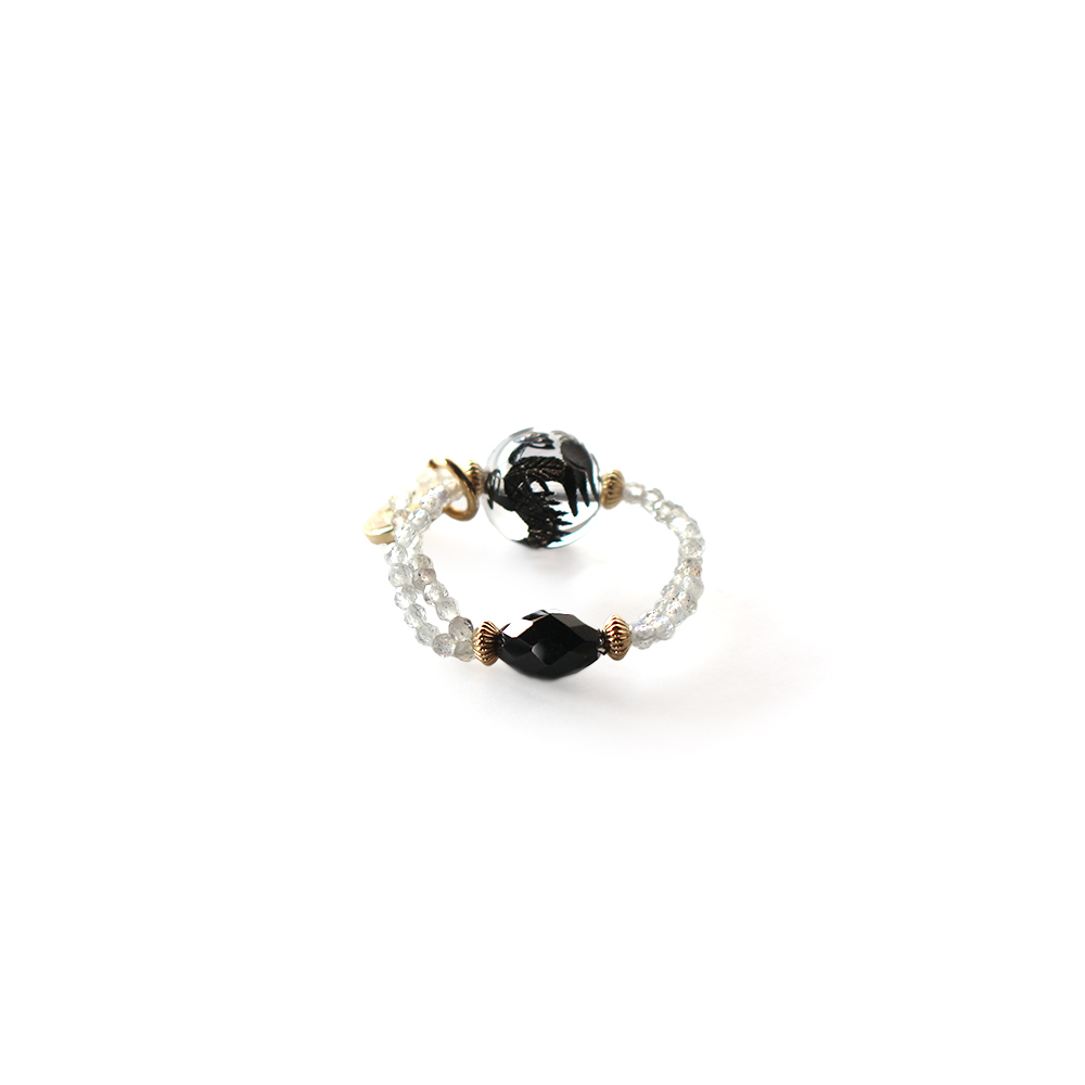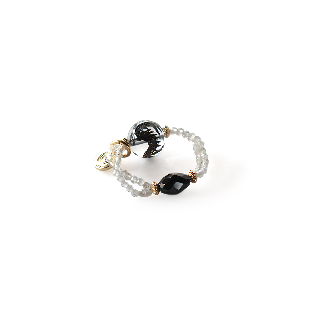 潜在能力を活性化させ、魔除けの作用を持つ万能パワーストーンとされる水晶、月と太陽の象徴。活力・潜在能力の開花を表し、直観力・洞察力を高めるとされるラブラドライト、財力・権力に恵まれ、富やチャンスを引き寄せるとされるブラックスピネルなどを組み合わせたブレスレットです。