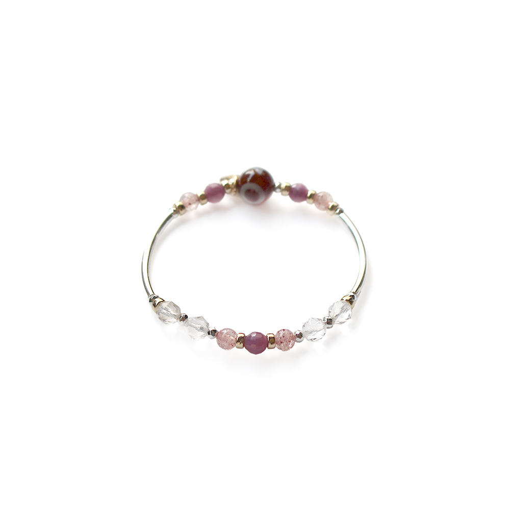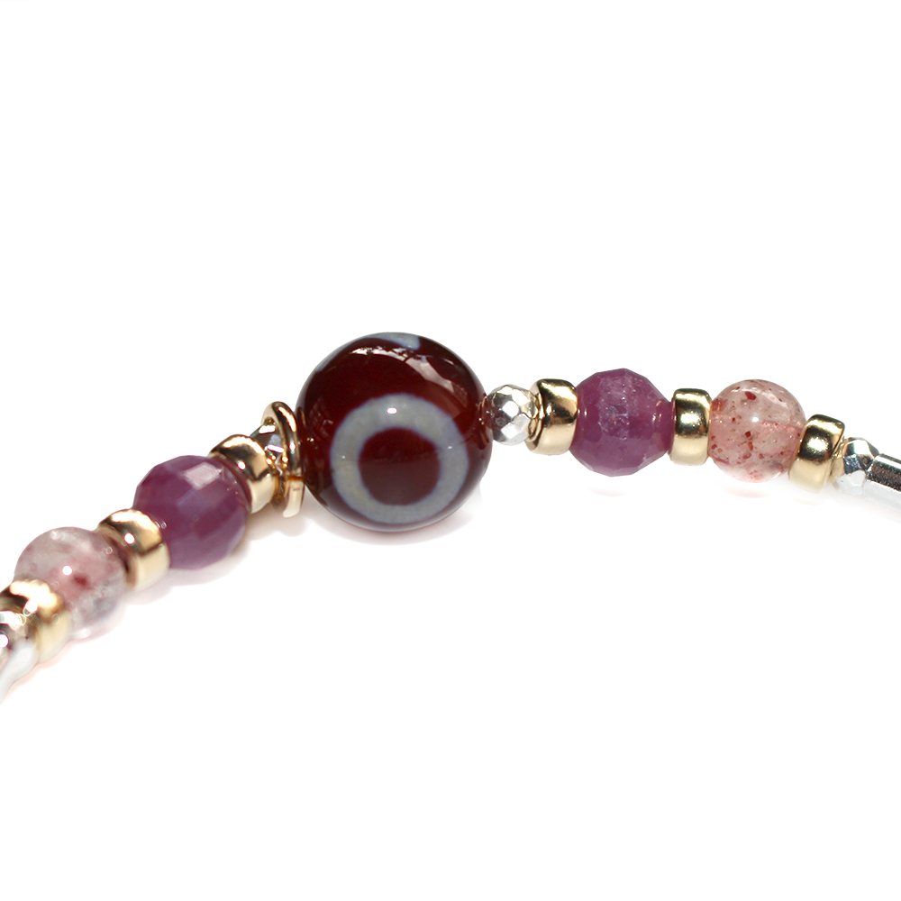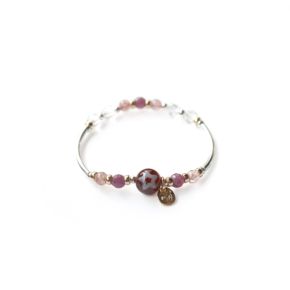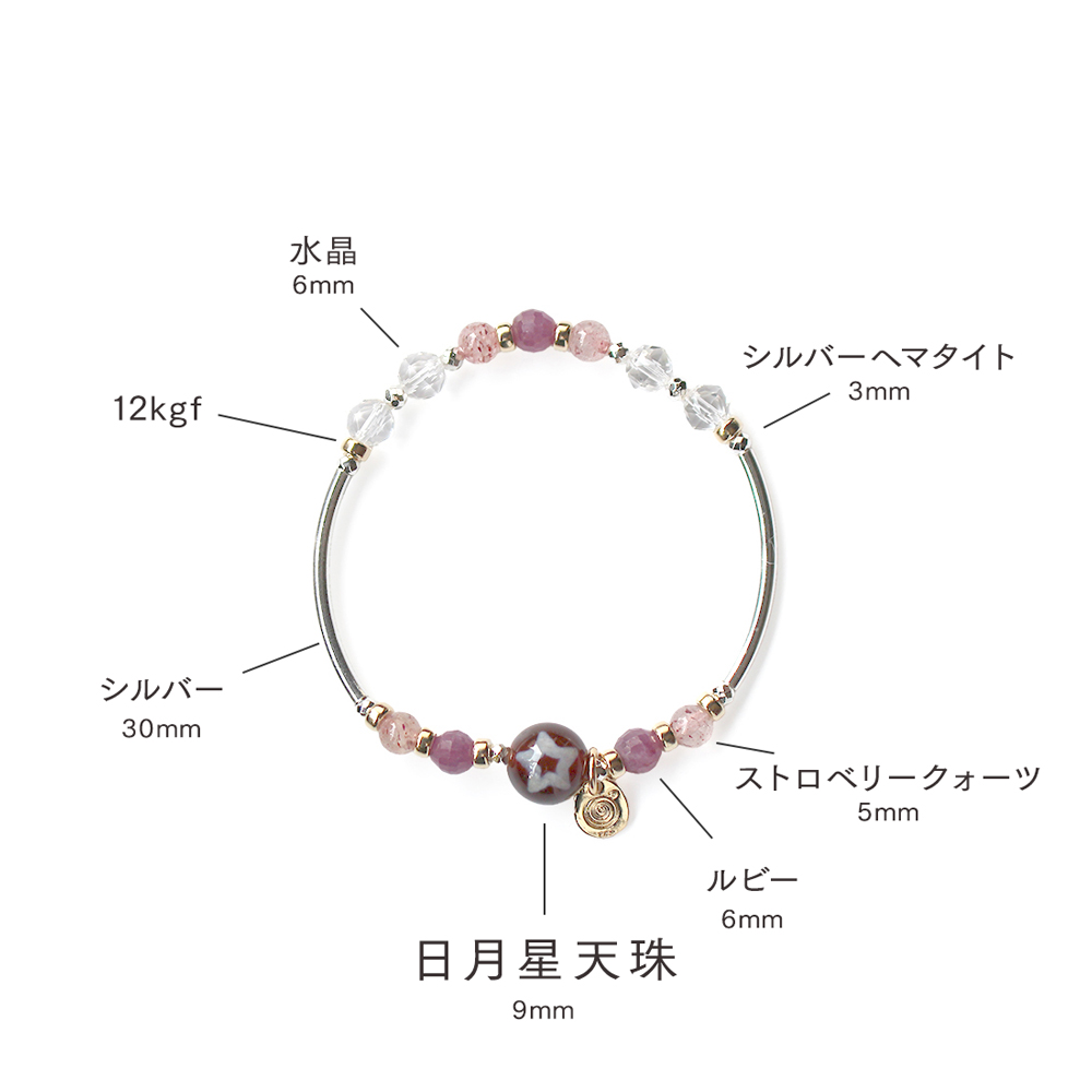 太陽(陽)、月(陰)は調和を表し恋愛成就・運勢を大上昇させ、星(宇宙)のエネルギーにより願望を叶えるといわれている日月星天珠に、勝利の石と呼ばれ、生命力アップ・魔除け・情熱や深い愛情の象徴とされるルビー、恋愛成就のお守りとされ、幸運・チャンスを運ぶ、勝利の女神が宿る石といわれているストロベリークォーツ、潜在能力を活性化させ、魔除けの作用を持つ万能パワーストーンとされる水晶などを組み合わせたブレスレットです。