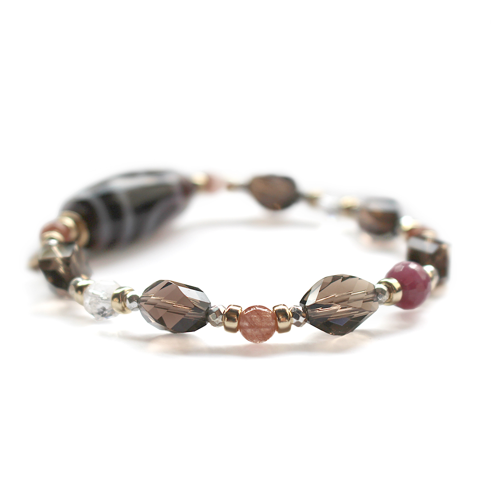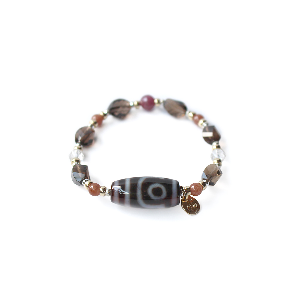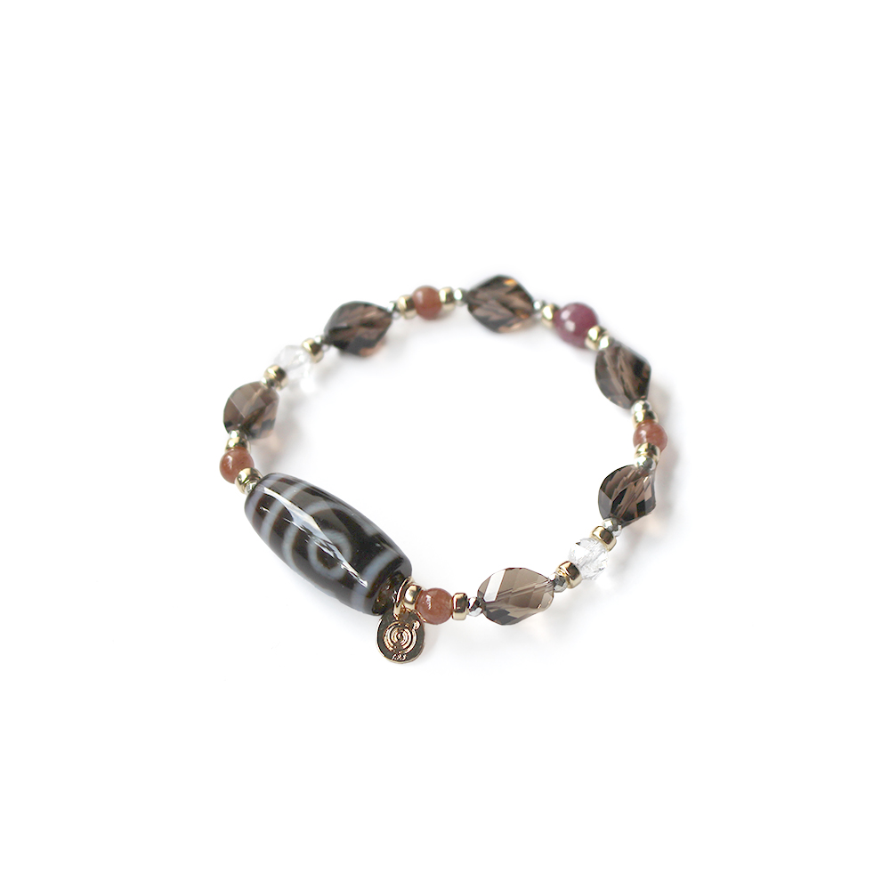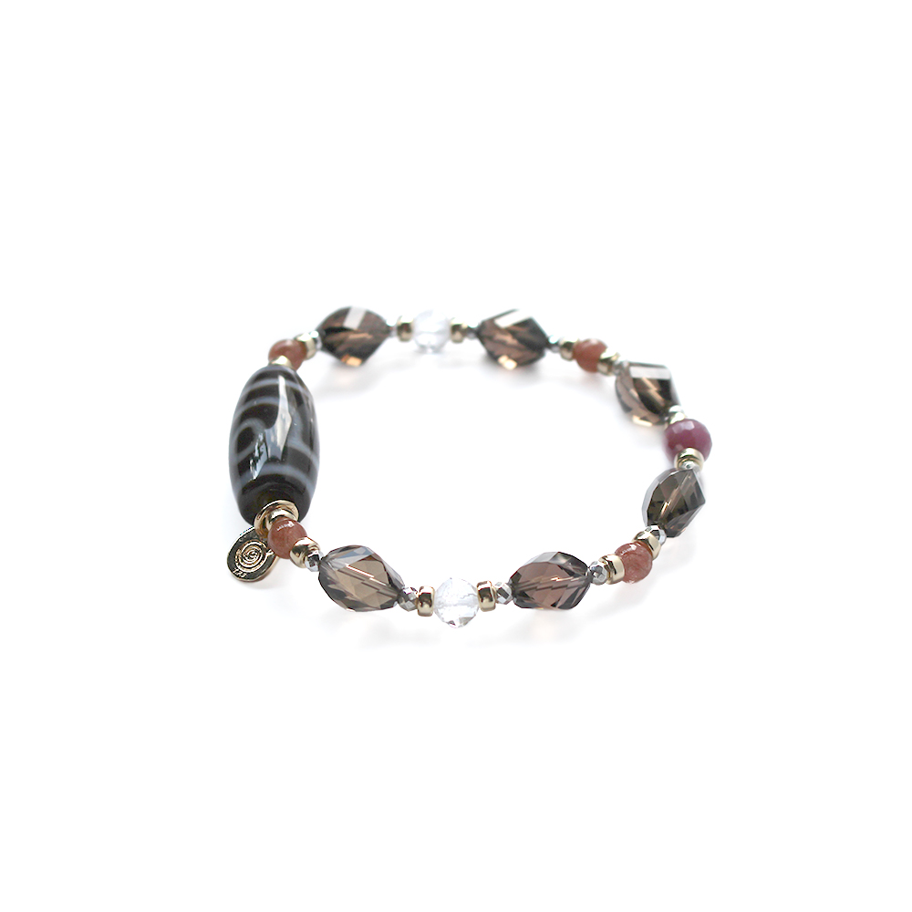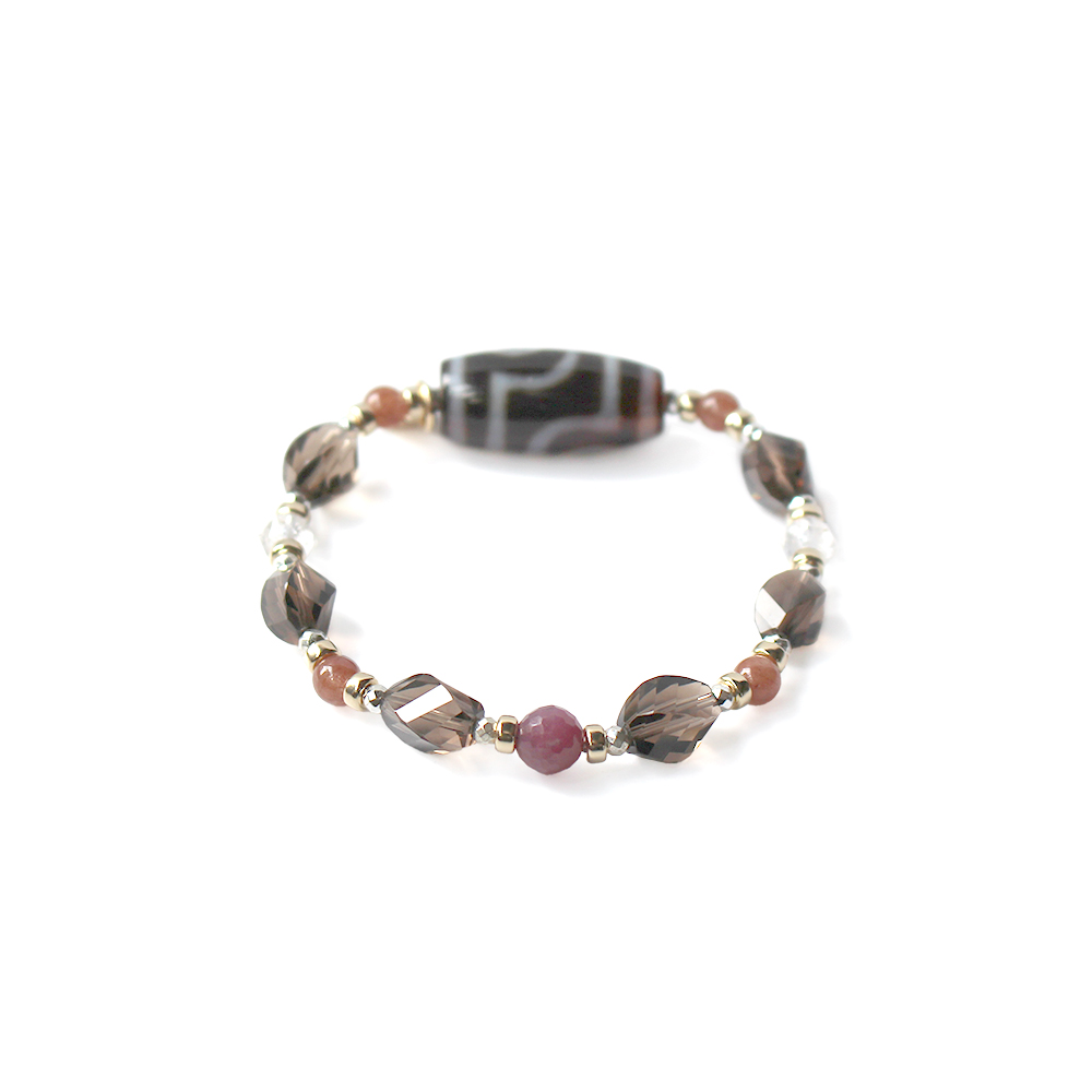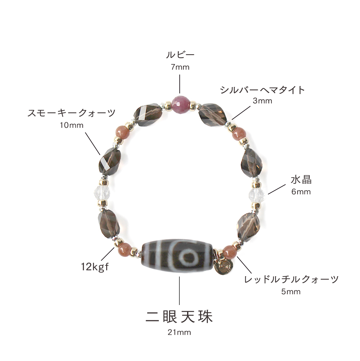 恋愛成就・夫婦円満・相互理解に力を発揮し、商売においても調和を促すといわれている二眼天珠に、勝利の石と呼ばれ、生命力アップ・魔除け・情熱や深い愛情の象徴とされるルビー、忍耐力をアップし、争いを鎮めるとされるスモーキークォーツ、潜在能力を活性化させ、魔除けの作用を持つ万能パワーストーンとされる水晶などを組み合わせたブレスレットです。