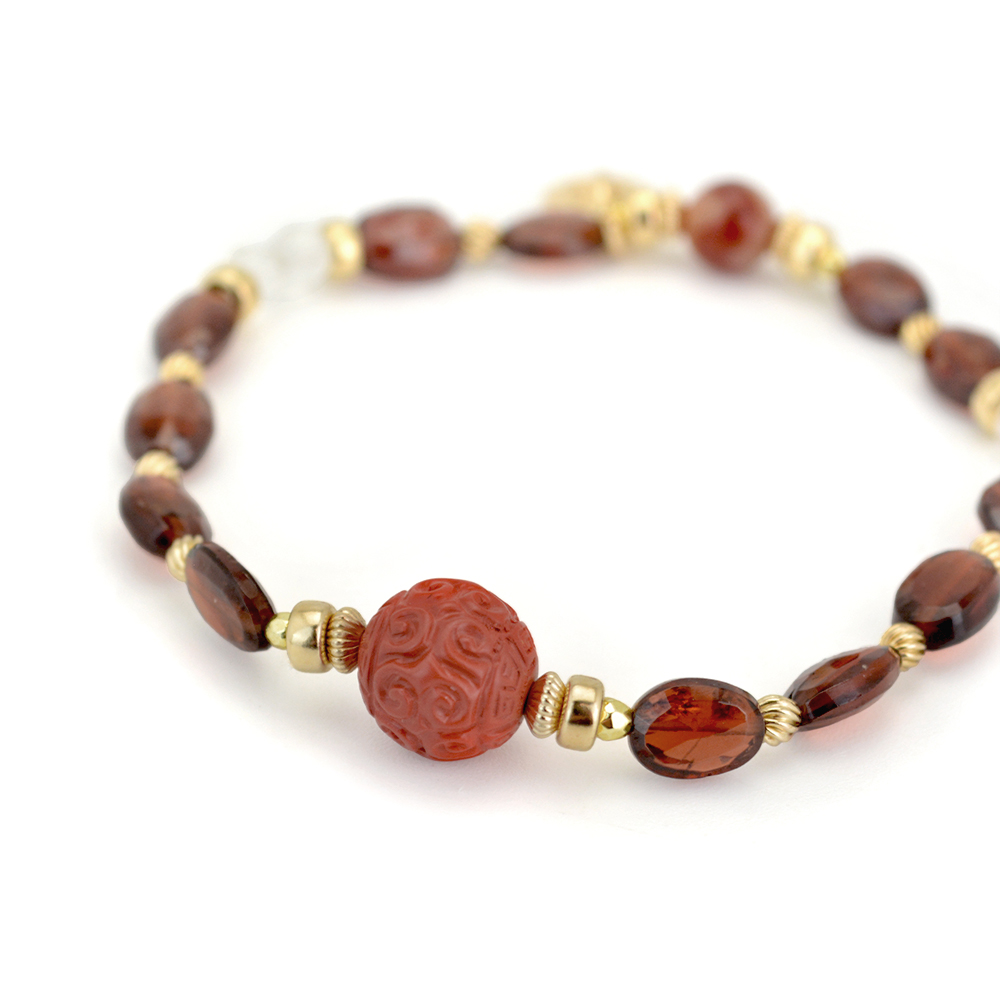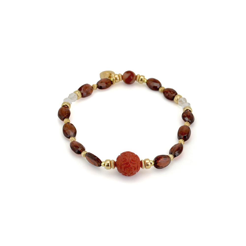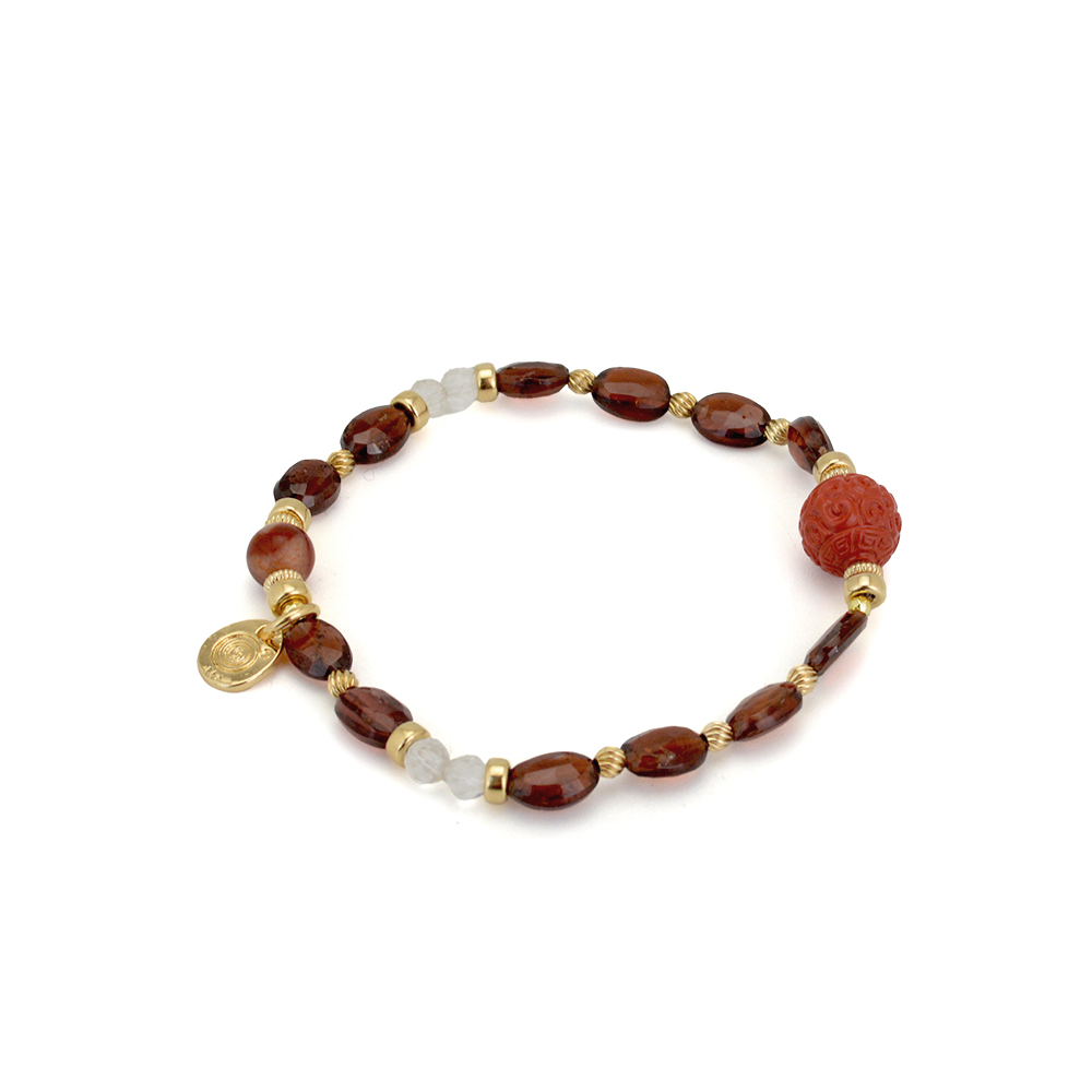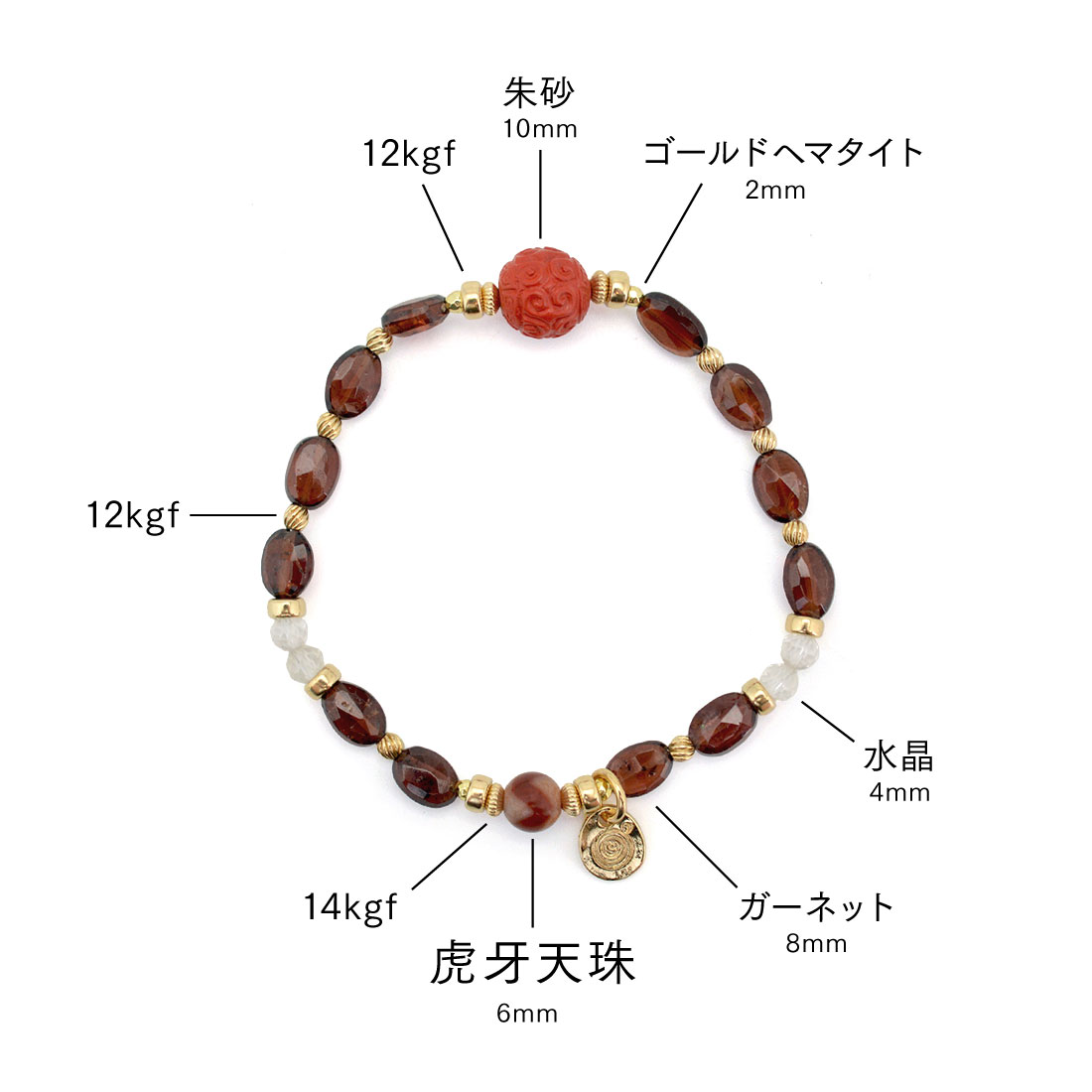 強力な魔除け。虎の勇猛なパワーで、競争に勝つ強運を身につけるといわれている虎牙天珠に、信頼と愛の石と呼ばれ、持ち主にポジティブなパワーを与え成功へと導くとされるガーネットなどを組み合わせたブレスレットです。