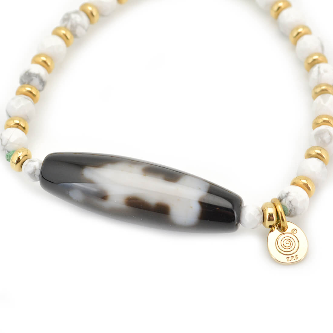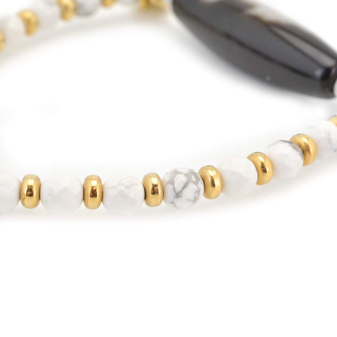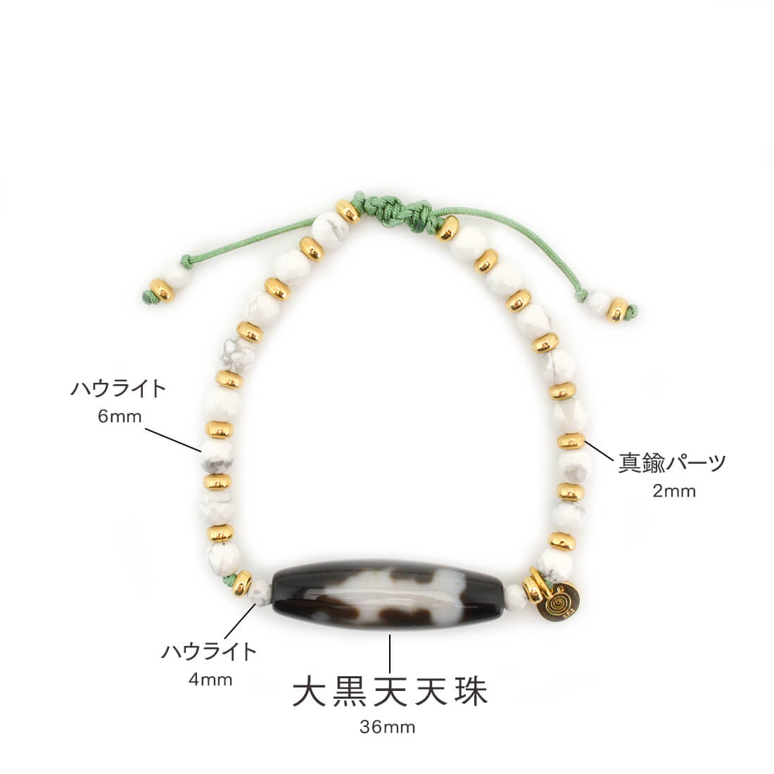 福徳や財宝を与える福の神として、あらゆる願いを叶えてくれるといわれている大黒天天珠に、純粋・無垢の象徴。感情を鎮静させ、冷静さや洞察力を取り戻すとされるハウライトなどを組み合わせたブレスレットです。