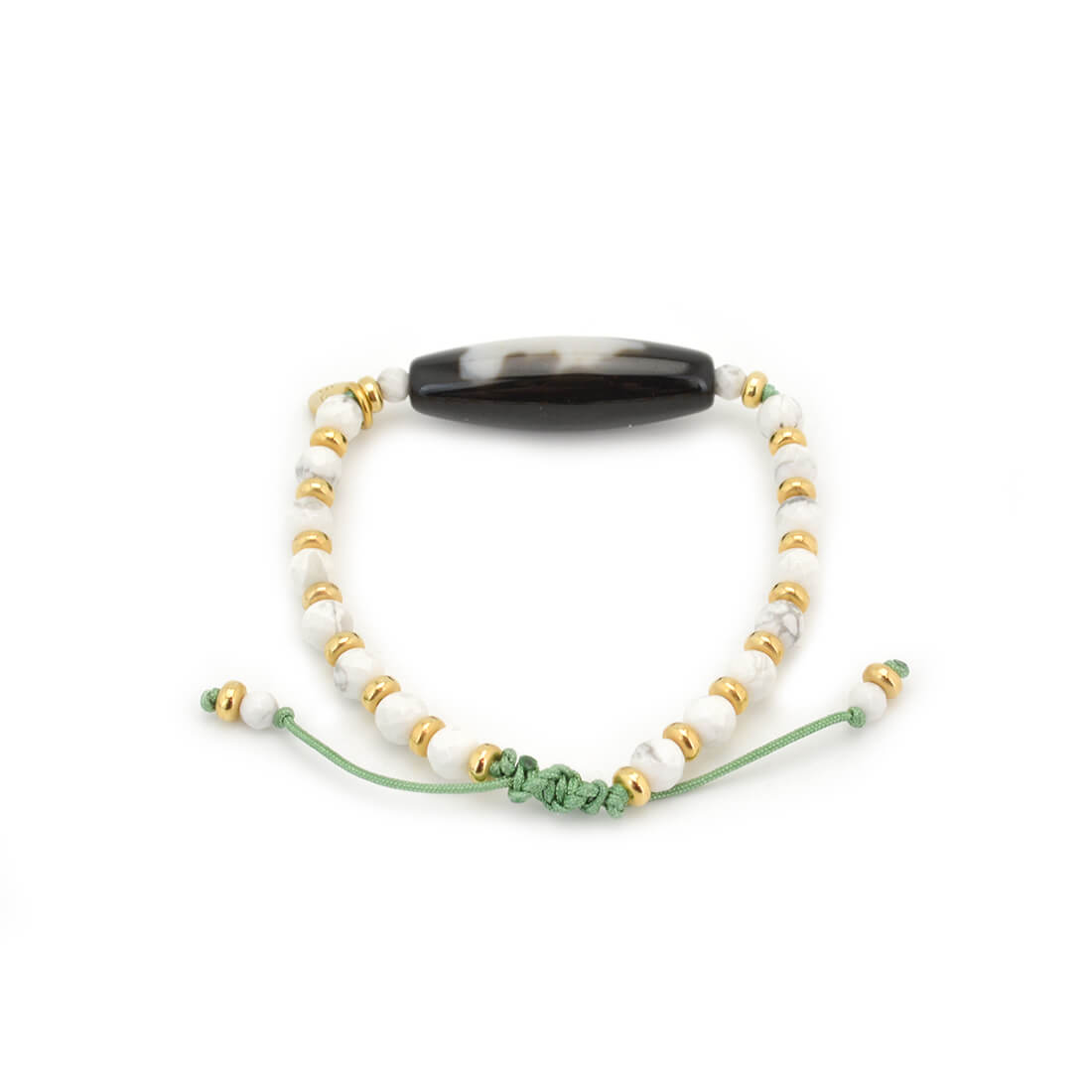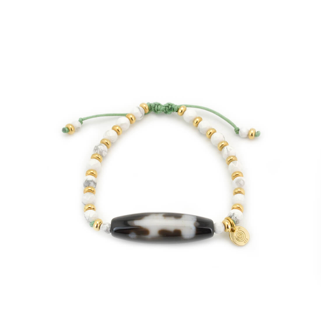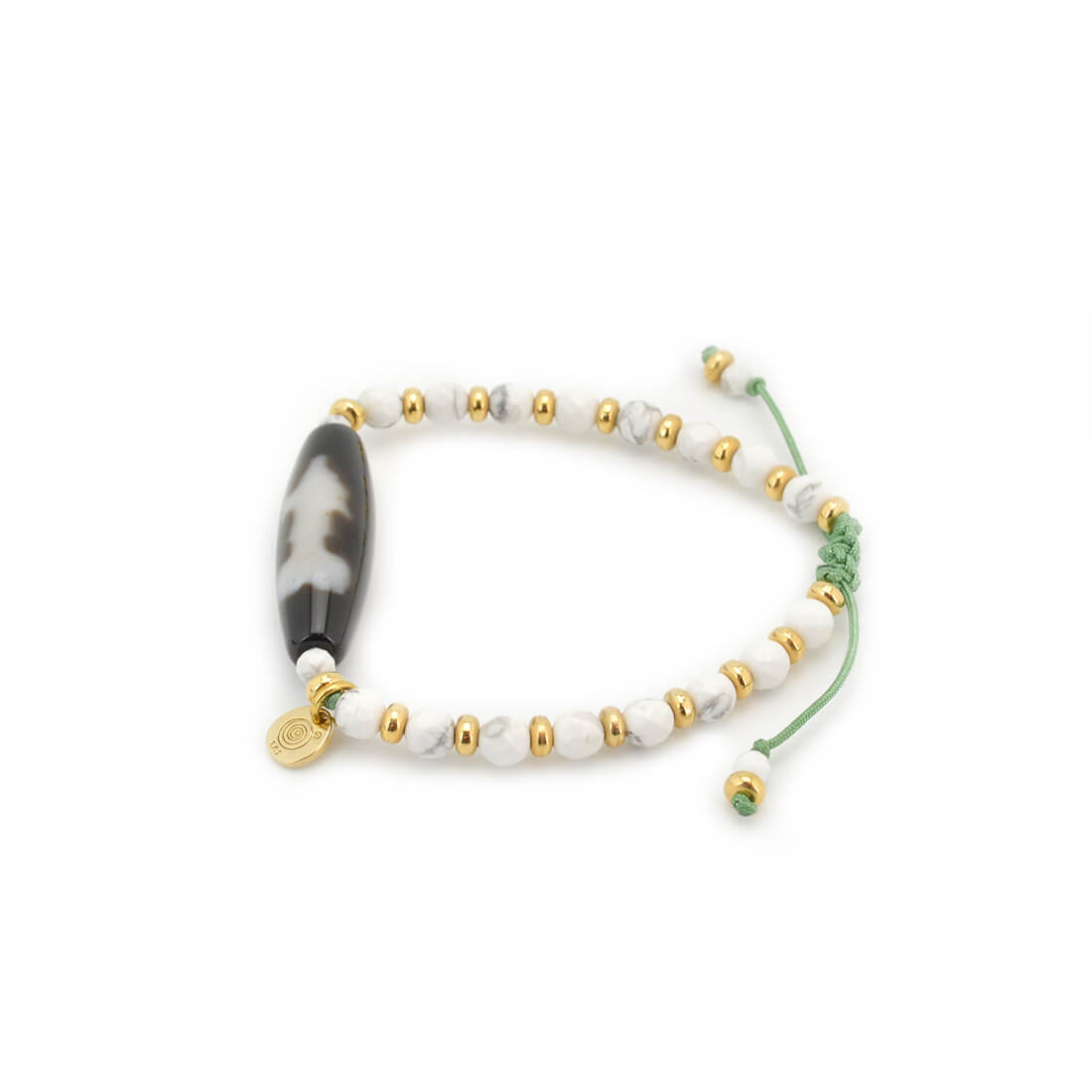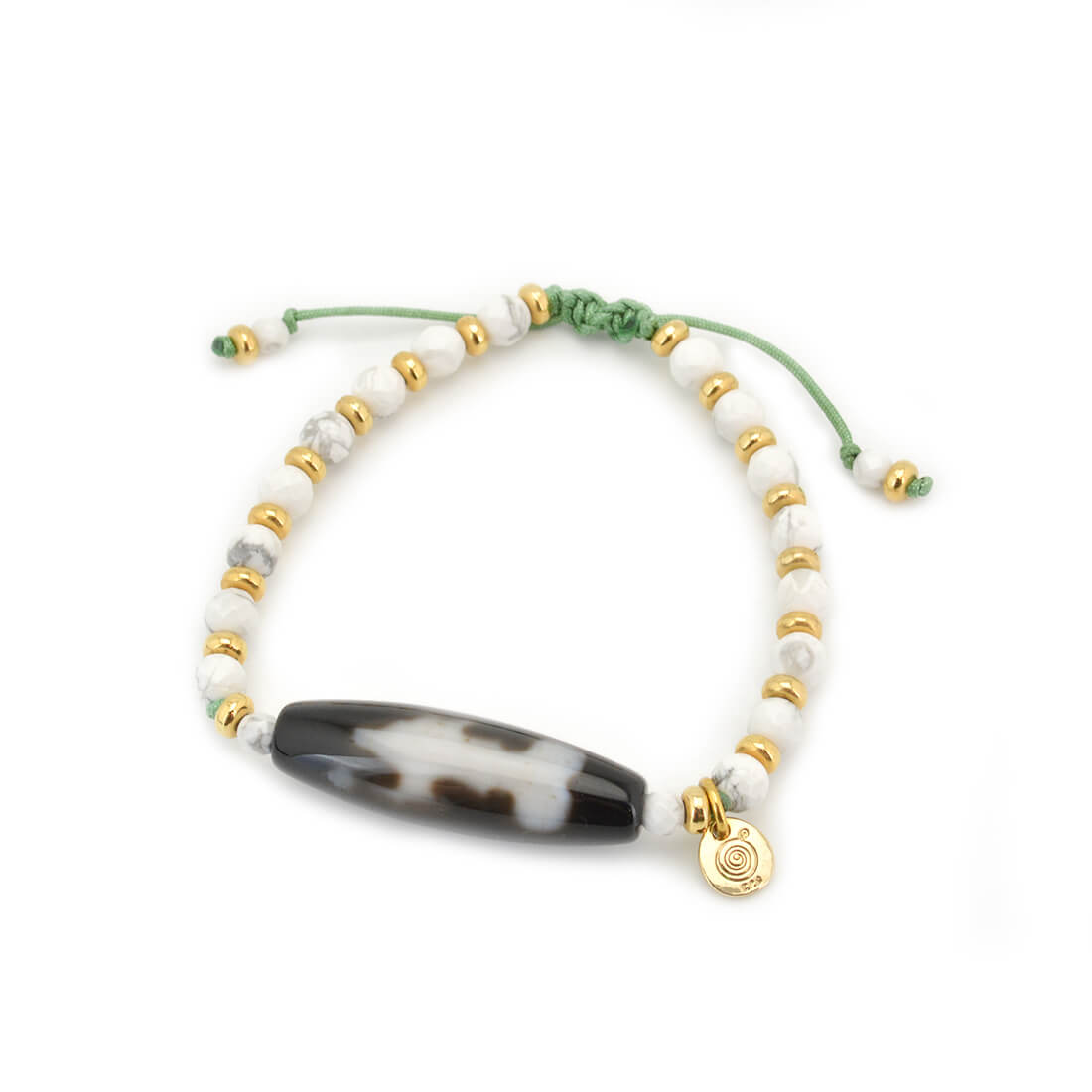 福徳や財宝を与える福の神として、あらゆる願いを叶えてくれるといわれている大黒天天珠に、純粋・無垢の象徴。感情を鎮静させ、冷静さや洞察力を取り戻すとされるハウライトなどを組み合わせたブレスレットです。