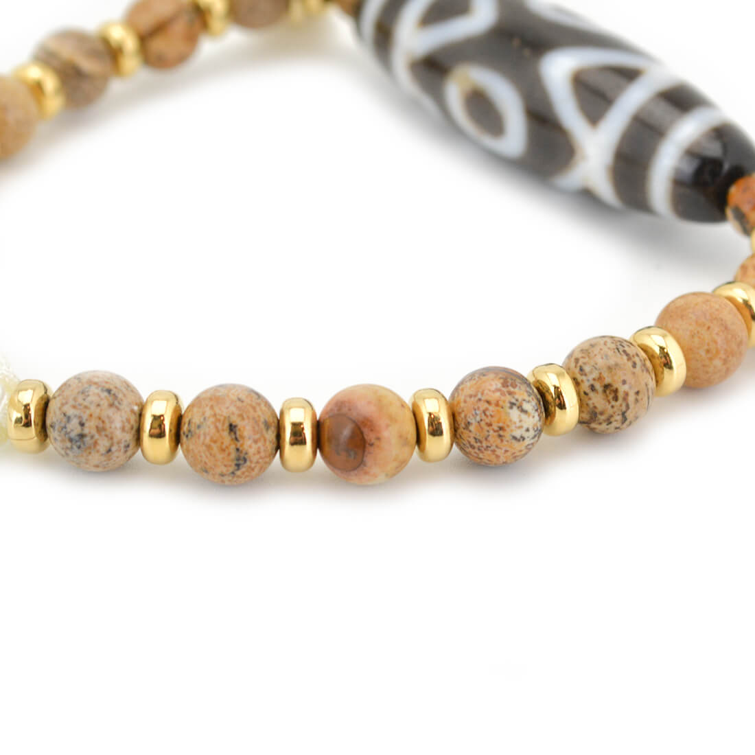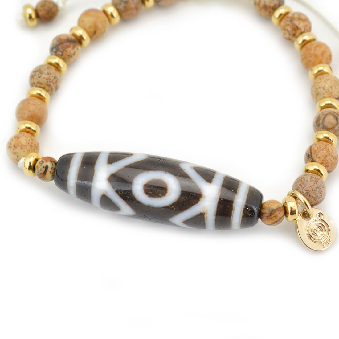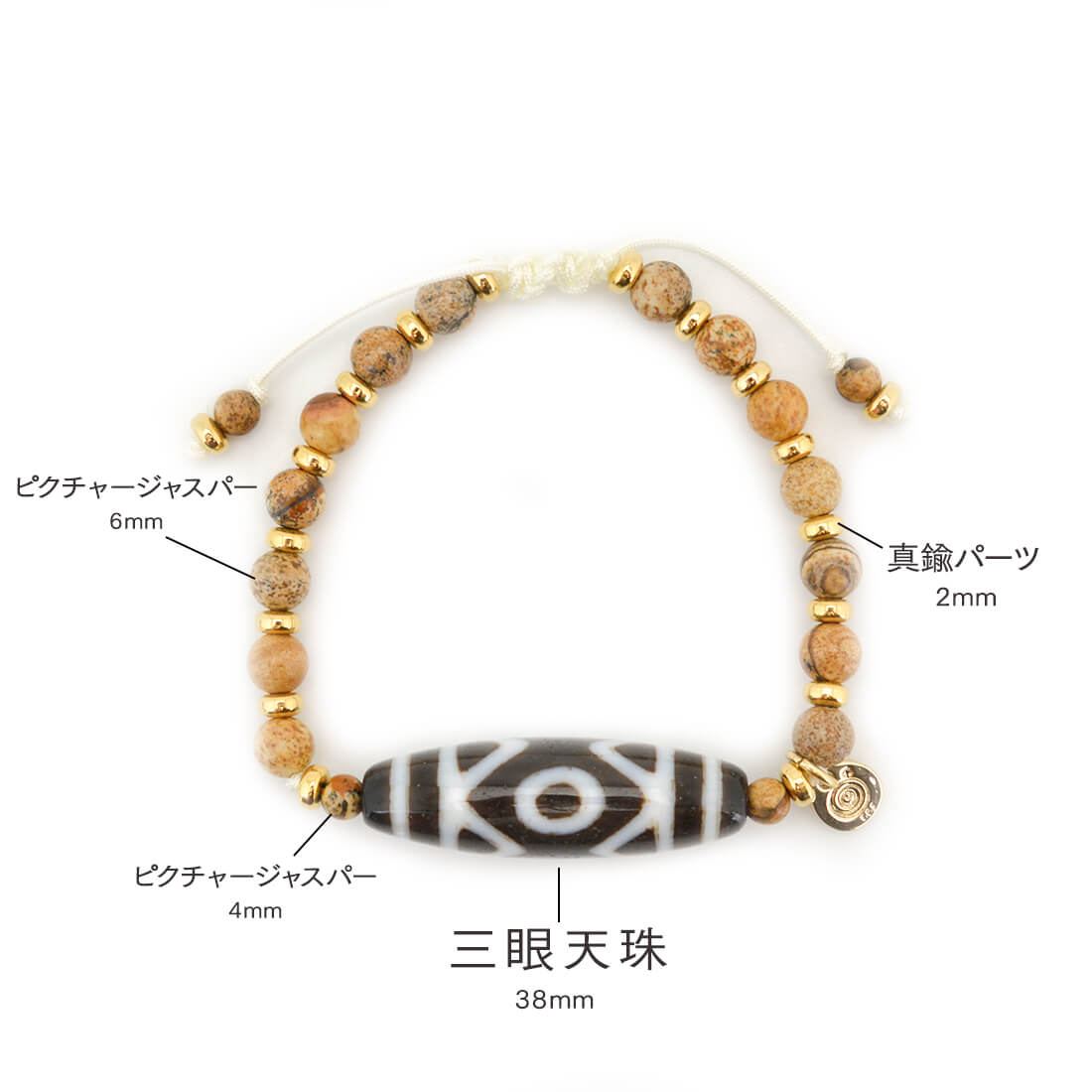 目に見えない未来を見通し、災いを未然に防ぐといわれている三眼天珠に、大きな一歩を踏み出す力をサポートし、仕事運・判断力・勝負運を高めるとされるピクチャージャスパーなどを組み合わせたブレスレットです。