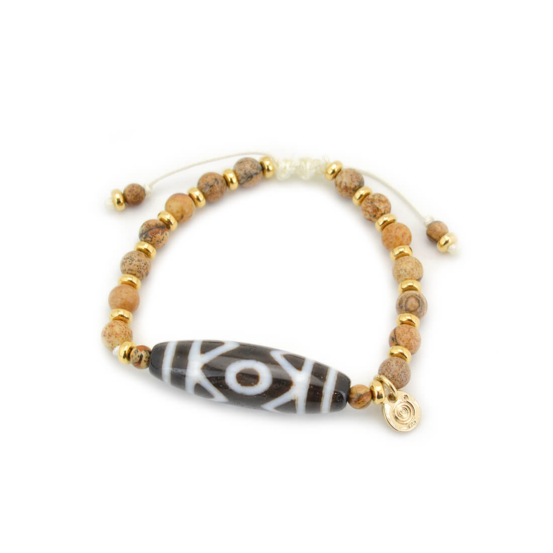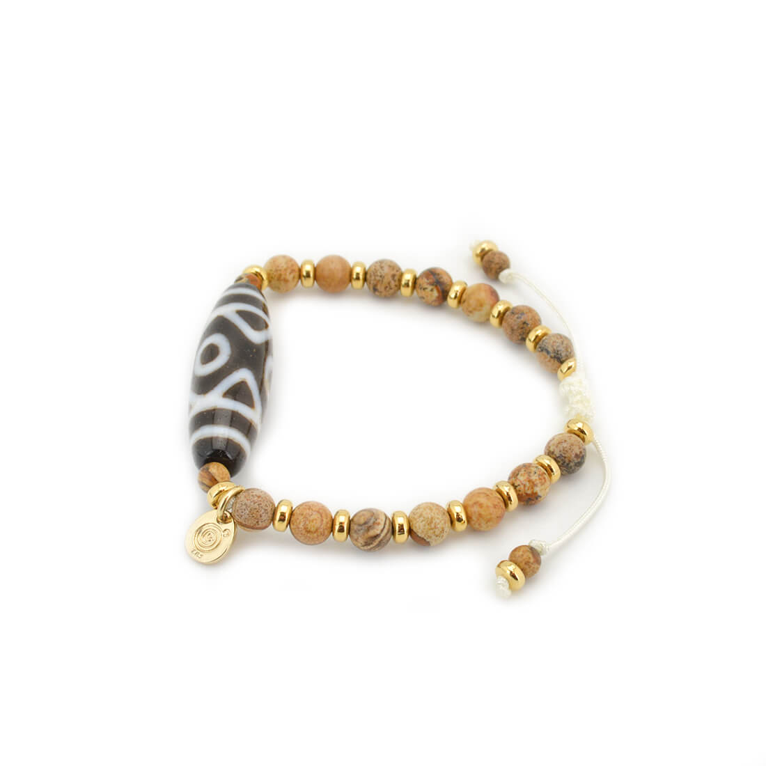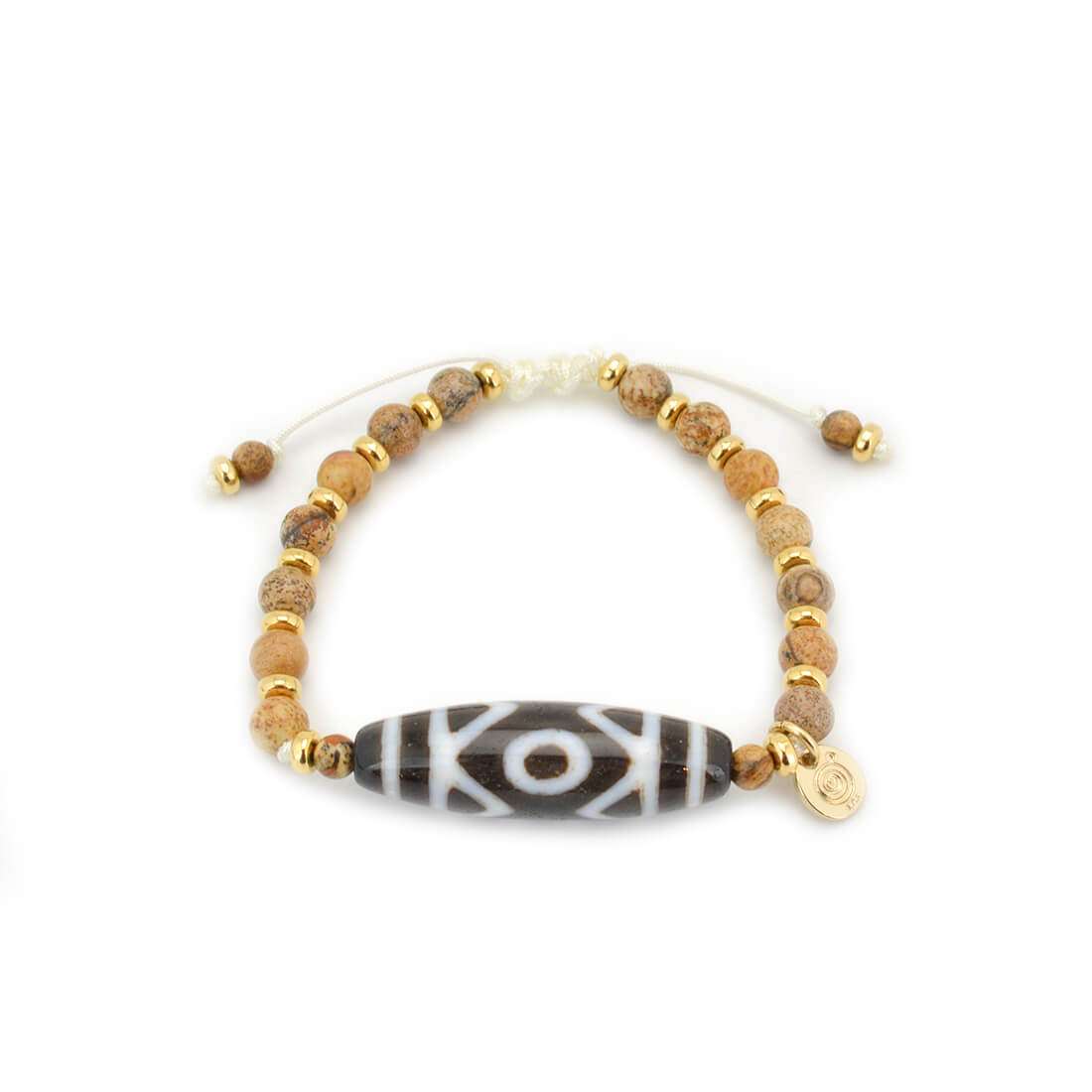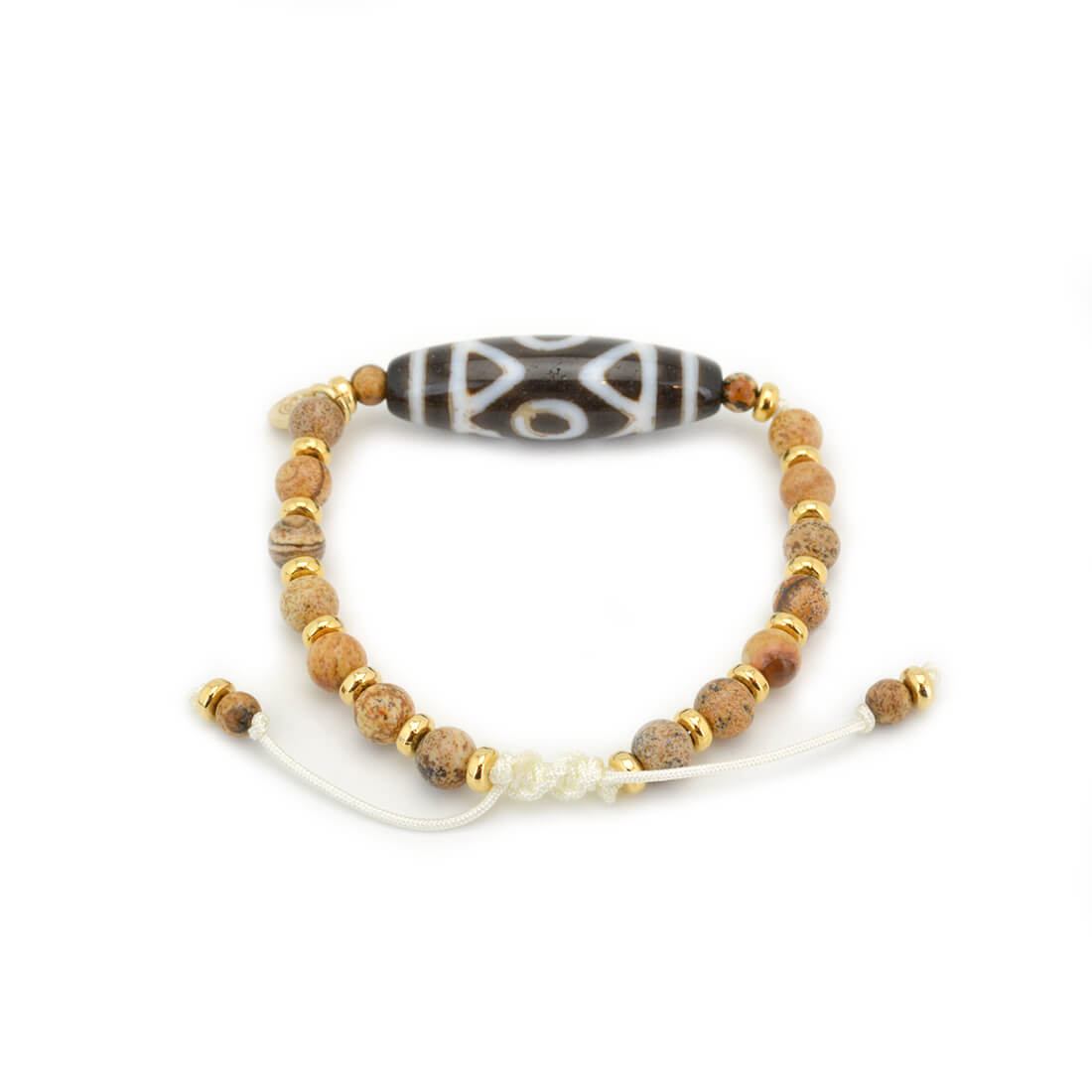 目に見えない未来を見通し、災いを未然に防ぐといわれている三眼天珠に、大きな一歩を踏み出す力をサポートし、仕事運・判断力・勝負運を高めるとされるピクチャージャスパーなどを組み合わせたブレスレットです。