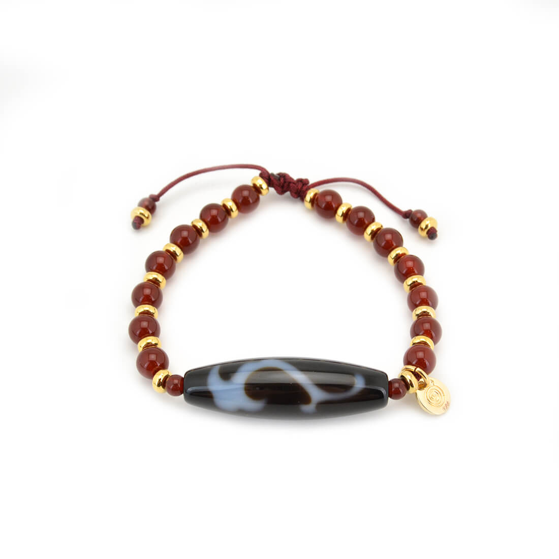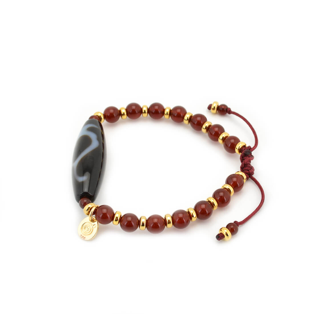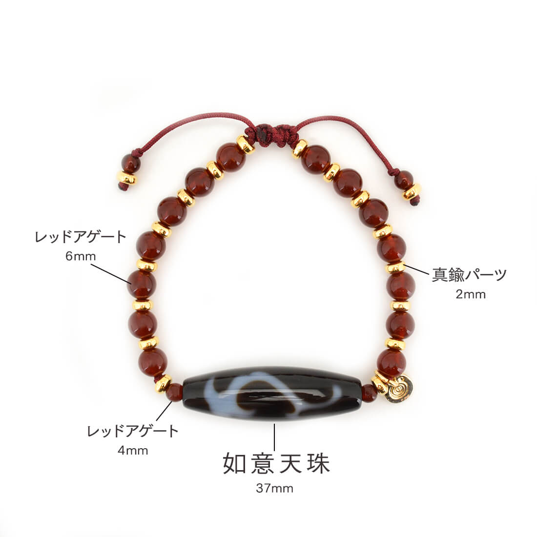 慈愛の象徴で、福財・男女和合・才能開花・積極性の向上により、意の如く事がうまく運ぶといわれている如意天珠に、家庭円満・子宝に恵まれ、情熱や積極性を呼び起こすとされるレッドアゲートなどを組み合わせたブレスレットです。