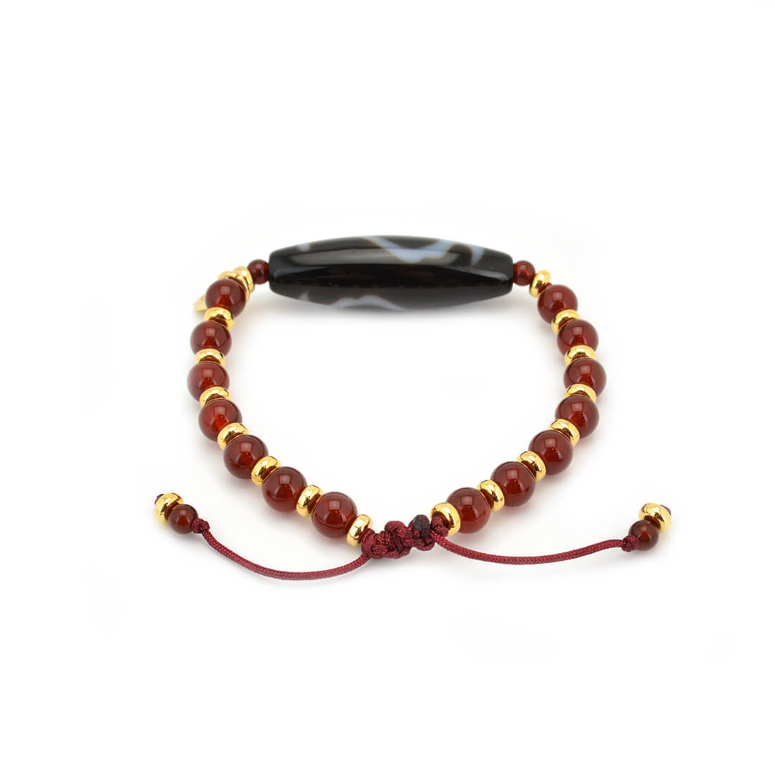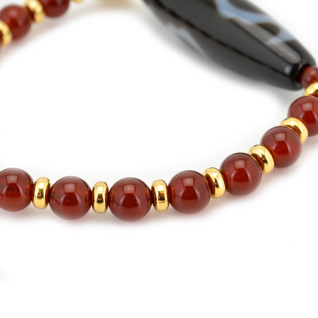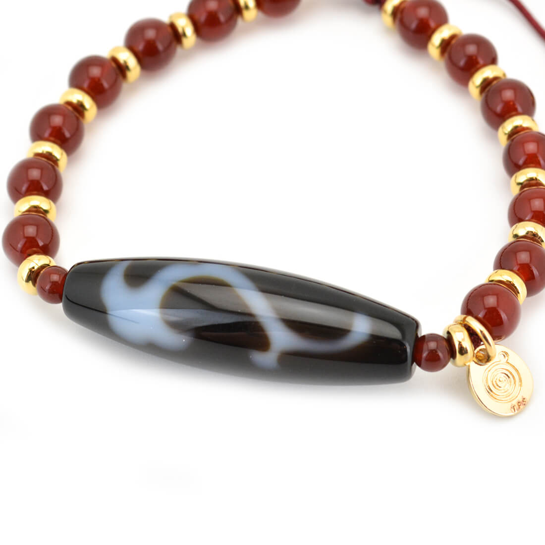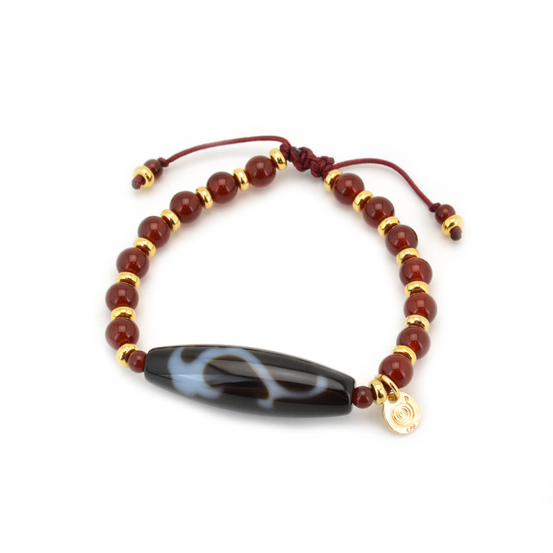 慈愛の象徴で、福財・男女和合・才能開花・積極性の向上により、意の如く事がうまく運ぶといわれている如意天珠に、家庭円満・子宝に恵まれ、情熱や積極性を呼び起こすとされるレッドアゲートなどを組み合わせたブレスレットです。