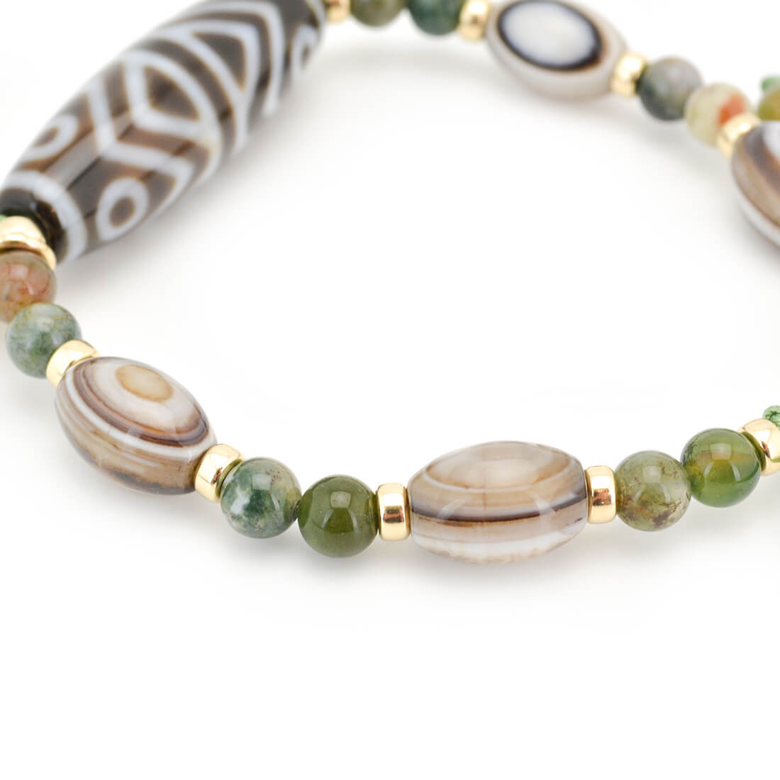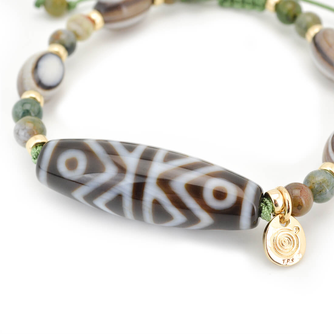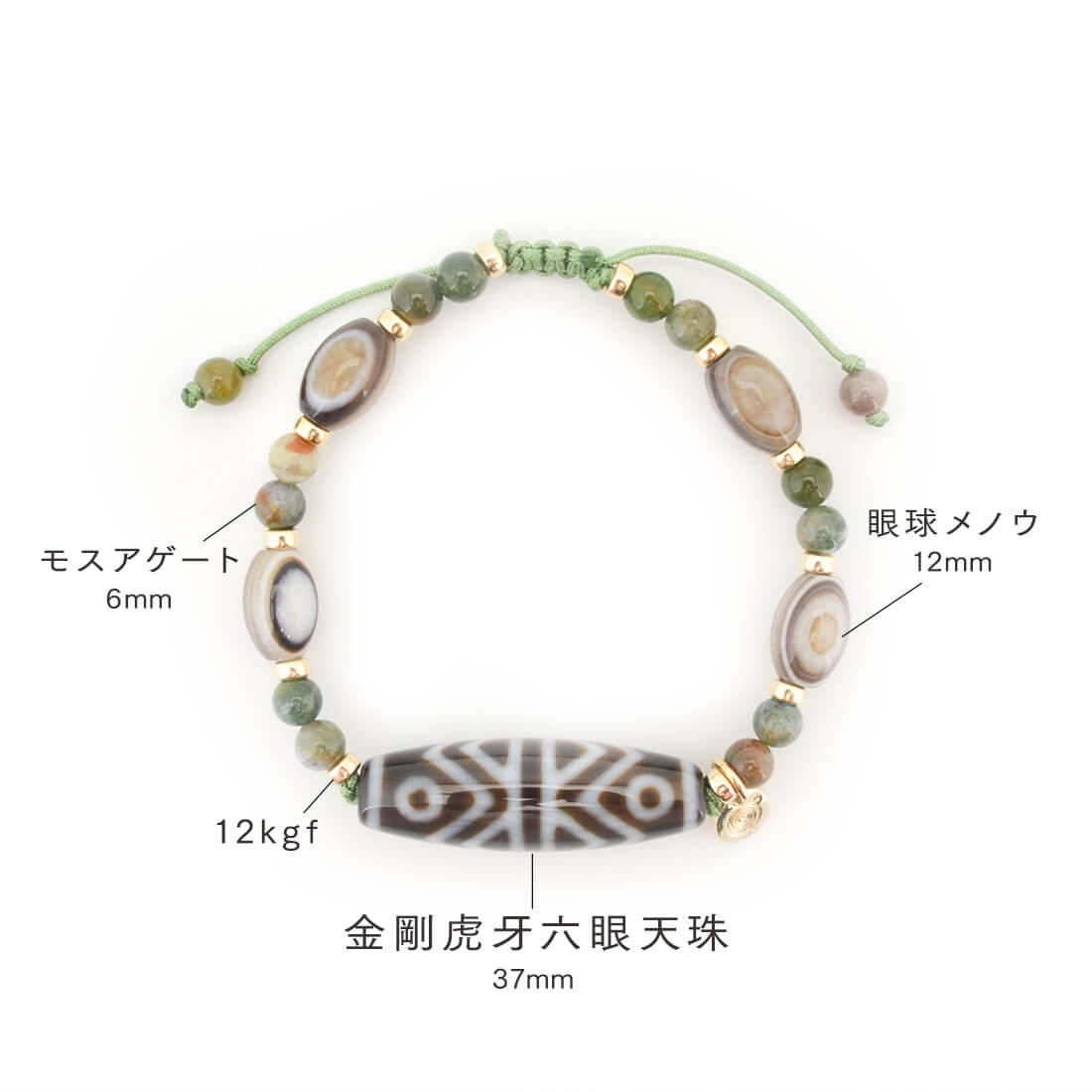 吉運を集め、凶運を避けるとされ、事業運向上・増収増益・物事が順調に進むといわれている金剛虎牙六眼天珠に、最強の魔除けとされる、神の眼を持つ石とされ先を見通す力を持つといわれている眼球メノウなどを組み合わせたブレスレットです。