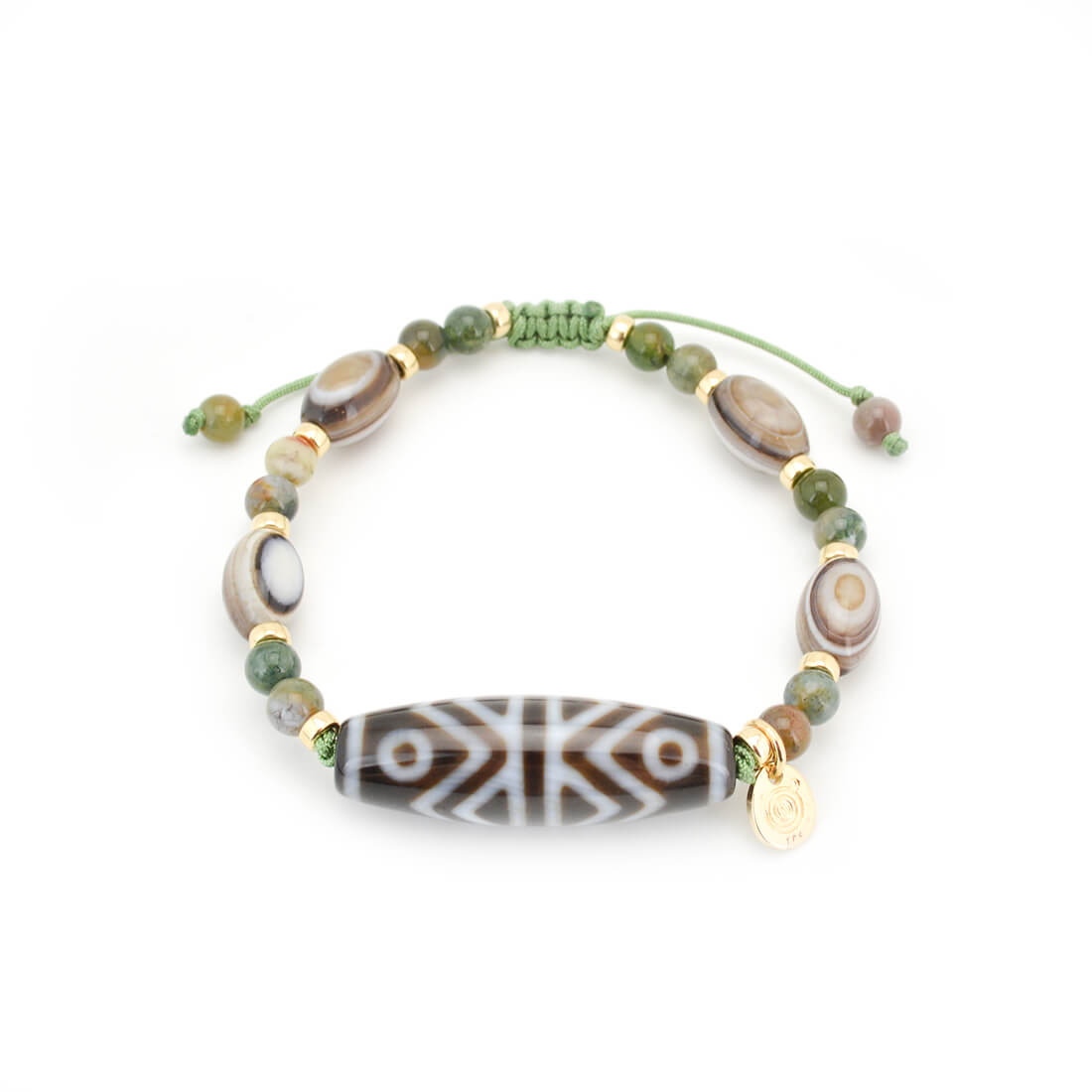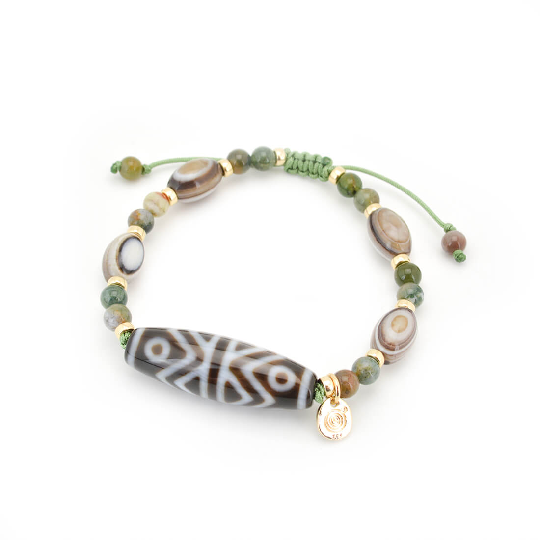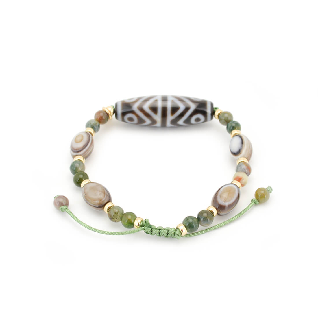 吉運を集め、凶運を避けるとされ、事業運向上・増収増益・物事が順調に進むといわれている金剛虎牙六眼天珠に、最強の魔除けとされる、神の眼を持つ石とされ先を見通す力を持つといわれている眼球メノウなどを組み合わせたブレスレットです。