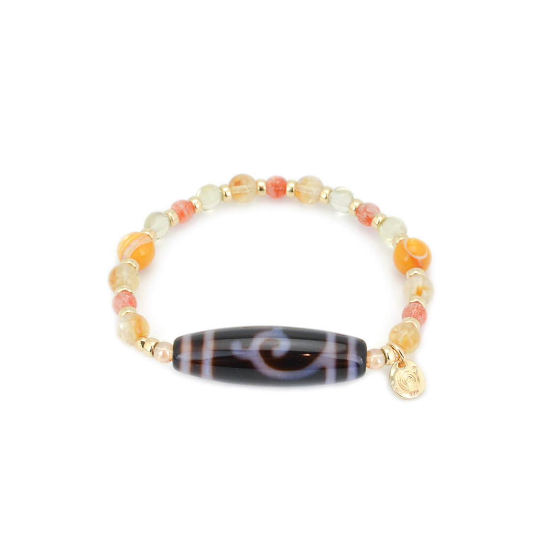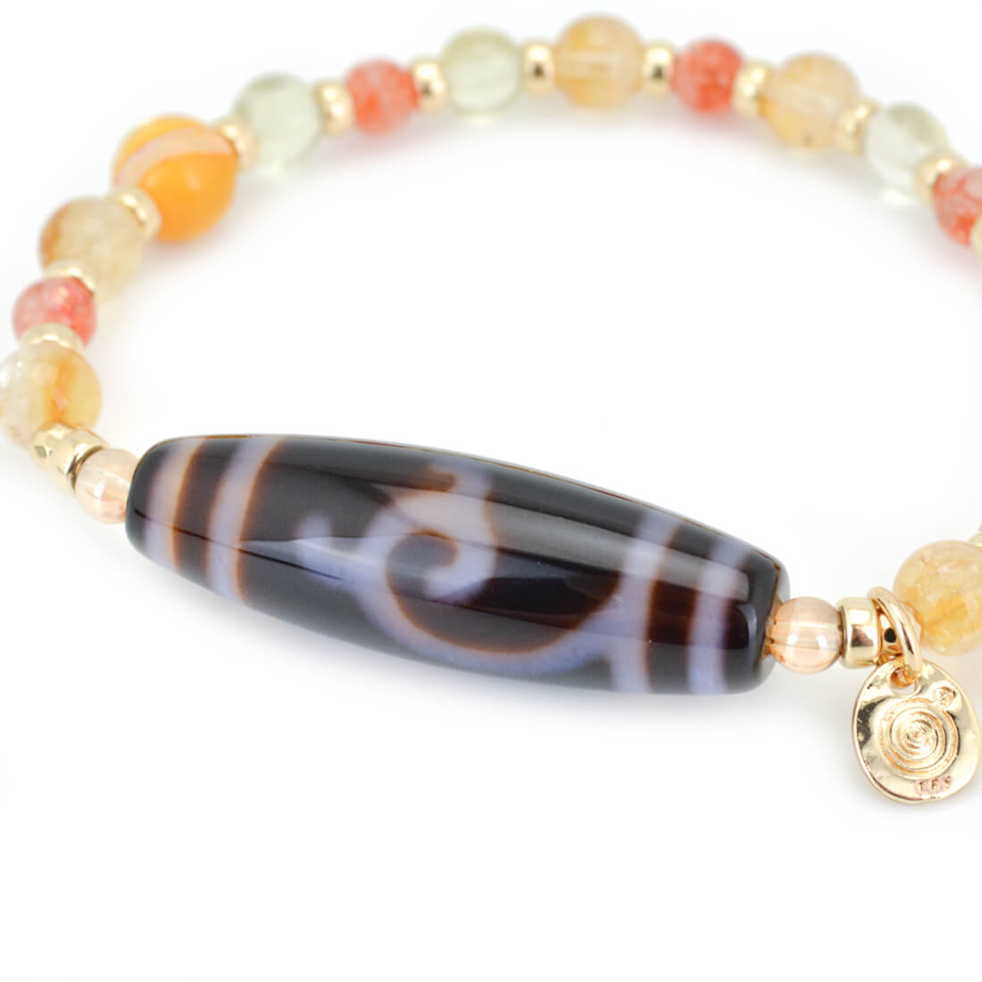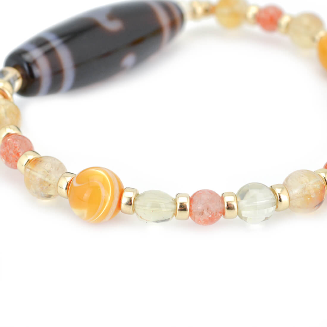 厄難を消除し運気を上げ、福を招き、願いをことごとく叶えてくれる稀少な天珠といわれている緑度母天珠に、太陽を象徴する石とされ、商売繁盛・事業成功・金運・財運・貯蓄運アップによいといわれているシトリンなどを組み合わせたブレスレットです。