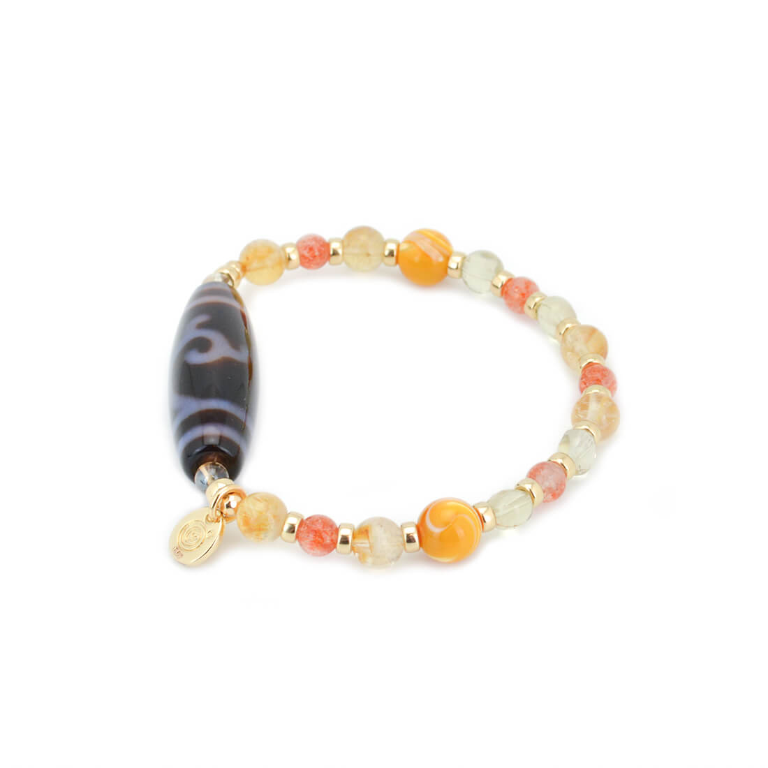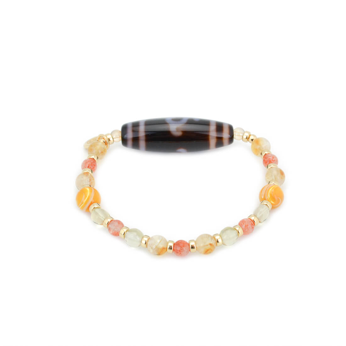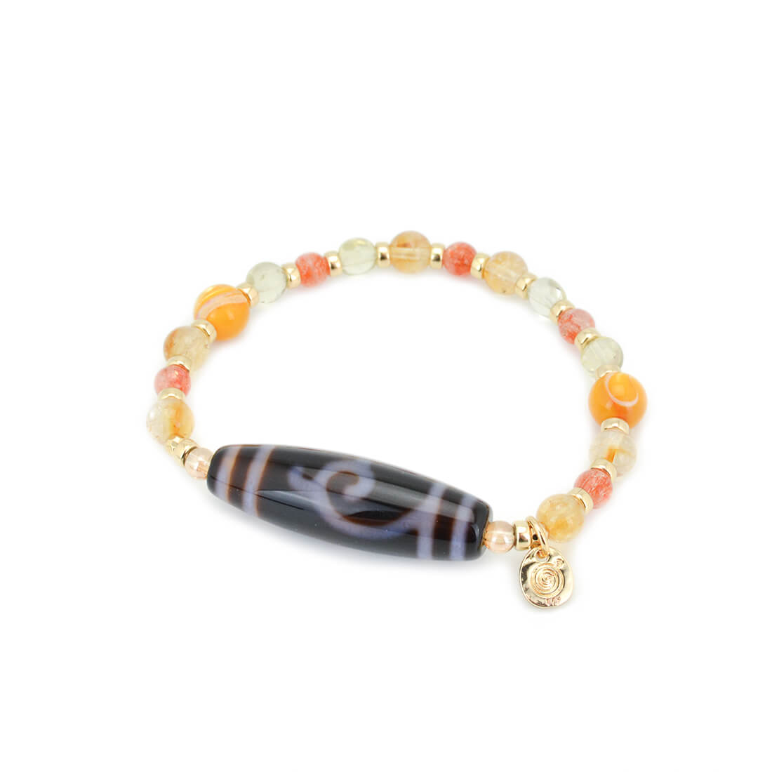 厄難を消除し運気を上げ、福を招き、願いをことごとく叶えてくれる稀少な天珠といわれている緑度母天珠に、太陽を象徴する石とされ、商売繁盛・事業成功・金運・財運・貯蓄運アップによいといわれているシトリンなどを組み合わせたブレスレットです。