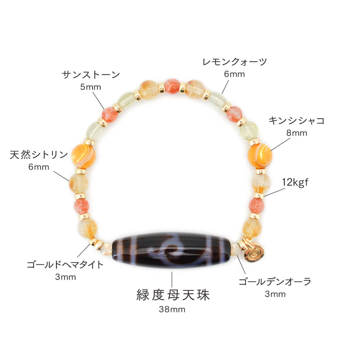 サンストーン+キンシシャコ+天然シトリン+ゴールデンオーラ+レモンクォーツ+ゴールドヘマタイト+12KGF+オリジナルメダルチャーム